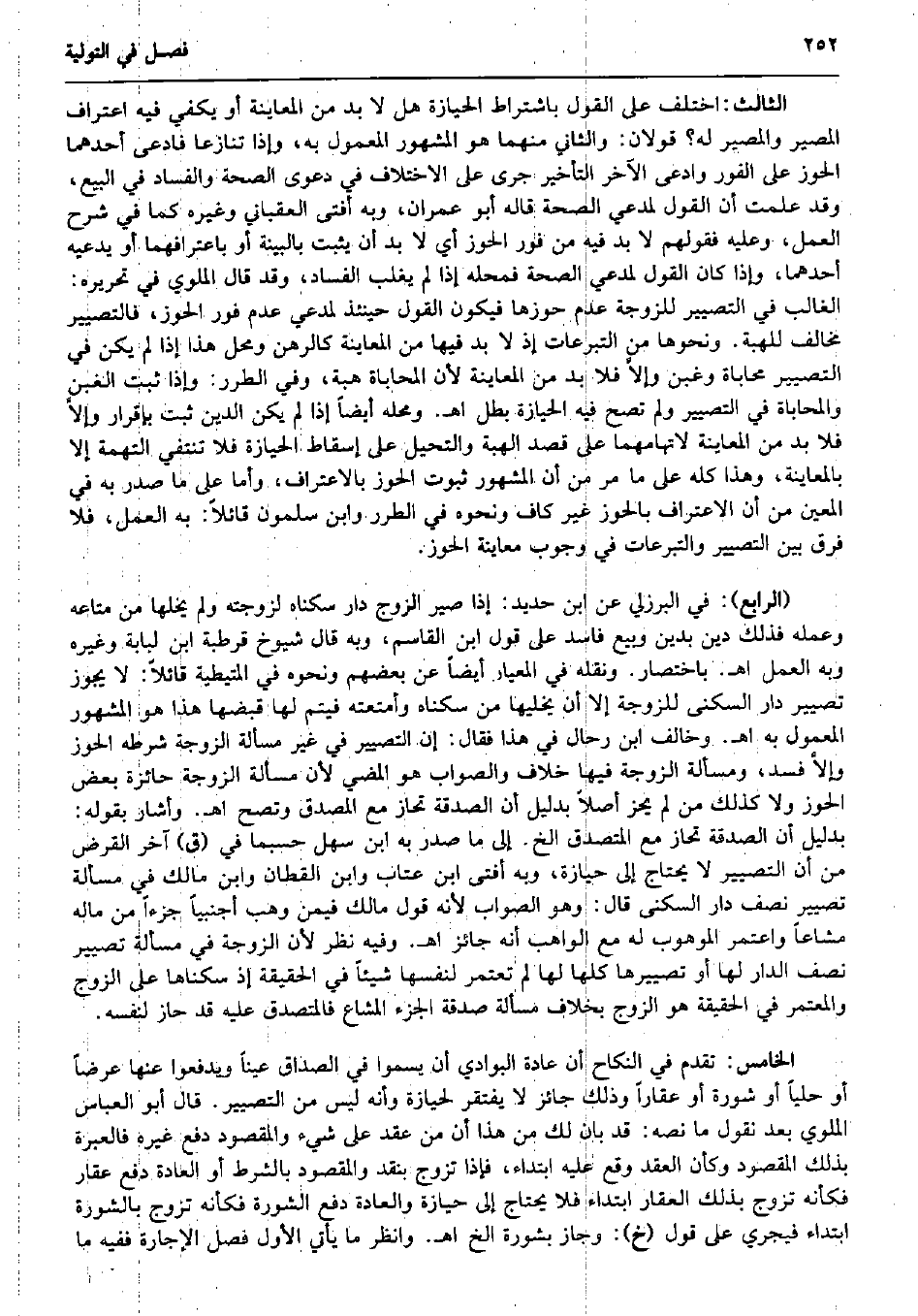 الثَّالِث: اخْتلف على القَوْل بِاشْتِرَاط الْحِيَازَة هَل لَا بُد من المعاينة أَو يَكْفِي فِيهِ اعْتِرَاف الْمصير والمصير لَهُ؟ قَولَانِ: وَالثَّانِي مِنْهُمَا هُوَ الْمَشْهُور الْمَعْمُول بِهِ، وَإِذا تنَازعا فَادّعى أَحدهمَا الْحَوْز على الْفَوْر وَادّعى الآخر التَّأْخِير جرى على الِاخْتِلَاف فِي دَعْوَى الصِّحَّة وَالْفساد فِي البيع، وَقد علمت أَن القَوْل لمُدعِي الصِّحَّة قَالَه أَبُو عمرَان، وَبِه أفتى العقباني وَغَيره كَمَا فِي شرح الْعَمَل، وَعَلِيهِ فَقَوْلهم لَا بُد فِيهِ من فَور الْحَوْز أَي لَا بُد أَن يثبت بِالْبَيِّنَةِ أَو باعترافهما أَو يَدعِيهِ أَحدهمَا، وَإِذا كَانَ القَوْل لمُدعِي الصِّحَّة فمحله إِذا لم يغلب الْفساد، وَقد قَالَ الملوي فِي تحريره: الْغَالِب فِي التصيير للزَّوْجَة عدم حوزها فَيكون القَوْل حِينَئِذٍ لمُدعِي عدم فَور الْحَوْز، فالتصيير مُخَالف للهبة. وَنَحْوهَا من التَّبَرُّعَات إِذْ لَا بُد فِيهَا من المعاينة كَالرَّهْنِ وَمحل هَذَا إِذا لم يكن فِي التصيير مُحَابَاة وغبن وإلاَّ فَلَا بُد من المعاينة لِأَن الْمُحَابَاة هبة، وَفِي الطرر: وَإِذا ثَبت الْغبن والمحاباة فِي التصيير وَلم تصح فِيهِ الْحِيَازَة بَطل اه. وَمحله أَيْضا إِذا لم يكن الدّين ثَبت بِإِقْرَار وإلاَّ فَلَا بُد من المعاينة لاتهامهما على قصد الْهِبَة والتحيل على إِسْقَاط الْحِيَازَة فَلَا تَنْتفِي التُّهْمَة إِلَّا بالمعاينة، وَهَذَا كُله على مَا مر من أَن الْمَشْهُور ثُبُوت الْحَوْز بالاعتراف، وَأما على مَا صدر بِهِ فِي الْمعِين من أَن الِاعْتِرَاف بالحوز غير كَاف وَنَحْوه فِي الطرر وَابْن سَلمُون قَائِلا: بِهِ الْعَمَل، فَلَا فرق بَين التصيير والتبرعات فِي وجوب مُعَاينَة الْحَوْز. (الرَّابِع) : فِي الْبُرْزُليّ عَن ابْن حَدِيد: إِذا صير الزَّوْج دَار سكناهُ لزوجته وَلم يخلها من مَتَاعه وَعَمله فَذَلِك دين بدين وَبيع فَاسد على قَول ابْن الْقَاسِم، وَبِه قَالَ شُيُوخ قرطبة ابْن لبَابَة وَغَيره وَبِه الْعَمَل اه. بِاخْتِصَار. وَنَقله فِي المعيار أَيْضا عَن بَعضهم وَنَحْوه فِي الْمُتَيْطِيَّة قَائِلا: لَا يجوز تصيير دَار السُّكْنَى للزَّوْجَة إِلَّا أَن يخليها من سكناهُ وأمتعته فَيتم لَهَا قبضهَا هَذَا هُوَ الْمَشْهُور الْمَعْمُول بِهِ اه. وَخَالف ابْن رحال فِي هَذَا فَقَالَ: إِن التصيير فِي غير مَسْأَلَة الزَّوْجَة شَرطه الْحَوْز وإلاَّ فسد، وَمَسْأَلَة الزَّوْجَة فِيهَا خلاف وَالصَّوَاب هُوَ الْمُضِيّ لِأَن مَسْأَلَة الزَّوْجَة حائزة بعض الْحَوْز وَلَا كَذَلِك من لم يحز أصلا بِدَلِيل أَن الصَّدَقَة تحاز مَعَ الْمُصدق وَتَصِح اه. وَأَشَارَ بقوله: بِدَلِيل أَن الصَّدَقَة تحاز مَعَ الْمُتَصَدّق الخ. إِلَى مَا صدر بِهِ ابْن سهل حَسْبَمَا فِي (ق) آخر الْقَرْض من أَن التصيير لَا يحْتَاج إِلَى حِيَازَة، وَبِه أفتى ابْن عتاب وَابْن الْقطَّان وَابْن مَالك فِي مَسْأَلَة تصيير نصف دَار السُّكْنَى قَالَ: وَهُوَ الصَّوَاب لِأَنَّهُ قَول مَالك فِيمَن وهب أَجْنَبِيّا جُزْءا من مَاله مشَاعا وَاعْتمر الْمَوْهُوب لَهُ مَعَ الْوَاهِب أَنه جَائِز اه. وَفِيه نظر لِأَن الزَّوْجَة فِي مَسْأَلَة تصيير نصف الدَّار لَهَا أَو تصييرها كلهَا لَهَا لم تعتمر لنَفسهَا شَيْئا فِي الْحَقِيقَة إِذْ سكناهَا على الزَّوْج والمعتمر فِي الْحَقِيقَة هُوَ الزَّوْج بِخِلَاف مَسْأَلَة صَدَقَة الْجُزْء الْمشَاع فالمتصدق عَلَيْهِ قد حَاز لنَفسِهِ. الْخَامِس: تقدم فِي النِّكَاح أَن عَادَة الْبَوَادِي أَن يسموا فِي الصَدَاق عينا ويدفعوا عَنْهَا عرضا أَو حليا أَو شورة أَو عقارا وَذَلِكَ جَائِز لَا يفْتَقر لحيازة وَأَنه لَيْسَ من التصيير. قَالَ أَبُو الْعَبَّاس الملوي بعد نقُول مَا نَصه: قد بَان لَك من هَذَا أَن من عقد على شَيْء وَالْمَقْصُود دفع غَ
