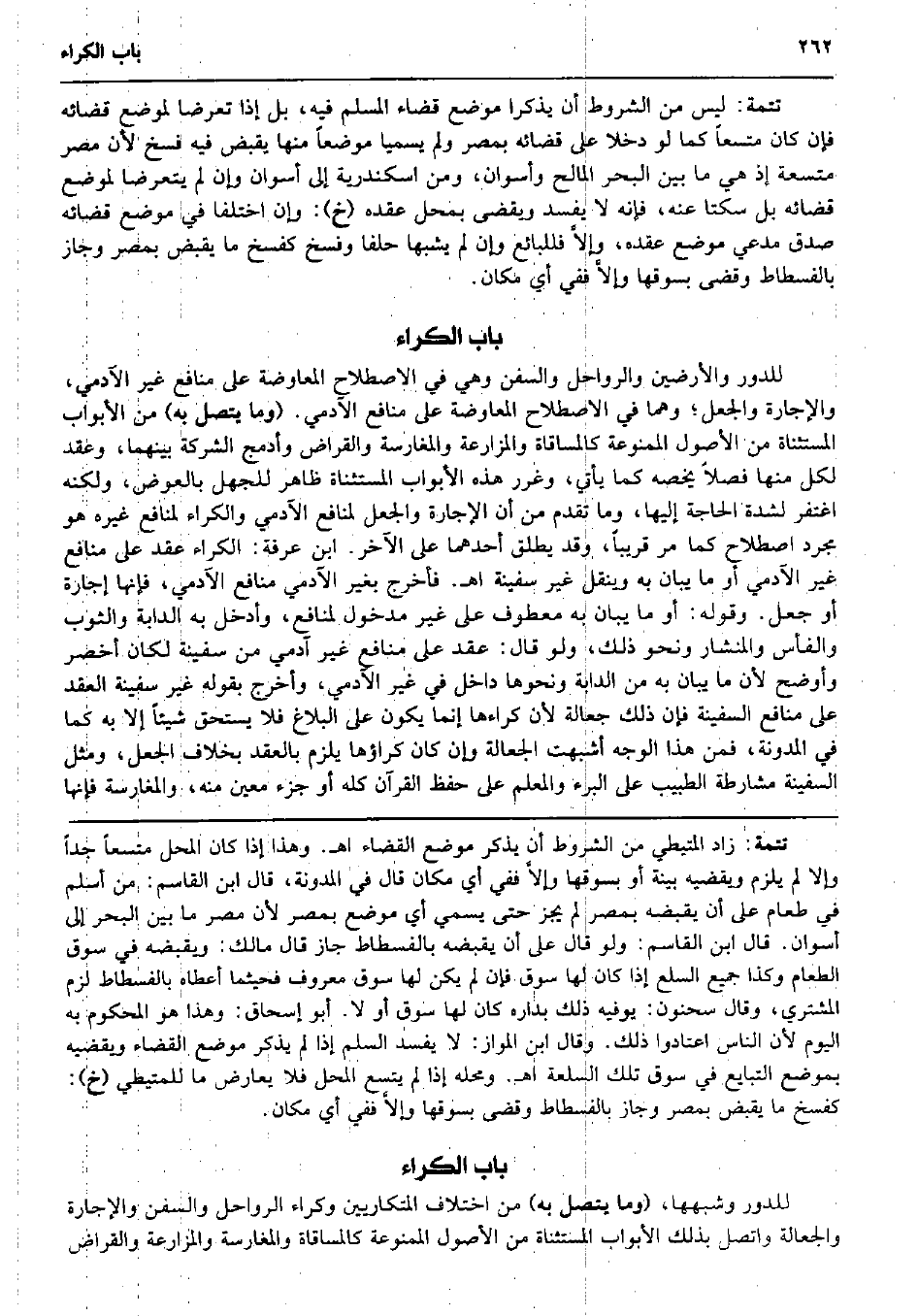 للدور وَالْأَرضين والرواحل والسفن وَهِي فِي الِاصْطِلَاح الْمُعَاوضَة على مَنَافِع غير الْآدَمِيّ، وَالْإِجَارَة والجعل؛ وهما فِي الِاصْطِلَاح الْمُعَاوضَة على مَنَافِع الْآدَمِيّ. (وَمَا يتَّصل بِهِ) من الْأَبْوَاب المستثناة من الْأُصُول الممنوعة كالمساقاة والمزارعة والمغارسة والقراض وأدمج الشّركَة بَينهمَا، وَعقد لكل مِنْهَا فصلا يَخُصُّهُ كَمَا يَأْتِي، وغرر هَذِه الْأَبْوَاب المستثناة ظَاهر للْجَهْل بِالْعِوَضِ، وَلكنه اغتفر لشدَّة الْحَاجة إِلَيْهَا، وَمَا تقدم من أَن الْإِجَارَة والجعل لمنافع الْآدَمِيّ والكراء لمنافع غَيره هُوَ مُجَرّد اصْطِلَاح كَمَا مر قَرِيبا، وَقد يُطلق أَحدهمَا على الآخر. ابْن عَرَفَة: الْكِرَاء عقد على مَنَافِع غير الْآدَمِيّ أَو مَا يبان بِهِ وينقل غير سفينة اه. فَأخْرج بِغَيْر الْآدَمِيّ مَنَافِع الْآدَمِيّ، فَإِنَّهَا إِجَارَة أَو جعل. وَقَوله: أَو مَا يبان بِهِ مَعْطُوف على غير مَدْخُول لمنافع، وَأدْخل بِهِ الدَّابَّة وَالثَّوْب والفأس والمنشار وَنَحْو ذَلِك، وَلَو قَالَ: عقد على مَنَافِع غير آدَمِيّ من سفينة لَكَانَ أخصر وأوضح لِأَن مَا يبان بِهِ من الدَّابَّة وَنَحْوهَا دَاخل فِي غير الْآدَمِيّ، وَأخرج بقوله غير سفينة العقد على مَنَافِع السَّفِينَة فَإِن ذَلِك جعَالَة لِأَن كراءها إِنَّمَا يكون على الْبَلَاغ فَلَا يسْتَحق شَيْئا إِلَّا بِهِ كَمَا فِي الْمُدَوَّنَة، فَمن هَذَا الْوَجْه أشبهت الْجعَالَة وَإِن كَانَ كراؤها يلْزم بِالْعقدِ بِخِلَاف الْجعل، وَمثل السَّفِينَة مشارطة الطَّبِيب على الْبُرْء والمعلم على حفظ الْقُرْآن كُله أَو جُزْء معِين مِنْهُ، والمغارسة فَإِنَّهَا