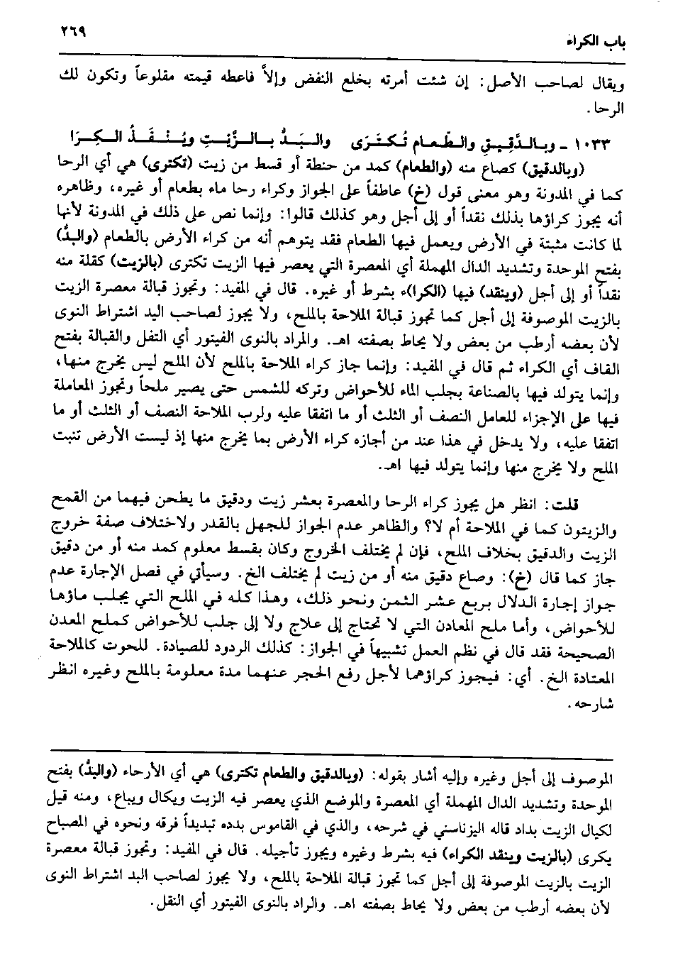 وَيُقَال لصَاحب الأَصْل: إِن شِئْت أَمرته بخلع النفض وإلاَّ فاعطه قِيمَته مقلوعاً وَتَكون لَك الرحا. وبالدَّقِيقِ والطّعام تُكتَرَى والبَدُّ بالزَّيْتِ ويُنْفَذُ الكِرَا (وبالدقيق) كصاع مِنْهُ (وَالطَّعَام) كمد من حِنْطَة أَو قسط من زَيْت (تكترى) هِيَ أَي الرحا كَمَا فِي الْمُدَوَّنَة وَهُوَ معنى قَول (خَ) عاطفاً على الْجَوَاز وكراء رَحا مَاء بِطَعَام أَو غَيره، وَظَاهره أَنه يجوز كراؤها بذلك نَقْدا أَو إِلَى أجل وَهُوَ كَذَلِك قَالُوا: وَإِنَّمَا نَص على ذَلِك فِي الْمُدَوَّنَة لِأَنَّهَا لما كَانَت مثبتة فِي الأَرْض وَيعْمل فِيهَا الطَّعَام فقد يتَوَهَّم أَنه من كِرَاء الأَرْض بِالطَّعَامِ (والبدُّ) بِفَتْح الْمُوَحدَة وَتَشْديد الدَّال الْمُهْملَة أَي المعصرة الَّتِي يعصر فِيهَا الزَّيْت تكترى (بالزيت) كقلة مِنْهُ نَقْدا أَو إِلَى أجل (وينقد) فِيهَا (الكرا) ء بِشَرْط أَو غَيره. قَالَ فِي الْمُفِيد: وَتجوز قبالة معصرة الزَّيْت بالزيت الموصوفة إِلَى أجل كَمَا تجوز قبالة الملاحة بالملح، وَلَا يجوز لصَاحب الْيَد اشْتِرَاط النَّوَى لِأَن بعضه أرطب من بعض وَلَا يحاط بِصفتِهِ اه. وَالْمرَاد بالنوى الفيتور أَي التفل والقبالة بِفَتْح الْقَاف أَي الْكِرَاء ثمَّ قَالَ فِي الْمُفِيد: وَإِنَّمَا جَازَ كِرَاء الملاحة بالملح لِأَن الْملح لَيْسَ يخرج مِنْهَا، وَإِنَّمَا يتَوَلَّد فِيهَا بالصناعة بجلب المَاء للأحواض وَتَركه للشمس حَتَّى يصير ملحاً وَتجوز الْمُعَامَلَة فِيهَا على الْإِجْزَاء لِلْعَامِلِ النّصْف أَو الثُّلُث أَو مَا اتفقَا عَلَيْهِ ولرب الملاحة النّصْف أَو الثُّلُث أَو مَا اتفقَا عَلَيْهِ، وَلَا يدْخل فِي هَذَا عِنْد من أجَازه كِرَاء الأَرْض بِمَا يخرج مِنْهَا إِذْ لَيست الأَرْض تنْبت الْملح وَلَا يخرج مِنْهَا وَإِنَّمَا يتَوَلَّد فِيهَا اه. قلت: انْظُر هَل يجوز كِرَاء الرحا والمعصرة بِعشر زَيْت ودقيق مَا يطحن فيهمَا من الْقَمْح وَالزَّيْتُون كَمَا فِي الملاحة أم لَا؟ وَالظَّاهِر عدم الْجَوَاز للْجَهْل بِالْقدرِ ولاختلاف صفة خُرُوج الزَّيْت والدقيق بِخِلَاف الْملح، فَإِن لم يخْتَلف الْخُرُوج وَكَانَ بقسط مَعْلُوم كمد مِنْهُ أَو من دَقِيق جَازَ كَمَا قَالَ (خَ) : وَصَاع دَقِيق مِنْهُ أَو من زَيْت لم يخْتَلف الخ. وَسَيَأْتِي فِي فصل الْإِجَارَة عدم جَوَاز إِجَارَة الدَّلال بِربع عشر الثّمن وَنَحْو ذَلِك، وَهَذَا كُله فِي الْملح الَّتِي يجلب مَاؤُهَا للأحواض، وَأما ملح الْمَعَادِن الَّتِي لَا تحْتَاج إِلَى علاج وَلَا إِلَى جلب للأحواض كملح الْمَعْدن الصَّحِيحَة فقد قَالَ فِي نظم الْعَمَل تَشْبِيها فِي الْجَوَاز: كَذَلِك الردود للصيادة. للحوت كالملاحة الْمُعْتَادَة الخ. أَي: فَيجوز كراؤهما لأجل رفع الْحجر عَنْهُمَا مُدَّة مَعْلُومَة بالملح وَغَيره انْظُر شَارِحه.