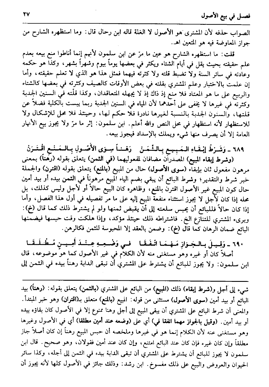 الصَّوَاب حذفه لِأَن الْمُشْتَرى هُوَ الْأُصُول لَا الْغلَّة قَالَه ابْن رحال قَالَ: وَمَا اسْتَظْهرهُ الشَّارِح من جَوَاز الْمُعَاوضَة فِيهِ هُوَ الْمُتَعَيّن اه. قلت: مَا اسْتَظْهرهُ الشَّارِح هُوَ عين مَا مرّ عَن ابْن سَلمُون لأَنهم إِنَّمَا أناطوا منع بَيْعه بِعَدَمِ علم حَقِيقَته بِحَيْثُ يقل فِي أَيَّام الشتَاء وَيكثر فِي بَعْضهَا يَوْمًا بِيَوْم وشهراً بِشَهْر، وَكَذَا هُوَ حكمه وعادته فِي سَائِر السّنة وَلَا تضبط قلته وَلَا كثرته فيهمَا فَمثل هَذَا هُوَ الَّذِي لَا تعلم حَقِيقَته، وَأما إِن علمت بالاختبار وَعلم المُشْتَرِي بقلته فِي بعض الْأَوْقَات كالصيف وكثرته فِي بَعْضهَا كالشتاء وَالربيع على مَا هُوَ الْمُعْتَاد فَلَا منع إِذْ ذَاك إِذْ لَا يجهله المتعاقدان، وَكَذَا قلّته فِي السنين الجدبة وكثرته فِي غَيرهَا لَا يخفى على أَحدهمَا لِأَن الْمِيَاه فِي السنين الجدبة رُبمَا يَبِسَتْ بِالْكُلِّيَّةِ فضلا عَن قلتهَا، والسنون الجدبة بِالنِّسْبَةِ لغَيْرهَا نادرة فَلَا حكم لَهَا، وَحِينَئِذٍ فَلَا مَحل للإشكال وَلَا للاستظهار لِأَنَّهُ استظهار فِي مَحل النَّص وَالله أعلم. ابْن سَلمُون: إِثْر مَا مرّ وَلَا يجوز بيع الْأَنْهَار الْعَامَّة إِلَّا أَن يصرف مِنْهَا شَيْء وَيملك بالإسداد فَيجوز بَيْعه. وَشَرْطُ إبْقَاءِ المَبِيعِ بِالثَّمَنْ رَهْناً سِوَى الأَصُولِ بِالمَنْعِ اقْتَرَنْ (وَشرط إبْقَاء الْمَبِيع) المصدران مضافان لمفعوليهما (فِي الثّمن) يتَعَلَّق بقوله (رهنا) بِمَعْنى مَرْهُون مفعول ثَان بإبقاء (سوى الْأُصُول) حَال من الْمَبِيع (بِالْمَنْعِ) يتَعَلَّق بقوله (اقْترن) وَالْجُمْلَة خبر شَرط وَالتَّقْدِير؛ وَشرط البَائِع أَن يبقي بِضَم الْيَاء الْمَبِيع مَرْهُونا فِي الثّمن بِيَدِهِ أَو بيد أَمِين حَال كَون الْمَبِيع غير الْأُصُول اقْترن بِالْمَنْعِ، وَظَاهره كَانَ البيع حَالا أَو لأجل وَلَيْسَ كَذَلِك، بل مَحَله إِذا كَانَ لأجل لَا يجوز اسْتثِْنَاء مَنْفَعَة الْمَبِيع إِلَيْهِ على مَا مر تَفْصِيله فِي أول هَذَا الْفَصْل، وَأما إِذا كَانَ حَالا فَللْبَائِع أَن يحبس سلْعَته إِلَى أَن يقبض ثمنهَا وَلَو لم يشْتَرط ذَلِك كَمَا قَالَ (خَ) : وبرىء المُشْتَرِي للتنازع الخ. فاشتراطه ذَلِك حِينَئِذٍ مُؤَكد، وَإِذا هَلَكت وَقت حَبسهَا فيضمنها البَائِع ضَمَان الرِّهَان كَمَا قَالَ (خَ) : وَضمن بِالْعقدِ إِلَّا المحبوسة للثّمن فكالرهن. وَقِيلَ بالجَوَازِ مَهْمَا اتّفَقَا فِي وَضْعِهِ عِنْدَ أَمِينٍ مُطْلَقَا أصلا كَانَ أَو غَيره وَهُوَ مُسْتَغْنى مِنْهُ لِأَن الْكَلَام فِي غير الْأُصُول كَمَا هُوَ مَوْضُوعه، قَالَ ابْن سَلمُون: وَلَا يجوز للْبَائِع أَن يشْتَرط على المُشْتَرِي أَن تبقى الدَّابَّة رهنا بِيَدِهِ فِي الثّمن إِلَى
