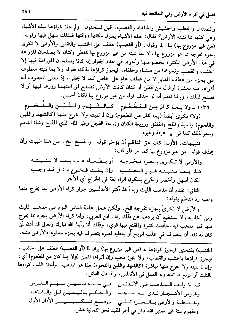 والصندل والحطب والحشيش والحلفاء والقصب. قيل لسَحْنُون: وَلم جَازَ كراؤها بِهَذِهِ الْأَشْيَاء وَهِي كلهَا مِمَّا تنبته الأَرْض؟ فَقَالَ: هَذِه الْأَشْيَاء يطول مكثها ووقتها فَلذَلِك سهل فِيهَا وَقَوله: (من غير مزروع بهَا) بَيَان لما وَقَوله. (أَو الْقصب) عطف على الْخشب وَالتَّقْدِير وَالْأَرْض لَا تكرى بِجُزْء تخرجه مِمَّا هُوَ مزروع بهَا وَلَا بِمَا تنبته من غير مزروع بهَا كقطن وكتان لَا يصلحان للزِّرَاعَة فِي هَذِه الأَرْض المكتراة بخصوصها وَأَحْرَى فِي عدم الْجَوَاز إِذا كَانَا يصلحان للزِّرَاعَة فِيهَا إِلَّا الْخشب والقصب وَنَحْوهمَا من صندل وحلفاء، فَيجوز كراؤها بذلك فَقَوله وَلَا بِمَا تنبته مَعْطُوف على بِجُزْء من عطف المغاير لَا من عطف عَام على خَاص كَمَا لَا يخفى، إِذْ معنى الْمَعْطُوف أَنه أكراها مِنْهُ بِعشْرَة أَرْطَال من قطن أَو كتَّان كَانَت الأَرْض تصلح لزراعتهما وزرعا فِيهَا أَو لَا تصلح لذَلِك، وَبِهَذَا تعلم أَنه لَو حذف قَوْله من غير مزروع بهَا لَكَانَ أحسن. وَلَا بِما كانَ مِنَ المَطْعُومِ كالشّهْدِ واللّبَنِ واللُّحْومِ (وَلَا) تكرى أَيْضا (بِمَا كَانَ من المطعوم) وَإِن لم تنبته وَلَا خرج مِنْهَا (كالشهد وَاللَّبن واللحوم) والنبيذ وَالْملح والفلفل وزريعة الْكَتَّان وزريعة الفجل وطير المَاء الَّذِي للذبح وشَاة اللَّحْم وَنَحْو ذَلِك كَمَا فِي ابْن عَرَفَة وَغَيره. تَنْبِيهَات. الأول: كَانَ حق النَّاظِم أَن يُؤَخر قَوْله: وَالْفَسْخ الخ. عَن هَذَا الْبَيْت وَأَن يحذف قَوْله: من غير مزروع بهَا كَمَا مر فَلَو قَالَ: وَالْأَرْض لَا تكرى بِجُزْء تخرجه أَو بِطَعَام هَب بِمَا لَا تنبته كَذَا بِمَا تنبته غير الْخشب وَإِن يفت فَخرج مثل قد وَجب لَكَانَ أسهل وأخصر والخرج بِسُكُون الرَّاء لُغَة فِي الْخراج أَي الْأجر. الثَّانِي: تقدم أَن مَذْهَب اللَّيْث وَبِه أَخذ أَكثر الأندلسيين جَوَاز كِرَاء الأَرْض بِمَا يخرج مِنْهَا وَعَلِيهِ رد النَّاظِم بقوله: وَالْأَرْض لَا تكرى بِجُزْء تخرجه الخ. وَلَكِن عمل عَامَّة النَّاس الْيَوْم على مَذْهَب اللَّيْث وَمن أَخذ بِهِ وَلَا يَسْتَطِيع أَن يردهم عَن ذَلِك راد. ابْن الْعَرَبِيّ: وَأما كِرَاء الأَرْض بِجُزْء مِمَّا يخرج مِنْهَا فَهُوَ مَذْهَب فِيهِ أَحَادِيث كَثِيرَة وَالْمقنع فِيهَا قوي، وَذَلِكَ أَنا رَأينَا الله تبَارك وَتَعَالَى قد أذن لمن كَانَ لَهُ نقد أَن يتَصَرَّف فِي طلب الرِّبْح أَو يُعْطِيهِ لغيره يتَصَرَّف فِيهِ بِجُزْء مَعْلُوم فالأرض مثله،