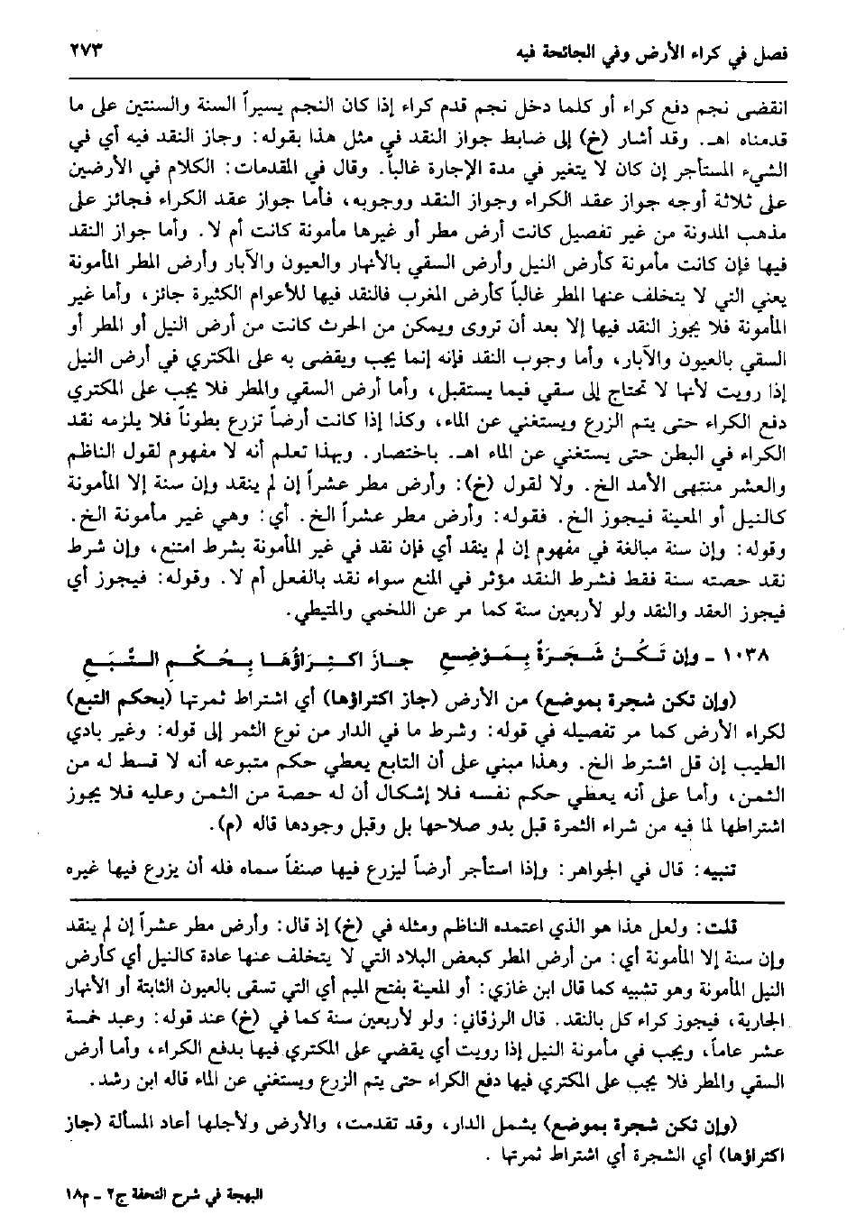 فَكلما انْقَضى نجم دفع كِرَاء أَو كلما دخل نجم قدم كِرَاء إِذا كَانَ النَّجْم يَسِيرا السّنة والسنتين على مَا قدمْنَاهُ اه. وَقد أَشَارَ (خَ) إِلَى ضَابِط جَوَاز النَّقْد فِي مثل هَذَا بقوله: وَجَاز النَّقْد فِيهِ أَي فِي الشَّيْء الْمُسْتَأْجر إِن كَانَ لَا يتَغَيَّر فِي مُدَّة الْإِجَارَة غَالِبا. وَقَالَ فِي الْمُقدمَات: الْكَلَام فِي الْأَرْضين على ثَلَاثَة أوجه جَوَاز عقد الْكِرَاء وَجَوَاز النَّقْد ووجوبه فَأَما جَوَاز عقد الْكِرَاء فَجَائِز على مَذْهَب الْمُدَوَّنَة من غير تَفْصِيل كَانَت أَرض مطر أَو غَيرهَا مَأْمُونَة كَانَت أم لَا. وَأما جَوَاز النَّقْد فِيهَا فَإِن كَانَت مَأْمُونَة كأرض النّيل وَأَرْض السَّقْي بالأنهار والعيون والآبار وَأَرْض الْمَطَر المأمونة يَعْنِي الَّتِي لَا يتَخَلَّف عَنْهَا الْمَطَر غَالِبا كأرض الْمغرب فالنقد فِيهَا للأعوام الْكَثِيرَة جَائِز، وَأما غير المأمونة فَلَا يجوز النَّقْد فِيهَا إِلَّا بعد أَن تروى وَيُمكن من الْحَرْث كَانَت من أَرض النّيل أَو الْمَطَر أَو السَّقْي بالعيون والآبار، وَأما وجوب النَّقْد فَإِنَّهُ إِنَّمَا يجب وَيقْضى بِهِ على الْمُكْتَرِي فِي أَرض النّيل إِذا رويت لِأَنَّهَا لَا تحْتَاج إِلَى سقِِي فِيمَا يسْتَقْبل، وَأما أَرض السَّقْي والمطر فَلَا يجب على الْمُكْتَرِي دفع الْكِرَاء حَتَّى يتم الزَّرْع ويستغني عَن المَاء، وَكَذَا إِذا كَانَت أَرضًا تزرع بطوناً فَلَا يلْزمه نقد الْكِرَاء فِي الْبَطن حَتَّى يَسْتَغْنِي عَن المَاء اه. بِاخْتِصَار. وَبِهَذَا تعلم أَنه لَا مَفْهُوم لقَوْل النَّاظِم وَالْعشر مُنْتَهى الأمد الخ. وَلَا لقَوْل (خَ) : وَأَرْض مطر عشرا إِن لم ينْقد وَإِن سنة إِلَّا المأمونة كالنيل أَو الْمعينَة فَيجوز الخ. فَقَوله: وَأَرْض مطر عشرا الخ. أَي: وَهِي غير مَأْمُونَة الخ. وَقَوله: وَإِن سنة مُبَالغَة فِي مَفْهُوم إِن لم ينْقد أَي فَإِن نقد فِي غير المأمونة بِشَرْط امْتنع، وَإِن شَرط نقد حِصَّته سنة فَقَط فَشرط النَّقْد مُؤثر فِي الْمَنْع سَوَاء نقد بِالْفِعْلِ أم لَا. وَقَوله: فَيجوز أَي فَيجوز العقد والنقد وَلَو لأربعين سنة كَمَا مر عَن اللَّخْمِيّ والمتيطي. وَإِن تَكُنْ شَجَرَةٌ بِمَوْضِعِ جازَ اكتِرَاؤُهَا بِحُكْمِ التَّبَعِ (وَإِن تكن شَجَرَة بِموضع) من الأَرْض (جَازَ اكتراؤها) أَي اشْتِرَاط ثَمَرَتهَا (بِحكم التبع) لكراء الأَرْض كَمَا مر تَفْصِيله فِي قَوْله: وَشرط مَا فِي الدَّار من نوع الثَّمر إِلَى قَوْله: وَغير بَادِي الطّيب إِن قل اشْترط الخ. وَهَذَا مَبْنِيّ على أَن التَّابِع يُعْطي حكم متبوعه أَنه لَا قسط لَهُ من الثّمن، وَأما على أَنه يُعْطي حكم نَفسه فَلَا إِشْكَال أَن لَهُ حِصَّة من الثّمن وَعَلِيهِ فَلَا يجوز اشْتِرَاطهَا لما فِيهِ من شِرَاء الثَّمَرَة قبل بَدو صَلَاحهَا بل وَقبل وجودهَا قَالَه (م) . تَنْبِيه: قَالَ فِي الْجَوَاهِر: وَإِذا اسْتَأْجر أَرضًا ليزرع فِيهَا صنفا سَمَّاهُ فَلهُ أَن يزرع فِيهَا غَيره
