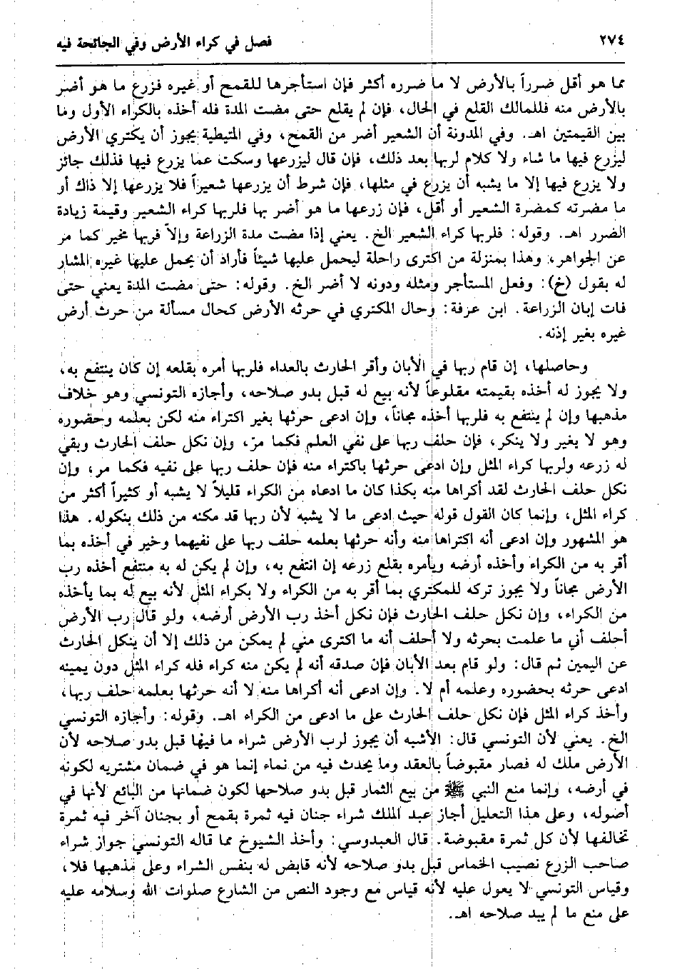 مِمَّا هُوَ أقل ضَرَرا بِالْأَرْضِ لَا مَا ضَرَره أَكثر فَإِن اسْتَأْجرهَا للقمح أَو غَيره فزرع مَا هُوَ أضرّ بِالْأَرْضِ مِنْهُ فللمالك الْقلع فِي الْحَال، فَإِن لم يقْلع حَتَّى مَضَت الْمدَّة فَلهُ أَخذه بالكراء الأول وَمَا بَين الْقِيمَتَيْنِ اه. وَفِي الْمُدَوَّنَة أَن الشّعير أضرّ من الْقَمْح، وَفِي الْمُتَيْطِيَّة يجوز أَن يكتري الأَرْض ليزرع فِيهَا مَا شَاءَ وَلَا كَلَام لِرَبِّهَا بعد ذَلِك، فَإِن قَالَ ليزرعها وَسكت عَمَّا يزرع فِيهَا فَذَلِك جَائِز وَلَا يزرع فِيهَا إِلَّا مَا يشبه أَن يزرع فِي مثلهَا، فَإِن شَرط أَن يَزْرَعهَا شَعِيرًا فَلَا يَزْرَعهَا إِلَّا ذَاك أَو مَا مضرته كمضرة الشّعير أَو أقل، فَإِن زَرعهَا مَا هُوَ أضرّ بهَا فلربها كِرَاء الشّعير وَقِيمَة زِيَادَة الضَّرَر اه. وَقَوله: فلربها كِرَاء الشّعير الخ. يَعْنِي إِذا مَضَت مُدَّة الزِّرَاعَة وإلاّ فربها مُخَيّر كَمَا مر عَن الْجَوَاهِر، وَهَذَا بِمَنْزِلَة من اكترى رَاحِلَة ليحمل عَلَيْهَا شَيْئا فَأَرَادَ أَن يحمل عَلَيْهَا غَيره الْمشَار لَهُ بقول (خَ) : وَفعل الْمُسْتَأْجر وَمثله ودونه لَا أضرّ الخ. وَقَوله: حَتَّى مَضَت الْمدَّة يَعْنِي حَتَّى فَاتَ إبان الزِّرَاعَة. ابْن عَرَفَة: وَحَال الْمُكْتَرِي فِي حرثه الأَرْض كَحال مَسْأَلَة من حرث أَرض غَيره بِغَيْر إِذْنه. وحاصلها، إِن قَامَ رَبهَا فِي الأبان وَأقر الْحَارِث بالعداء فلربها أمره بقلعه إِن كَانَ ينْتَفع بِهِ، وَلَا يجوز لَهُ أَخذه بِقِيمَتِه مقلوعاً لِأَنَّهُ بيع لَهُ قبل بَدو صَلَاحه، وَأَجَازَهُ التّونسِيّ وَهُوَ خلاف مذهبها وَإِن لم ينْتَفع بِهِ فلربها أَخذه مجَّانا، وَإِن ادّعى حرثها بِغَيْر اكتراء مِنْهُ لَكِن بِعِلْمِهِ وحضوره وَهُوَ لَا يُغير وَلَا يُنكر، فَإِن حلف رَبهَا على نفي الْعلم فَكَمَا مرّ، وَإِن نكل حلف الْحَارِث وَبَقِي لَهُ زرعه ولربها كِرَاء الْمثل وَإِن ادّعى حرثها باكتراء مِنْهُ فَإِن حلف رَبهَا على نَفْيه فَكَمَا مر وَإِن نكل حلف الْحَارِث لقد أكراها مِنْهُ بِكَذَا كَانَ مَا ادَّعَاهُ من الْكِرَاء قَلِيلا لَا يشبه أَو كثيرا أَكثر من كِرَاء الْمثل، وَإِنَّمَا كَانَ القَوْل قَوْله حَيْثُ ادّعى مَا لَا يشبه لِأَن رَبهَا قد مكنه من ذَلِك بِنُكُولِهِ. هَذَا هُوَ الْمَشْهُور وَإِن ادّعى أَنه اكتراها مِنْهُ وَأَنه حرثها بِعِلْمِهِ حلف رَبهَا على نفيهما وَخير فِي أَخذه بِمَا أقرّ بِهِ من الْكِرَاء وَأَخذه أرضه ويأمره بقلع زرعه إِن انْتفع بِهِ، وَإِن لم يكن لَهُ بِهِ منتفع أَخذه رب الأَرْض مجَّانا وَلَا يجوز تَركه للمكتري بِمَا أقرّ بِهِ من الْكِرَاء وَلَا بكرَاء الْمثل لِأَنَّهُ بيع لَهُ بِمَا يَأْخُذهُ من الْكِرَاء، وَإِن نكل حلف الْحَارِث فَإِن نكل أَخذ رب الأَرْض أرضه، وَلَو قَالَ رب الأَرْض أَحْلف أَنِّي مَا علمت بحرثه وَلَا أَحْلف أَنه مَا اكترى مني لم يُمكن من ذَلِك إِلَّا أَن ينكل الْحَارِث عَن الْيَمين ثمَّ قَالَ: وَلَو قَامَ بعد الأبان فَإِن صدقه أَنه لم يكن مِنْهُ كِرَاء فَلهُ كِرَاء الْمثل دون يَمِينه ادّعى حرثه بِحُضُورِهِ وَعلمه أم لَا. وَإِن ادّعى أَنه أكراها مِنْهُ لَا أَنه حرثها بِعِلْمِهِ حلف رَبهَا، وَأخذ كِرَاء الْمثل فَإِن نكل حلف الْحَارِث على مَا ادّعى من الْكِرَاء اه. وَقَوله: وَأَجَازَهُ التّونسِيّ الخ. يَعْنِي لِأَن التّونسِيّ قَالَ: الْأَشْبَه أَن يجوز لرب الأَرْض شِرَاء مَا فِيهَا قبل بَدو صَلَاحه لِأَن الأَرْض ملك لَهُ فَصَارَ مَقْبُوضا بِالْعقدِ وَمَا يحدث فِيهِ من نَمَاء إِنَّمَا هُوَ فِي ضَمَان مُشْتَرِيه لكَونه فِي أرضه، وَإِنَّمَا منع النَّبِي صلى الله عَلَيْهِ وَسلم من بيع الثِّمَار قبل بَدو صَلَاحهَا لكَون ضَمَانهَا من البَائِع لِأَنَّهَا فِي أُصُوله، وعَلى هَذَا التَّعْلِيل أجَاز عبد الْملك شِرَاء جنان فِيهِ ثَمَرَة