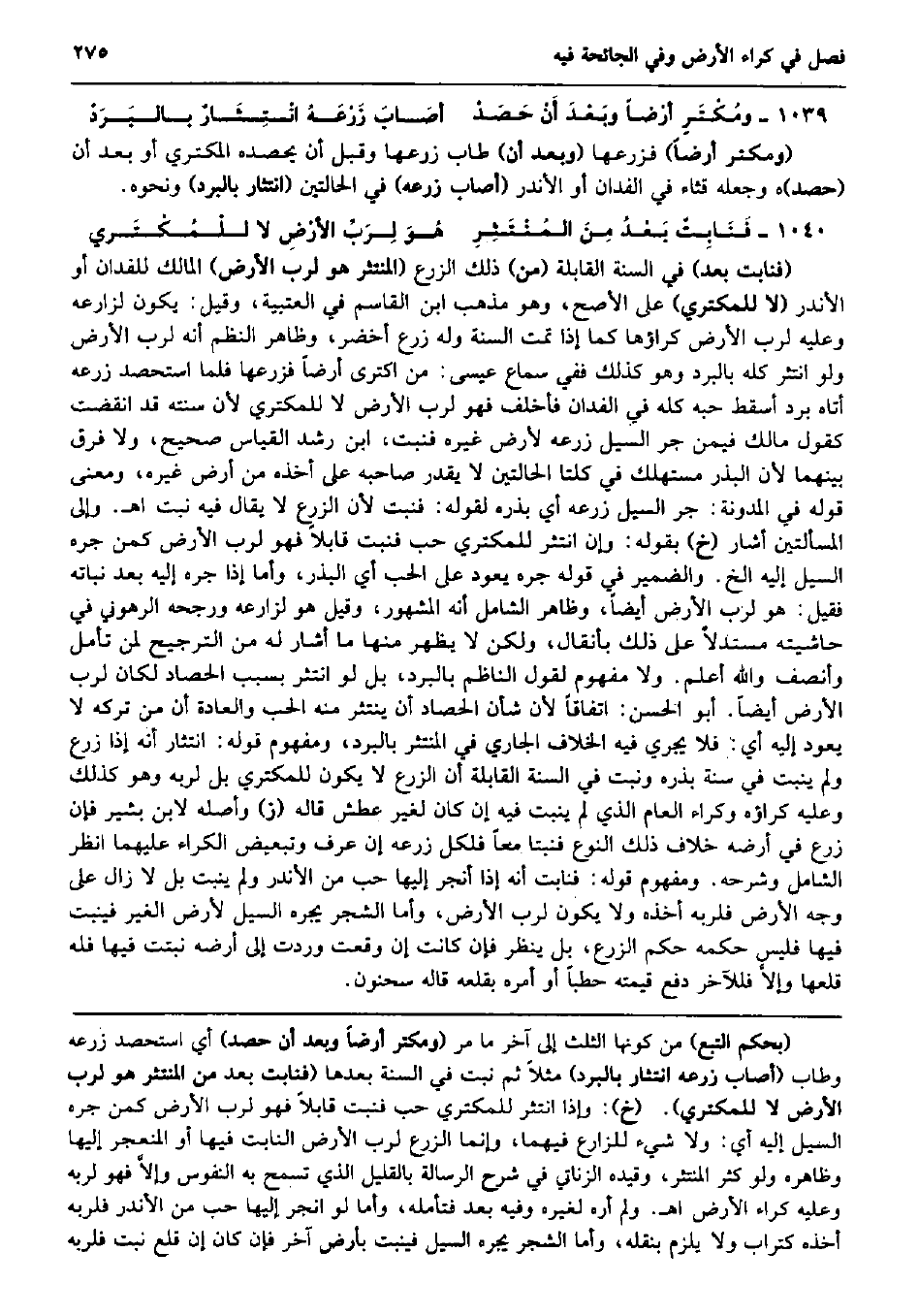 ومُكْتَرٍ أرْضاً وبَعْدَ أَنْ حَصَدْ أصَابَ زَرْعَهُ انْتِثَارٌ بالبَرَدْ (ومكتر أَرضًا) فزرعها (وَبعد أَن) طَابَ زَرعهَا وَقبل أَن يحصده الْمُكْتَرِي أَو بعد أَن (حصد) هـ وَجعله قثاء فِي الفدان أَو الأندر (أصَاب زرعه) فِي الْحَالَتَيْنِ (انتثار بالبرد) وَنَحْوه. فَنَابِتٌ بَعْدُ مِنَ المُنْتَثِرِ هُوَ لِرَبِّ الأرْضِ لَا للْمُكْتَري (فنابت بعد) فِي السّنة الْقَابِلَة (من) ذَلِك الزَّرْع (المنتثر هُوَ لرب الأَرْض) الْمَالِك للفدان أَو الأندر (لَا للمكتري) على الْأَصَح، وَهُوَ مَذْهَب ابْن الْقَاسِم فِي الْعُتْبِيَّة، وَقيل: يكون لزارعه وَعَلِيهِ لرب الأَرْض كراؤها كَمَا إِذا تمت السّنة وَله زرع أَخْضَر، وَظَاهر النّظم أَنه لرب الأَرْض وَلَو انتثر كُله بالبرد وَهُوَ كَذَلِك فَفِي سَماع عِيسَى: من اكترى أَرضًا فزرعها فَلَمَّا استحصد زرعه أَتَاهُ برد أسقط حبه كُله فِي الفدان فأخلف فَهُوَ لرب الأَرْض لَا للمكتري لِأَن سنته قد انْقَضتْ كَقَوْل مَالك فِيمَن جر السَّيْل زرعه لأرض غَيره فنبت، ابْن رشد الْقيَاس صَحِيح، وَلَا فرق بَينهمَا لِأَن الْبذر مستهلك فِي كلتا الْحَالَتَيْنِ لَا يقدر صَاحبه على أَخذه من أَرض غَيره، وَمعنى قَوْله فِي الْمُدَوَّنَة: جر السَّيْل زرعه أَي بذره لقَوْله: فنبت لِأَن الزَّرْع لَا يُقَال فِيهِ نبت اه. وَإِلَى الْمَسْأَلَتَيْنِ أَشَارَ (خَ) بقوله: وَإِن انتثر للمكتري حب فنبت قَابلا فَهُوَ لرب الأَرْض كمن جَرّه السَّيْل إِلَيْهِ الخ. وَالضَّمِير فِي قَوْله جَرّه يعود على الْحبّ أَي الْبذر، وَأما إِذا جَرّه إِلَيْهِ بعد نَبَاته فَقيل: هُوَ لرب الأَرْض أَيْضا، وَظَاهر الشَّامِل أَنه الْمَشْهُور، وَقيل هُوَ لزارعه وَرجحه الرهوني فِي حَاشِيَته مستدلاً على ذَلِك بأنقال، وَلَكِن لَا يظْهر مِنْهَا مَا أَشَارَ لَهُ من التَّرْجِيح لمن تَأمل وأنصف وَالله أعلم. وَلَا مَفْهُوم لقَوْل النَّاظِم بالبرد، بل لَو انتثر بِسَبَب الْحَصاد لَكَانَ لرب الأَرْض أَيْضا. أَبُو الْحسن: اتِّفَاقًا لِأَن شَأْن الْحَصاد أَن ينتثر مِنْهُ الْحبّ وَالْعَادَة أَن من تَركه لَا يعود إِلَيْهِ أَي: فَلَا يجْرِي فِيهِ الْخلاف الْجَارِي فِي المنتثر بالبرد، وَمَفْهُوم قَوْله: انتثار أَنه إِذا زرع وَلم ينْبت فِي سنة بذره وَنبت فِي السّنة الْقَابِلَة أَن الزَّرْع لَا يكون للمكتري بل لرَبه وَهُوَ كَذَلِك وَعَلِيهِ كراؤه وكراء الْعَام الَّذِي لم ينْبت فِيهِ إِن كَانَ لغير عَطش قَالَه (ز) وَأَصله لِابْنِ بشير فَإِن زرع فِي أرضه خلاف ذَلِك النَّوْع فنبتا مَعًا فَلِكُل زرعه إِن عرف وتبعيض الْكِرَاء عَلَيْهِمَا انْظُر الشَّامِل وَشَرحه. وَمَفْهُوم قَوْله: فنابت أَنه إِذا أنجر إِلَيْهَا حب من الأندر وَلم ينْبت بل لَا زَالَ على وَجه الأَرْض فلربه أَخذه وَلَا يكون لرب الأَرْض، وَأما الشّجر يجره السَّيْل لأرض الْغَيْر فينبت فِيهَا فَلَيْسَ حكمه حكم الزَّرْع، بل ينظر فَإِن كَانَت إِن وَقعت وَردت إِلَى أرضه نَبتَت فِيهَا فَلهُ قلعهَا وإلاَّ فللآخر دفع قِيمَته حطباً أَو أمره بقلعه قَالَه سَحْنُون.