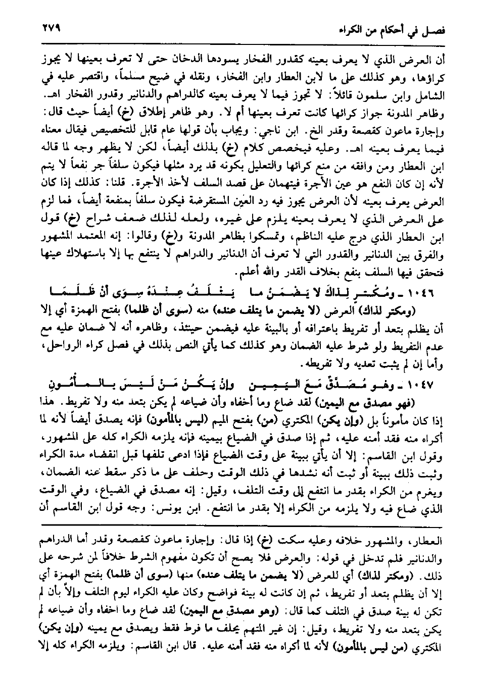 أَن الْعرض الَّذِي لَا يعرف بِعَيْنِه كقدور الفخار يسودها الدُّخان حَتَّى لَا تعرف بِعَينهَا لَا يجوز كراؤها، وَهُوَ كَذَلِك على مَا لِابْنِ الْعَطَّار وَابْن الفخار، وَنَقله فِي ضيح مُسلما، وَاقْتصر عَلَيْهِ فِي الشَّامِل وَابْن سَلمُون قَائِلا: لَا تجوز فِيمَا لَا يعرف بِعَيْنِه كالدراهم وَالدَّنَانِير وقدور الفخار اه. وَظَاهر الْمُدَوَّنَة جَوَاز كرائها كَانَت تعرف بِعَينهَا أم لَا. وَهُوَ ظَاهر إِطْلَاق (خَ) أَيْضا حَيْثُ قَالَ: وَإِجَارَة ماعون كقصعة وَقدر الخ. ابْن نَاجِي: وَيُجَاب بِأَن قَوْلهَا عَام قَابل للتخصيص فَيُقَال مَعْنَاهُ فِيمَا يعرف بِعَيْنِه اه. وَعَلِيهِ فيخصص كَلَام (خَ) بذلك أَيْضا، لَكِن لَا يظْهر وَجه لما قَالَه ابْن الْعَطَّار وَمن وَافقه من منع كرائها وَالتَّعْلِيل بِكَوْنِهِ قد يرد مثلهَا فَيكون سلفا جر نفعا لَا يتم لِأَنَّهُ إِن كَانَ النَّفْع هُوَ عين الْأُجْرَة فيتهمان على قصد السّلف لأخذ الْأُجْرَة. قُلْنَا: كَذَلِك إِذا كَانَ الْعرض يعرف بِعَيْنِه لِأَن الْعرض يجوز فِيهِ رد الْعين المستقرضة فَيكون سلفا بِمَنْفَعَة أَيْضا، فَمَا لزم على الْعرض الَّذِي لَا يعرف بِعَيْنِه يلْزم على غَيره، وَلَعَلَّه لذَلِك ضعف شرَّاح (خَ) قَول ابْن الْعَطَّار الَّذِي درج عَلَيْهِ النَّاظِم، وتمسكوا بِظَاهِر الْمُدَوَّنَة و (خَ) وَقَالُوا: إِنَّه الْمُعْتَمد الْمَشْهُور وَالْفرق بَين الدَّنَانِير والقدور الَّتِي لَا تعرف أَن الدَّنَانِير وَالدَّرَاهِم لَا ينْتَفع بهَا إِلَّا باستهلاك عينهَا فتحقق فِيهَا السّلف بنفع بِخِلَاف الْقدر وَالله أعلم. ومُكْترٍ لِذاكَ لَا يَضْمَنُ مَا يَتْلَفُ عِنْدَهُ سِوَى أنْ ظَلَمَا (ومكتر لذاك) الْعرض (لَا يضمن مَا يتْلف عِنْده) مِنْهُ (سوى أَن ظلما) بِفَتْح الْهمزَة أَي إِلَّا أَن يظلم بتعد أَو تَفْرِيط باعترافه أَو بِالْبَيِّنَةِ عَلَيْهِ فَيضمن حِينَئِذٍ، وَظَاهره أَنه لَا ضَمَان عَلَيْهِ مَعَ عدم التَّفْرِيط وَلَو شَرط عَلَيْهِ الضَّمَان وَهُوَ كَذَلِك كَمَا يَأْتِي النَّص بذلك فِي فصل كِرَاء الرَّوَاحِل، وَأما إِن لم يثبت تعديه وَلَا تفريطه. وهْو مُصَدَّقٌ مَعَ اليَمِين وإنْ يَكُنْ مَنْ لَيْسَ بالمأْمُونِ (فَهُوَ مُصدق مَعَ الْيَمين) لقد ضَاعَ وَمَا أخفاه وَأَن ضيَاعه لم يكن بتعد مِنْهُ وَلَا تَفْرِيط. هَذَا إِذا كَانَ مَأْمُونا بل (وَإِن يكن) الْمُكْتَرِي (من) بِفَتْح الْمِيم (لَيْسَ بالمأمون) فَإِنَّهُ يصدق أَيْضا لِأَنَّهُ لما أكراه مِنْهُ فقد أَمنه عَلَيْهِ، ثمَّ إِذا صدق فِي الضّيَاع بِيَمِينِهِ فَإِنَّهُ يلْزمه الْكِرَاء كُله على الْمَشْهُور، وَقَول ابْن الْقَاسِم: إِلَّا أَن يَأْتِي بِبَيِّنَة على وَقت الضّيَاع فَإِذا ادّعى تلفهَا قبل انْقِضَاء مُدَّة الْكِرَاء وَثَبت ذَلِك بِبَيِّنَة أَو ثَبت أَنه نشدها فِي ذَلِك الْوَقْت وَحلف على مَا ذكر سقط عَنهُ الضَّمَان، وَيغرم من الْكِرَاء بِقدر مَا انْتفع إِلَى وَقت التّلف، وَقيل: إِنَّه مُصدق فِي الضّيَاع، وَفِي الْوَقْت الَّذِي ضَاعَ فِيهِ وَلَا يلْزمه من الْكِرَاء إِلَّا بِقدر مَا انْتفع. ابْن يُونُس: وَجه قَول ابْن الْقَاسِم أَن