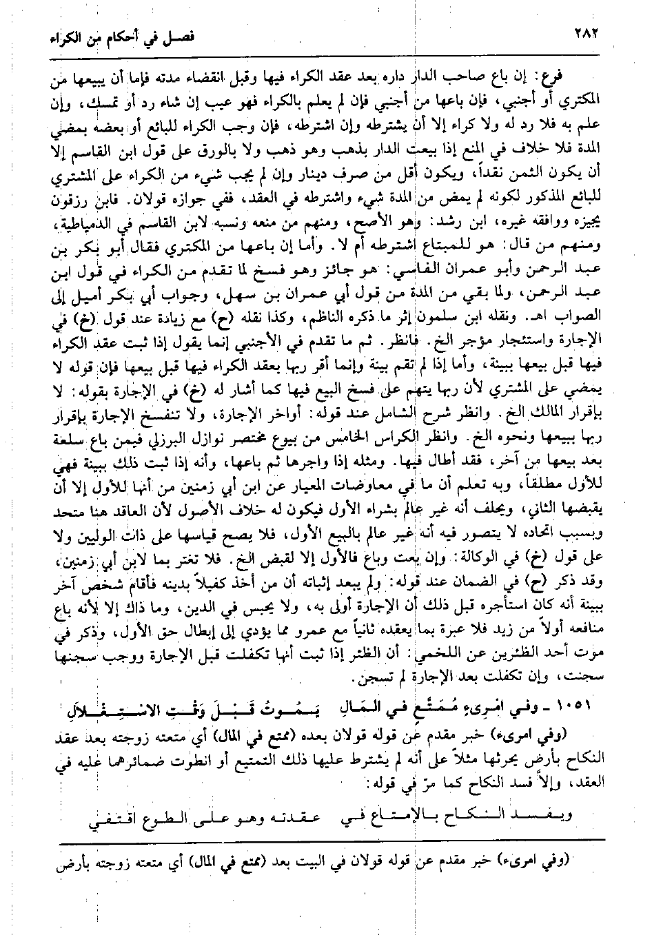 فرع: إِن بَاعَ صَاحب الدَّار دَاره بعد عقد الْكِرَاء فِيهَا وَقبل انْقِضَاء مدَّته فإمَّا أَن يَبِيعهَا من الْمُكْتَرِي أَو أَجْنَبِي، فَإِن بَاعهَا من أَجْنَبِي فَإِن لم يعلم بالكراء فَهُوَ عيب إِن شَاءَ رد أَو تمسك، وَإِن علم بِهِ فَلَا رد لَهُ وَلَا كِرَاء إِلَّا أَن يَشْتَرِطه وَإِن اشْتَرَطَهُ، فَإِن وَجب الْكِرَاء للْبَائِع أَو بعضه بِمُضِيِّ الْمدَّة فَلَا خلاف فِي الْمَنْع إِذا بِيعَتْ الدَّار بِذَهَب وَهُوَ ذهب وَلَا بالورق على قَول ابْن الْقَاسِم إِلَّا أَن يكون الثّمن نَقْدا، وَيكون أقل من صرف دِينَار وَإِن لم يجب شَيْء من الْكِرَاء على المُشْتَرِي للْبَائِع الْمَذْكُور لكَونه لم يمض من الْمدَّة شَيْء واشترطه فِي العقد، فَفِي جَوَازه قَولَانِ. فَابْن رزقون يُجِيزهُ وَوَافَقَهُ غَيره، ابْن رشد: وَهُوَ الْأَصَح، وَمِنْهُم من مَنعه وَنسبه لِابْنِ الْقَاسِم فِي الدمياطية، وَمِنْهُم من قَالَ: هُوَ للْمُبْتَاع اشْتَرَطَهُ أم لَا. وَأما إِن بَاعهَا من الْمُكْتَرِي فَقَالَ أَبُو بكر بن عبد الرَّحْمَن وَأَبُو عمرَان الفاسي: هُوَ جَائِز وَهُوَ فسخ لما تقدم من الْكِرَاء فِي قَول ابْن عبد الرَّحْمَن، وَلما بَقِي من الْمدَّة من قَول أبي عمرَان بن سهل، وَجَوَاب أبي بكر أميل إِلَى الصَّوَاب اه. وَنَقله ابْن سَلمُون إِثْر مَا ذكره النَّاظِم، وَكَذَا نَقله (ح) مَعَ زِيَادَة عِنْد قَول (خَ) فِي الْإِجَارَة واستئجار مؤجر الخ. فَانْظُر. ثمَّ مَا تقدم فِي الْأَجْنَبِيّ إِنَّمَا يَقُول إِذا ثَبت عقد الْكِرَاء فِيهَا قبل بيعهَا بِبَيِّنَة، وَأما إِذا لم تقم بَيِّنَة وَإِنَّمَا أقرّ رَبهَا بِعقد الْكِرَاء فِيهَا قبل بيعهَا فَإِن قَوْله لَا يمْضِي على المُشْتَرِي لِأَن رَبهَا يتهم على فسخ البيع فِيهَا كَمَا أَشَارَ لَهُ (خَ) فِي الْإِجَارَة بقوله: لَا بِإِقْرَار الْمَالِك الخ. وَانْظُر شرح الشَّامِل عِنْد قَوْله: أَوَاخِر الْإِجَارَة، وَلَا تَنْفَسِخ الْإِجَارَة بِإِقْرَار رَبهَا بِبَيْعِهَا وَنَحْوه الخ. وَانْظُر الكراس الْخَامِس من بُيُوع مُخْتَصر نَوَازِل الْبُرْزُليّ فِيمَن بَاعَ سلْعَة بعد بيعهَا من آخر، فقد أَطَالَ فِيهَا. وَمثله إِذا واجرها ثمَّ بَاعهَا، وَأَنه إِذا ثَبت ذَلِك بِبَيِّنَة فَهِيَ للْأولِ مُطلقًا، وَبِه تعلم أَن مَا فِي معاوضات المعيار عَن ابْن أبي زمنين من أَنَّهَا للْأولِ إِلَّا أَن يقبضهَا الثَّانِي، وَيحلف أَنه غير عَالم بشرَاء الأول فَيكون لَهُ خلاف الْأُصُول لِأَن الْعَاقِد هُنَا مُتحد وبسبب اتحاده لَا يتَصَوَّر فِيهِ أَنه غير عَالم بِالْبيعِ الأول، فَلَا يَصح قياسها على ذَات الوليين وَلَا على قَول (خَ) فِي الْوكَالَة: وَإِن بِعْت وَبَاعَ فَالْأول إِلَّا لقبض الخ. فَلَا تغتر بِمَا لِابْنِ أبي زمنين، وَقد ذكر (ح) فِي الضَّمَان عِنْد قَوْله: وَلم يبعد إثْبَاته أَن من أَخذ كَفِيلا بِدِينِهِ فَأَقَامَ شخص آخر بِبَيِّنَة أَنه كَانَ اسْتَأْجرهُ قبل ذَلِك أَن الْإِجَارَة أولى بِهِ، وَلَا يحبس فِي الدّين، وَمَا ذَاك إِلَّا لِأَنَّهُ بَاعَ مَنَافِعه أَولا من زيد فَلَا عِبْرَة بِمَا يعقده ثَانِيًا مَعَ عَمْرو مِمَّا يُؤَدِّي إِلَى إبِْطَال حق الأول، وَذكر فِي موت أحد الظئرين عَن اللَّخْمِيّ: أَن الظِّئْر إِذا ثَبت أَنَّهَا تكفلت قبل الْإِجَارَة وَوَجَب سجنها سجنت، وَإِن تكفلت بعد الْإِجَارَة لم تسجن. وَفِي امْرِىءٍ مُمَتَّعٍ فِي المَالِ يَمُوتُ قَبْلَ وَقْتِ الاسْتِغْلاَلِ (وَفِي امرىء) خبر مقدم عَن قَوْله قَولَانِ بعده (ممتع فِي المَال) أَي متعته زَوجته بعد عقد النِّكَاح بِأَرْض يحرثها مثلا على أَنه لم يشْتَرط عَلَيْهَا ذَلِك التمتيع أَو انطوت ضمائرهما عَلَيْهِ فِي العقد، وإلاَّ فسد النِّكَاح كَمَا مرّ فِي قَوْله: وَيفْسد النِّكَاح بالإمتاع فِي عقدته وَهُوَ على الطوع اقتفي