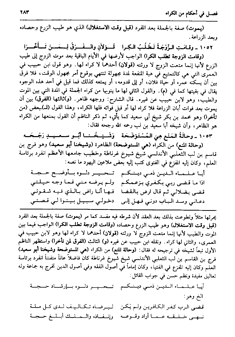 (يَمُوت) صفة بِالْجُمْلَةِ بعد الْمُفْرد (قبل وَقت الاستغلال) الَّذِي هُوَ طيب الزَّرْع وحصاده وَبعد الزِّرَاعَة. وقامَتِ الزَّوْجَةُ تَطْلُبُ الكِرا قَوْلاَنِ والفَرْقُ لِمَنْ تَأَخَّرَا (وَقَامَت الزَّوْجَة تطلب الكرا) الْوَاجِب لأرضها فِي الْأَيَّام الْبَاقِيَة بعد موت الزَّوْج إِلَى طيب الزَّرْع لِأَنَّهَا إِنَّمَا متعت الزَّوْج لَا ورثته (قَولَانِ) أَحدهمَا لَا كِرَاء لَهَا. وَهُوَ قَول ابْن حبيب فِي الْعُمْرَى الَّتِي هِيَ كالتمتيع فِي هبة الْمَنْفَعَة لمُدَّة مَجْهُولَة تَنْتَهِي بِوُقُوع أَمر مَجْهُول الْوَقْت، فَلَا فرق بَين أَن يسكنهُ عمره أَو حَيَاة فلَان، أَو إِلَى قدومه، أَو يمتعه كَذَلِك فَمَا قيل فِي أحد هَذِه الْوُجُوه يُقَال فِي بقيتها كَمَا فِي (م) . وَالْقَوْل الثَّانِي لَهَا مَا ينوبها من كِرَاء الْجُمْلَة فِي الْمدَّة الَّتِي بَين الْمَوْت وَالطّيب، وَهُوَ لِابْنِ حبيب عَن غَيره. قَالَ الشَّارِح: وَوَجهه ظَاهر. (و) ثَالِثهَا (الْفرق) بَين أَن يَمُوت بعد فَوَات أبان الزِّرَاعَة فَلَا كِرَاء لَهَا أَو قبل فَوَاته فلهَا الْكِرَاء، وَهَذَا القَوْل (ل) بعض (من تأخرا) وَهُوَ مُحَمَّد بن بكر شيخ أبي سعيد كَمَا يَأْتِي، ثمَّ ذكر النَّاظِم أَن القَوْل بمنعها من الْكِرَاء هُوَ الظَّاهِر، وَأَن شَيْخه أَبَا سعيد بن لب رَحمَه الله رَجحه فَقَالَ: وحالَةُ المَنْع هِيَ المُسْتَوْضَحَة وَشَيْخُنا أبُو سعيدٍ رَجّحَه (وَحَالَة الْمَنْع) من الْكِرَاء (هِيَ المستوضحة) الظَّاهِرَة (وَشَيخنَا أَبُو سعيد) وَهُوَ فرج بن قَاسم بن لب الثَّعْلَبِيّ الأندلسي شيخ شُيُوخ غرناطة وخطيب جَامعهَا الْأَعْظَم انْفَرد برئاسة الْعلم، وَكَانَ إِلَيْهِ المفزع فِي الْفَتْوَى كتب إِلَيْهِ بعض ملاعين الْيَهُود مَا نَصه: أيا عُلَمَاء الدّين ذمِّي دينكُمْ تحير دلوه بأوضح حجَّة اذا مَا قضى رَبِّي بكفري بزعمكم وَلم يرضه مني فَمَا وَجه حيلتي