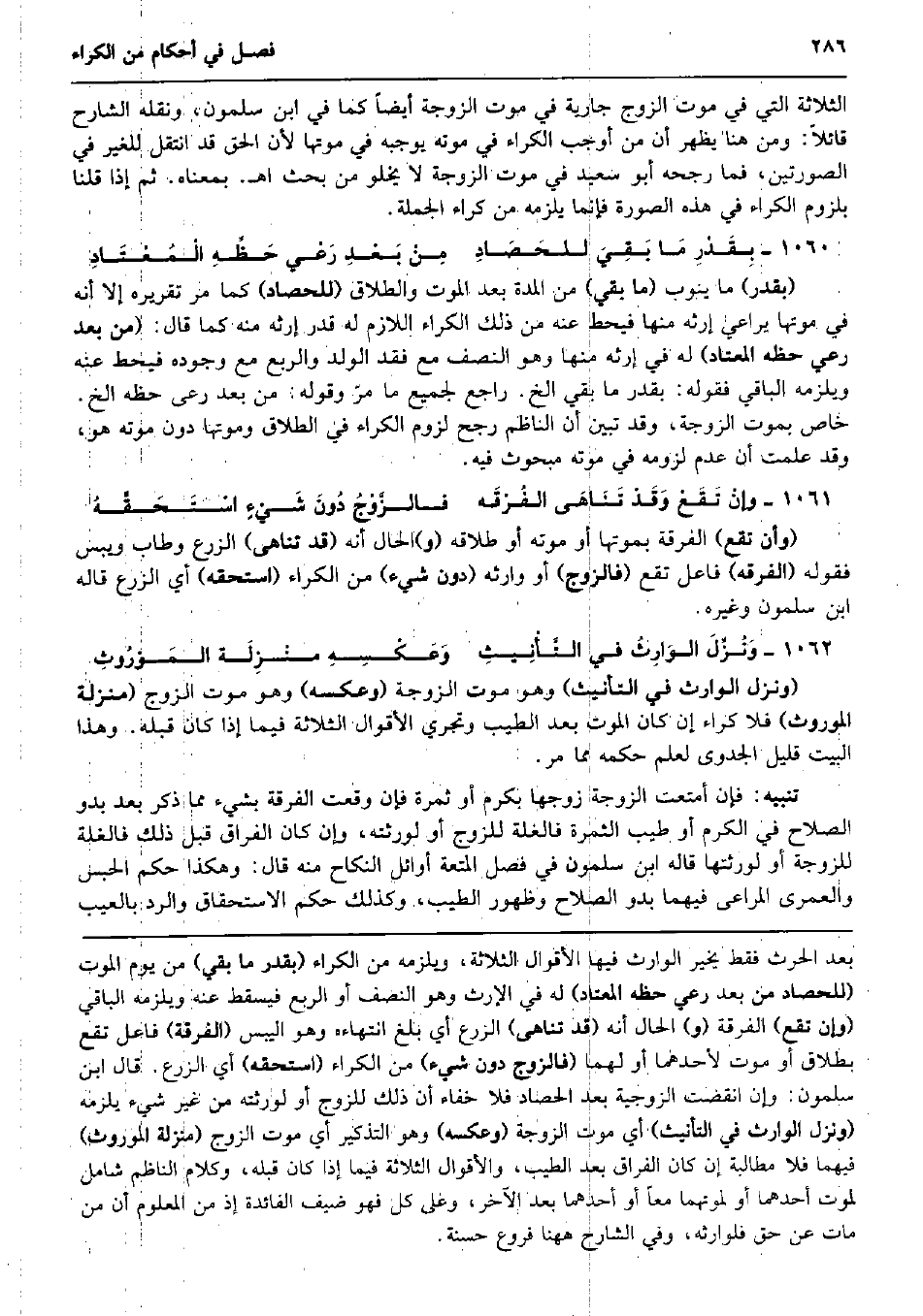 الثَّلَاثَة الَّتِي فِي موت الزَّوْج جَارِيَة فِي موت الزَّوْجَة أَيْضا كَمَا فِي ابْن سَلمُون، وَنَقله الشَّارِح قَائِلا: وَمن هُنَا يظْهر أَن من أوجب الْكِرَاء فِي مَوته يُوجِبهُ فِي مَوتهَا لِأَن الْحق قد انْتقل للْغَيْر فِي الصُّورَتَيْنِ، فَمَا رَجحه أَبُو سعيد فِي موت الزَّوْجَة لَا يَخْلُو من بحث اه. بِمَعْنَاهُ. ثمَّ إِذا قُلْنَا بِلُزُوم الْكِرَاء فِي هَذِه الصُّورَة فَإِنَّمَا يلْزمه من كِرَاء الْجُمْلَة. بِقَدْرِ مَا بَقِيَ للحَصَادِ مِنْ بَعْدِ رَعْي حَظِّهِ الْمُعْتَادِ (بِقدر) مَا يَنُوب (مَا بَقِي) من الْمدَّة بعد الْمَوْت وَالطَّلَاق (للحصاد) كَمَا مر تَقْرِيره إِلَّا أَنه فِي مَوتهَا يُرَاعِي إِرْثه مِنْهَا فيحط عَنهُ من ذَلِك الْكِرَاء اللَّازِم لَهُ قدر إِرْثه مِنْهُ كَمَا قَالَ: (من بعد رعي حَظه الْمُعْتَاد) لَهُ فِي إِرْثه مِنْهَا وَهُوَ النّصْف مَعَ فقد الْوَلَد وَالرّبع مَعَ وجوده فيحط عَنهُ وَيلْزمهُ الْبَاقِي فَقَوله: بِقدر مَا بَقِي الخ. رَاجع لجَمِيع مَا مرّ وَقَوله: من بعد رعى حَظه الخ. خَاص بِمَوْت الزَّوْجَة، وَقد تبين أَن النَّاظِم رجح لُزُوم الْكِرَاء فِي الطَّلَاق وموتها دون مَوته هُوَ، وَقد علمت أَن عدم لُزُومه فِي مَوته مبحوث فِيهِ. وإنْ تَقَعْ وَقَدْ تَنَاهَى الفُرْقَه فالزَّوْجُ دُونَ شَيْءٍ اسْتَحَقَّهُ (وَأَن تقع) الْفرْقَة بموتها أَو مَوته أَو طَلَاقه (و) الْحَال أَنه (قد تناهى) الزَّرْع وطاب ويبس فَقَوله (الفرقه) فَاعل تقع (فالزوج) أَو وَارثه (دون شَيْء) من الْكِرَاء (اسْتَحَقَّه) أَي الزَّرْع قَالَه ابْن سَلمُون وَغَيره. وَنُزِّلَ الوَارِثُ فِي التَّأْنِيثِ وَعَكْسِهِ منْزِلَة المَوْرُوثِ (وَنزل الْوَارِث فِي التَّأْنِيث) وَهُوَ موت الزَّوْجَة (وَعَكسه) وَهُوَ موت الزَّوْج (منزلَة الْمَوْرُوث) فَلَا كِرَاء إِن كَانَ الْمَوْت بعد الطّيب وتجري الْأَقْوَال الثَّلَاثَة فِيمَا إِذا كَانَ قبله. وَهَذَا الْبَيْت قَلِيل الجدوى لعلم حكمه مِمَّا مر. تَنْبِيه: فَإِن أمتعت الزَّوْجَة زَوجهَا بكرم أَو ثَمَرَة فَإِن وَقعت الْفرْقَة بِشَيْء مِمَّا ذكر بعد بَدو الصّلاح فِي الْكَرم أَو طيب الثَّمَرَة فالغلة للزَّوْج أَو لوَرثَته، وَإِن كَانَ الْفِرَاق قبل ذَلِك فالغلة للزَّوْجَة أَو لورثتها قَالَه ابْن سَلمُون فِي فصل الْمُتْعَة أَوَائِل النِّكَاح مِنْهُ قَالَ: وَهَكَذَا حكم الْحَبْس والعمرى المراعى فيهمَا بَدو الصّلاح وَظُهُور الطّيب، وَكَذَلِكَ حكم الِاسْتِحْقَاق وَالرَّدّ بِالْعَيْبِ