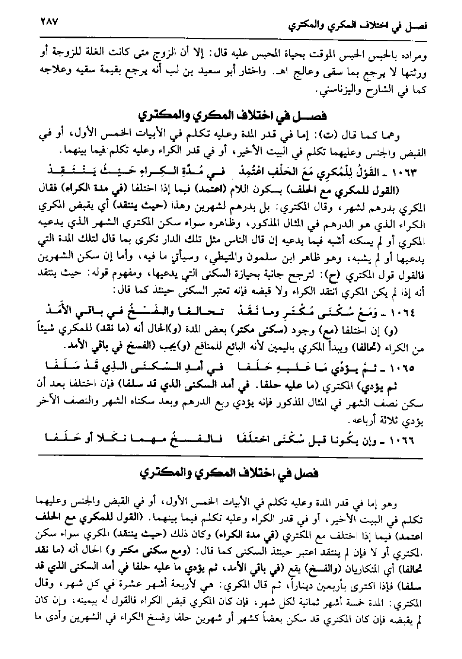 وهما كَمَا قَالَ (ت) : إِمَّا فِي قدر الْمدَّة وَعَلِيهِ تكلم فِي الأبيات الْخمس الأول، أَو فِي الْقَبْض وَالْجِنْس وَعَلَيْهِمَا تكلم فِي الْبَيْت الْأَخير، أَو فِي قدر الْكِرَاء وَعَلِيهِ تكلم فِيمَا بَينهمَا. القَوْلُ لِلْمُكرِي مَعَ الحَلْفِ اعْتُمِدْ فِي مُدَّةِ الكِراءِ حَيْثُ يَنْتَقِدْ (القَوْل للمكري مَعَ الْحلف) بِسُكُون اللَّام (اعْتمد) فِيمَا إِذا اخْتلفَا (فِي مُدَّة الْكِرَاء) فَقَالَ الْمكْرِي بدرهم لشهر، وَقَالَ الْمُكْتَرِي: بل بدرهم لشهرين وَهَذَا (حَيْثُ ينْتَقد) أَي يقبض الْمكْرِي الْكِرَاء الَّذِي هُوَ الدِّرْهَم فِي الْمِثَال الْمَذْكُور، وَظَاهره سَوَاء سكن الْمُكْتَرِي الشَّهْر الَّذِي يَدعِيهِ الْمكْرِي أَو لم يسكنهُ أشبه فِيمَا يَدعِيهِ إِن قَالَ النَّاس مثل تِلْكَ الدَّار تكرى بِمَا قَالَ لتِلْك الْمدَّة الَّتِي يدعيها أَو لم يشبه، وَهُوَ ظَاهر ابْن سَلمُون والمتيطي، وَسَيَأْتِي مَا فِيهِ، وَأما إِن سكن الشَّهْرَيْنِ فَالْقَوْل قَول الْمُكْتَرِي (ح) : لترجح جانبة بحيازة السُّكْنَى الَّتِي يدعيها، وَمَفْهُوم قَوْله: حَيْثُ ينْتَقد أَنه إِذا لم يكن الْمكْرِي انتقد الْكِرَاء وَلَا قَبضه فَإِنَّهُ تعْتَبر السُّكْنَى حِينَئِذٍ كَمَا قَالَ: وَمَعْ سُكْنَى مُكْتَرِ وَمَا نَقَدْ تحَالفا والفَسْخُ فِي بَاقِي الأَمَدْ (و) إِن اخْتلفَا (مَعَ) وجود (سُكْنى مكتر) بعض الْمدَّة (و) الْحَال أَنه (مَا نقد) للمكري شَيْئا من الْكِرَاء (تحَالفا) وَيبدأ الْمكْرِي بِالْيَمِينِ لِأَنَّهُ البَائِع للمنافع (و) يجب (الْفَسْخ فِي بَاقِي الأمد. ثمَّ يؤدِّي مَا عَليهِ حَلَفا فِي أمدِ السّكنَى الذِي قَدْ سَلَفَا ثمَّ يُؤَدِّي) الْمُكْتَرِي (مَا عَلَيْهِ حلفا. فِي أمد السُّكْنَى الَّذِي قد سلفا) فَإِن اخْتلفَا بعد أَن سكن نصف الشَّهْر فِي الْمِثَال الْمَذْكُور فَإِنَّهُ يُؤَدِّي ربع الدِّرْهَم وَبعد سكناهُ الشَّهْر وَالنّصف الآخر يُؤَدِّي ثَلَاثَة أَرْبَاعه. وَإِن يكُونا قبل سُكْنَى اختلَفَا فالفسخُ مهما نكَلا أَو حَلَفا