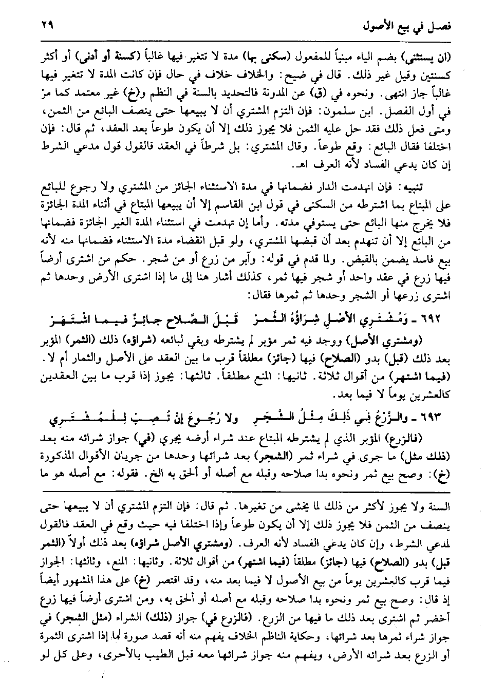 (ان يسْتَثْنى) بِضَم الْيَاء مَبْنِيا للْمَفْعُول (سُكْنى بهَا) مُدَّة لَا تَتَغَيَّر فِيهَا غَالِبا (كَسنة أَو أدنى) أَو أَكثر كسنتين وَقيل غير ذَلِك. قَالَ فِي ضيح: وَالْخلاف خلاف فِي حَال فَإِن كَانَت الْمدَّة لَا تَتَغَيَّر فِيهَا غَالِبا جَازَ انْتهى. وَنَحْوه فِي (ق) عَن الْمُدَوَّنَة فالتحديد بِالسنةِ فِي النّظم و (خَ) غير مُعْتَمد كَمَا مرّ فِي أول الْفَصْل. ابْن سَلمُون: فَإِن الْتزم المُشْتَرِي أَن لَا يَبِيعهَا حَتَّى ينصف البَائِع من الثّمن، وَمَتى فعل ذَلِك فقد حل عَلَيْهِ الثّمن فَلَا يجوز ذَلِك إِلَّا أَن يكون طَوْعًا بعد العقد، ثمَّ قَالَ: فَإِن اخْتلفَا فَقَالَ البَائِع: وَقع طَوْعًا. وَقَالَ المُشْتَرِي: بل شرطا فِي العقد فَالْقَوْل قَول مدعي الشَّرْط إِن كَانَ يَدعِي الْفساد لِأَنَّهُ الْعرف اه. تَنْبِيه: فَإِن انْهَدَمت الدَّار فضمانها فِي مُدَّة الِاسْتِثْنَاء الْجَائِز من المُشْتَرِي وَلَا رُجُوع للْبَائِع على الْمُبْتَاع بِمَا اشْتَرَطَهُ من السُّكْنَى فِي قَول ابْن الْقَاسِم إِلَّا أَن يَبِيعهَا الْمُبْتَاع فِي أثْنَاء الْمدَّة الْجَائِزَة فَلَا يخرج مِنْهَا البَائِع حَتَّى يَسْتَوْفِي مدَّته. وَأما إِن تهدمت فِي اسْتثِْنَاء الْمدَّة الْغَيْر الْجَائِزَة فضمانها من البَائِع إِلَّا أَن تنهدم بعد أَن قبضهَا المُشْتَرِي، وَلَو قبل انْقِضَاء مُدَّة الِاسْتِثْنَاء فضمانها مِنْهُ لِأَنَّهُ بيع فَاسد يضمن بِالْقَبْضِ. وَلما قدم فِي قَوْله: وآبر من زرع أَو من شجر. حكم من اشْترى أَرضًا فِيهَا زرع فِي عقد وَاحِد أَو شجر فِيهَا ثَمَر، كَذَلِك أَشَارَ هُنَا إِلَى مَا إِذا اشْترى الأَرْض وَحدهَا ثمَّ اشْترى زَرعهَا أَو الشّجر وَحدهَا ثمَّ ثَمَرهَا فَقَالَ: وَمُشْتَرِي الأصْلِ شِرَاؤُهُ الثَّمرْ قَبْلَ الصَّلاح جائِزٌ فِيمَا اشْتَهَرْ (ومشتري الأَصْل) وَوجد فِيهِ ثَمَر مؤبر لم يَشْتَرِطه وَبَقِي لبَائِعه (شِرَاؤُهُ) ذَلِك (الثَّمر) المؤبر بعد ذَلِك (قبل) بَدو (الصّلاح) فِيهَا (جَائِز) مُطلقًا قرب مَا بَين العقد على الأَصْل وَالثِّمَار أم لَا. (فِيمَا اشْتهر) من أَقْوَال ثَلَاثَة. ثَانِيهَا: الْمَنْع مُطلقًا. ثَالِثهَا: يجوز إِذا قرب مَا بَين الْعقْدَيْنِ كالعشرين يَوْمًا لَا فِيمَا بعد. والزَّرْعُ فِي ذَلِكَ مِثْلُ الشَّجَرِ وَلَا رُجُوعَ إنْ تُصِبْ لِلْمُشْتَرِي (فالزرع) المؤبر الَّذِي لم يَشْتَرِطه الْمُبْتَاع عِنْد شِرَاء أرضه يجْرِي (فِي) جَوَاز شِرَائِهِ مِنْهُ بعد (ذَلِك مثل) مَا جرى فِي شِرَاء ثَمَر (الشّجر) بعد شِرَائهَا وَحدهَا من جَرَيَان الْأَقْوَال الْمَذْكُورَة (خَ) : وَصَحَّ بيع ثَمَر وَنَحْوه بدا صَلَاحه وَقَبله مَعَ أَصله أَو ألحق بِهِ الخ. فَقَوله: مَعَ أَصله هُوَ مَا تقدم