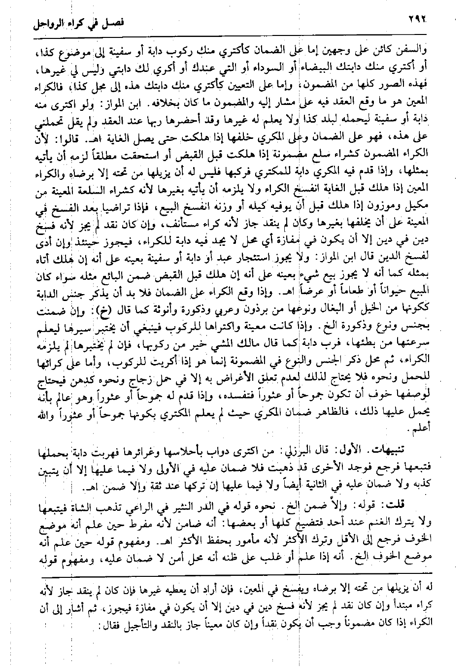 والسفن كَائِن على وَجْهَيْن إِمَّا على الضَّمَان كأكتري مِنْك ركُوب دَابَّة أَو سفينة إِلَى مَوْضُوع كَذَا، أَو أكتري مِنْك دابتك الْبَيْضَاء أَو السَّوْدَاء أَو الَّتِي عنْدك أَو أَكْرِي لَك دَابَّتي وَلَيْسَ لي غَيرهَا، فَهَذِهِ الصُّور كلهَا من الْمَضْمُون، وَإِمَّا على التَّعْيِين كأكتري مِنْك دابتك هَذِه إِلَى مَحل كَذَا، فالكراء الْمعِين هُوَ مَا وَقع العقد فِيهِ على مشار إِلَيْهِ والمضمون مَا كَانَ بِخِلَافِهِ. ابْن الْمَوَّاز: وَلَو اكترى مِنْهُ دَابَّة أَو سفينة ليحمله لبلد كَذَا وَلَا يعلم لَهُ غَيرهَا وَقد أحضرها رَبهَا عِنْد العقد وَلم يقل تحملنِي على هَذِه، فَهُوَ على الضَّمَان وعَلى الْمكْرِي خلفهَا إِذا هَلَكت حَتَّى يصل الْغَايَة اه. قَالُوا: لِأَن الْكِرَاء الْمَضْمُون كَشِرَاء سلع مَضْمُونَة إِذا هَلَكت قبل الْقَبْض أَو اسْتحقَّت مُطلقًا لزمَه أَن يَأْتِيهِ بِمِثْلِهَا، وَإِذا قدم فِيهِ الْمكْرِي دَابَّة للمكتري فركبها فَلَيْسَ لَهُ أَن يزيلها من تَحْتَهُ إِلَّا بِرِضَاهُ والكراء الْمعِين إِذا هلك قبل الْغَايَة انْفَسَخ الْكِرَاء وَلَا يلْزمه أَن يَأْتِيهِ بغَيْرهَا لِأَنَّهُ كَشِرَاء السّلْعَة الْمعينَة من مَكِيل وموزون إِذا هلك قبل أَن يُوفيه كَيْله أَو وَزنه انْفَسَخ البيع، فَإِذا تَرَاضيا بعد الْفَسْخ فِي الْمعينَة على أَن يخلفها بغَيْرهَا وَكَانَ لم ينْقد جَازَ لِأَنَّهُ كِرَاء مُسْتَأْنف، وَإِن كَانَ نقد لم يجز لِأَنَّهُ فسخ دين فِي دين إِلَّا أَن يكون فِي مفازة أَي مَحل لَا يجد فِيهِ دَابَّة للكراء، فَيجوز حِينَئِذٍ وَإِن أدّى لفسخ الدّين قَالَ ابْن الْمَوَّاز: وَلَا يجوز اسْتِئْجَار عبد أَو دَابَّة أَو سفينة بِعَيْنِه على أَنه إِن هلك أَتَاهُ بِمثلِهِ كَمَا أَنه لَا يجوز بيع شَيْء بِعَيْنِه على أَنه إِن هلك قبل الْقَبْض ضمن البَائِع مثله سَوَاء كَانَ الْمَبِيع حَيَوَانا أَو طَعَاما أَو عرضا اه. وَإِذا وَقع الْكِرَاء على الضَّمَان فَلَا بُد أَن يذكر جنس الدَّابَّة ككونها من الْخَيل أَو البغال ونوعها من برذون وعربي وذكورة وأنوثة كَمَا قَالَ (خَ) : وَإِن ضمنت بِجِنْس وَنَوع وذكورة الخ. وَإِذا كَانَت مُعينَة واكتراها للرُّكُوب فَيَنْبَغِي أَن يختبر سَيرهَا ليعلم سرعتها من بطئها، فَرب دَابَّة كَمَا قَالَ مَالك الْمَشْي خير من ركُوبهَا، فَإِن لم يختبرها لم يلْزمه الْكِرَاء، ثمَّ مَحل ذكر الْجِنْس وَالنَّوْع فِي الْمَضْمُونَة إِنَّمَا هُوَ إِذا أكريت للرُّكُوب، وَأما على كرائها للْحَمْل وَنَحْوه فَلَا يحْتَاج لذَلِك لعدم تعلق الْأَغْرَاض بِهِ إِلَّا فِي حمل زجاج وَنَحْوه كدهن فَيحْتَاج لوصفها خوف أَن تكون جموحاً أَو عثوراً فتفسده، وَإِذا قدم لَهُ جموحاً أَو عثوراً وَهُوَ عَالم بِأَنَّهُ يحمل عَلَيْهَا ذَلِك، فَالظَّاهِر ضَمَان الْمكْرِي حَيْثُ لم يعلم الْمُكْتَرِي بِكَوْنِهَا جموحاً أَو عثوراً وَالله أعلم. تَنْبِيهَات. الأول: قَالَ الْبُرْزُليّ: من اكترى دَوَاب بأحلاسها وغرائرها فهربت دَابَّة بحملها فتبعها فَرجع فَوجدَ الْأُخْرَى قد ذهبت فَلَا ضَمَان عَلَيْهِ فِي الأولى وَلَا فِيمَا عَلَيْهَا إِلَّا أَن يتَبَيَّن كذبه وَلَا ضَمَان عَلَيْهِ فِي الثَّانِيَة أَيْضا وَلَا فِيمَا عَلَيْهَا إِن تَركهَا عِنْد ثِقَة وَإِلَّا ضمن اه. قلت: قَوْله: وإلاَّ ضمن الخ. نَحوه قَوْله فِي الدّرّ النثير فِي الرَّاعِي تذْهب الشَّاة فيتبعها وَلَا يتْرك الْغنم عِنْد أحد فتضيع كلهَا أَو بَعْضهَا: أَنه ضَامِن لِأَنَّهُ مفرط حِين علم أَنه مَوضِع الْخَوْف فَرجع إِلَى الْأَقَل وَترك الْأَكْثَر لِأَنَّهُ مَأْمُور بِحِفْظ الْأَكْثَر اه. وَمَفْهُوم قَوْله حِين علم أَنه مَوضِع الْخَوْف الخ. أَنه إِذا علم أَو غلب على ظَنّه أَنه مَحل أَمن لَا ضَمَان عَلَيْهِ، وَمَفْهُوم قَوْله