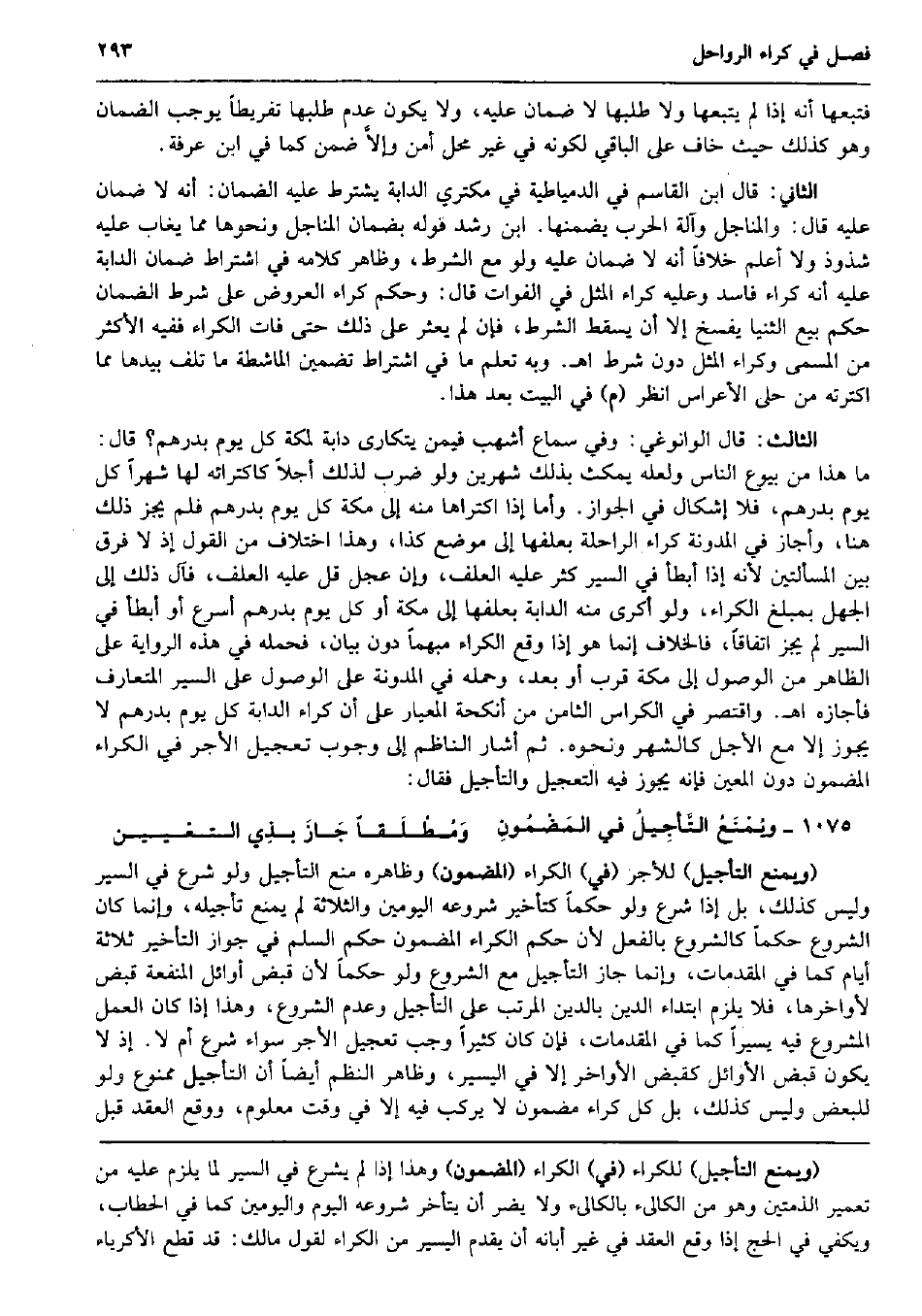 فتبعها أَنه إِذا لم يتبعهَا وَلَا طلبَهَا لَا ضَمَان عَلَيْهِ، وَلَا يكون عدم طلبَهَا تفريطاً يُوجب الضَّمَان وَهُوَ كَذَلِك حَيْثُ خَافَ على الْبَاقِي لكَونه فِي غير مَحل أَمن وإلاَّ ضمن كَمَا فِي ابْن عَرَفَة. الثَّانِي: قَالَ ابْن الْقَاسِم فِي الدمياطية فِي مكتري الدَّابَّة يشْتَرط عَلَيْهِ الضَّمَان: أَنه لَا ضَمَان عَلَيْهِ قَالَ: والمناجل وَآلَة الْحَرْب يضمنهَا. ابْن رشد قَوْله بِضَمَان المناجل وَنَحْوهَا مِمَّا يُغَاب عَلَيْهِ شذوذ وَلَا أعلم خلافًا أَنه لَا ضَمَان عَلَيْهِ وَلَو مَعَ الشَّرْط، وَظَاهر كَلَامه فِي اشْتِرَاط ضَمَان الدَّابَّة عَلَيْهِ أَنه كِرَاء فَاسد وَعَلِيهِ كِرَاء الْمثل فِي الْفَوات قَالَ: وَحكم كِرَاء الْعرُوض على شَرط الضَّمَان حكم بيع الثنيا يفْسخ إِلَّا أَن يسْقط الشَّرْط، فَإِن لم يعثر على ذَلِك حَتَّى فَاتَ الْكِرَاء فَفِيهِ الْأَكْثَر من الْمُسَمّى وكراء الْمثل دون شَرط اه. وَبِه تعلم مَا فِي اشْتِرَاط تضمين الماشطة مَا تلف بِيَدِهَا مِمَّا اكترته من حلى الأعراس انْظُر (م) فِي الْبَيْت بعد هَذَا. الثَّالِث: قَالَ الوانوغي: وَفِي سَماع أَشهب فِيمَن يتكارى دَابَّة لمَكَّة كل يَوْم بدرهم؟ قَالَ: مَا هَذَا من بُيُوع النَّاس وَلَعَلَّه يمْكث بذلك شَهْرَيْن وَلَو ضرب لذَلِك أَََجَلًا كاكترائه لَهَا شهرا كل يَوْم بدرهم، فَلَا إِشْكَال فِي الْجَوَاز. وَأما إِذا اكتراها مِنْهُ إِلَى مَكَّة كل يَوْم بدرهم فَلم يجز ذَلِك هُنَا، وَأَجَازَ فِي الْمُدَوَّنَة كِرَاء الرَّاحِلَة بعلفها إِلَى مَوضِع كَذَا، وَهَذَا اخْتِلَاف من القَوْل إِذْ لَا فرق بَين الْمَسْأَلَتَيْنِ لِأَنَّهُ إِذا أَبْطَأَ فِي السّير كثر عَلَيْهِ الْعلف، وَإِن عجل قل عَلَيْهِ الْعلف، فآل ذَلِك إِلَى الْجَهْل بمبلغ الْكِرَاء، وَلَو أكرى مِنْهُ الدَّابَّة بعلفها إِلَى مَكَّة أَو كل يَوْم بدرهم أسْرع أَو أَبْطَأَ فِي السّير لم يجز اتِّفَاقًا، فَالْخِلَاف إِنَّمَا هُوَ إِذا وَقع الْكِرَاء مُبْهما دون بَيَان، فَحَمله فِي هَذِه الرِّوَايَة على الظَّاهِر من الْوُصُول إِلَى مَكَّة قرب أَو بعد، وَحمله فِي الْمُدَوَّنَة على الْوُصُول على السّير الْمُتَعَارف فَأَجَازَهُ اه. وَاقْتصر فِي الكراس الثَّامِن من أنكحة المعيار على أَن كِرَاء الدَّابَّة كل يَوْم بدرهم لَا يجوز إِلَّا مَعَ الْأَجَل كالشهر وَنَحْوه. ثمَّ أَشَارَ النَّاظِم إِلَى وجوب تَعْجِيل الْأجر فِي الْكِرَاء الْمَضْمُون دون الْمعِين فَإِنَّهُ يجوز فِيهِ التَّعْجِيل والتأجيل فَقَالَ: ويُمْنَعُ التَّأجِيلُ فِي المَضْمُونِ وَمُطْلَقاً جَازَ بذِي التعْيين (وَيمْنَع التَّأْجِيل) لِلْأجرِ (فِي) الْكِرَاء (الْمَضْمُون) وَظَاهره منع التَّأْجِيل وَلَو شرع فِي السّير وَلَيْسَ كَذَلِك، بل إِذا شرع وَلَو حكما كتأخير شُرُوعه الْيَوْمَيْنِ وَالثَّلَاثَة لم يمْنَع تَأْجِيله، وَإِنَّمَا كَانَ الشُّرُوع حكما كالشروع بِالْفِعْلِ لِأَن حكم الْكِرَاء الْمَضْمُون حكم السّلم فِي جَوَاز التَّأْخِير ثَلَاثَة أَيَّام كَمَا فِي الْمُقدمَات، وَإِنَّمَا جَازَ التَّأْجِيل مَعَ الشُّرُوع وَلَو حكما لِأَن قبض أَوَائِل الْمَنْفَعَة قبض لأواخرها، فَلَا يلْزم ابْتِدَاء الدّين بِالدّينِ الْمُرَتّب على التَّأْجِيل وَعدم الشُّرُوع، وَهَذَا إِذا كَانَ الْعَمَل الْمَشْرُوع فِيهِ يَسِيرا كَمَا فِي الْمُقدمَات، فَإِن كَانَ كثيرا وَجب تَعْجِيل الْأجر سَوَاء شرع أم لَا. إِذْ لَا يكون قبض الْأَوَائِل كقبض الْأَوَاخِر إِلَّا فِي الْيَسِير، وَظَاهر النّظم أَيْضا أَن التَّأْجِيل مَمْنُوع وَلَو للْبَعْض وَلَيْسَ كَذَلِك، بل كل كِرَاء مَضْمُون لَا يركب فِيهِ إِلَّا فِي وَقت مَعْلُوم، وَوَقع العقد قبل