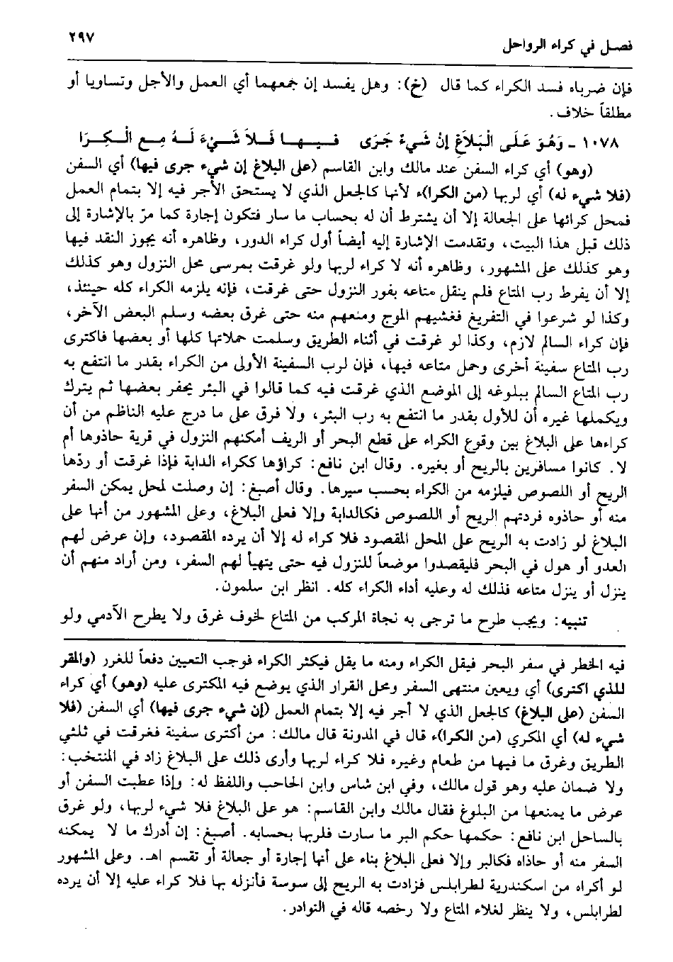 فَإِن ضرباه فسد الْكِرَاء كَمَا قَالَ (خَ) : وَهل يفْسد إِن جَمعهمَا أَي الْعَمَل وَالْأَجَل وتساويا أَو مُطلقًا خلاف. وَهُوَ عَلَى الْبَلاَغِ إنْ شَيءٌ جَرَى فِيهَا فَلاَ شَيْءَ لَهُ مِع الْكِرَا (وَهُوَ) أَي كِرَاء السفن عِنْد مَالك وَابْن الْقَاسِم (على الْبَلَاغ إِن شَيْء جرى فِيهَا) أَي السفن (فَلَا شَيْء لَهُ) أَي لِرَبِّهَا (من الكرا) ء لِأَنَّهَا كالجعل الَّذِي لَا يسْتَحق الْأجر فِيهِ إِلَّا بِتمَام الْعَمَل فَمحل كرائها على الْجعَالَة إِلَّا أَن يشْتَرط أَن لَهُ بِحِسَاب مَا سَار فَتكون إِجَارَة كَمَا مرّ بِالْإِشَارَةِ إِلَى ذَلِك قبل هَذَا الْبَيْت، وَتَقَدَّمت الْإِشَارَة إِلَيْهِ أَيْضا أول كِرَاء الدّور، وَظَاهره أَنه يجوز النَّقْد فِيهَا وَهُوَ كَذَلِك على الْمَشْهُور، وَظَاهره أَنه لَا كِرَاء لِرَبِّهَا وَلَو غرقت بمرسى مَحل النُّزُول وَهُوَ كَذَلِك إِلَّا أَن يفرط رب الْمَتَاع فَلم ينْقل مَتَاعه بفور النُّزُول حَتَّى غرقت، فَإِنَّهُ يلْزمه الْكِرَاء كُله حِينَئِذٍ، وَكَذَا لَو شرعوا فِي التفريغ فغشيهم الموج ومنعهم مِنْهُ حَتَّى غرق بعضه وَسلم الْبَعْض الآخر، فَإِن كِرَاء السَّالِم لَازم، وَكَذَا لَو غرقت فِي أثْنَاء الطَّرِيق وسلمت حملاتها كلهَا أَو بَعْضهَا فاكترى رب الْمَتَاع سفينة أُخْرَى وَحمل مَتَاعه فِيهَا، فَإِن لرب السَّفِينَة الأولى من الْكِرَاء بِقدر مَا انْتفع بِهِ رب الْمَتَاع السَّالِم بِبُلُوغِهِ إِلَى الْموضع الَّذِي غرقت فِيهِ كَمَا قَالُوا فِي الْبِئْر يحْفر بَعْضهَا ثمَّ يتْرك ويكملها غَيره أَن للْأولِ بِقدر مَا انْتفع بِهِ رب الْبِئْر، وَلَا فرق على مَا درج عَلَيْهِ النَّاظِم من أَن كراءها على الْبَلَاغ بَين وُقُوع الْكِرَاء على قطع الْبَحْر أَو الرِّيف أمكنهم النُّزُول فِي قَرْيَة حاذوها أم لَا. كَانُوا مسافرين بِالرِّيحِ أَو بِغَيْرِهِ. وَقَالَ ابْن نَافِع: كراؤها ككراء الدَّابَّة فَإِذا غرقت أَو ردّها الرّيح أَو اللُّصُوص فَيلْزمهُ من الْكِرَاء بِحَسب سَيرهَا. وَقَالَ أصبغ: إِن وصلت لمحل يُمكن السّفر مِنْهُ أَو حاذوه فردتهم الرّيح أَو اللُّصُوص فكالدابة وَإِلَّا فعلى الْبَلَاغ، وعَلى الْمَشْهُور من أَنَّهَا على الْبَلَاغ لَو زَادَت بِهِ الرّيح على الْمحل الْمَقْصُود فَلَا كِرَاء لَهُ إِلَّا أَن يردهُ الْمَقْصُود، وَإِن عرض لَهُم الْعَدو أَو هول فِي الْبَحْر فليقصدوا موضعا للنزول فِيهِ حَتَّى يتهيأ لَهُم السّفر، وَمن أَرَادَ مِنْهُم أَن ينزل أَو ينزل مَتَاعه فَذَلِك لَهُ وَعَلِيهِ أَدَاء الْكِرَاء كُله. انْظُر ابْن سَلمُون. تَنْبِيه: وَيجب طرح مَا ترجى بِهِ نجاة الْمركب من الْمَتَاع لخوف غرق وَلَا يطْرَح الْآدَمِيّ وَلَو