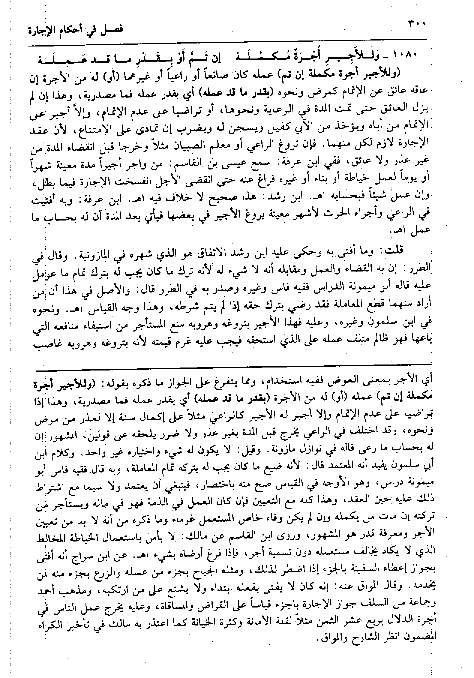 وَلْلأَجِيرِ أُجْرَةٌ مُكمَّلَهْ إِن تَمَّ أَوْ بِقَدْرِ مَا قد عَمِلَهْ (وللأجير أُجْرَة مكملة إِن تمّ) عمله كَانَ صانعاً أَو رَاعيا أَو غَيرهمَا (أَو) لَهُ من الْأُجْرَة إِن عاقه عائق عَن الْإِتْمَام كَمَرَض وَنَحْوه (بِقدر مَا قد عمله) أَي بِقدر عمله فَمَا مَصْدَرِيَّة، وَهَذَا إِن لم يزل العائق حَتَّى تمت الْمدَّة فِي الرِّعَايَة وَنَحْوهَا، أَو تَرَاضيا على عدم الْإِتْمَام، وإلاَّ أجبر على الْإِتْمَام من أَبَاهُ وَيُؤْخَذ من الآبي كَفِيل ويسجن لَهُ وَيضْرب إِن تَمَادى على الِامْتِنَاع، لِأَن عقد الْإِجَارَة لَازم لكل مِنْهُمَا. فَإِن تروغ الرَّاعِي أَو معلم الصّبيان مثلا وخرجا قبل انْقِضَاء الْمدَّة من غير عذر وَلَا عائق، فَفِي ابْن عَرَفَة: سمع عِيسَى بن الْقَاسِم: من واجر أَجِيرا مُدَّة مُعينَة شهرا أَو يَوْمًا لعمل خياطَة أَو بِنَاء أَو غَيره فرَاغ عَنهُ حَتَّى انْقَضى الْأَجَل انْفَسَخت الْإِجَارَة فِيمَا بَطل، وَإِن عمل شَيْئا فبحسابه اه. ابْن رشد: هَذَا صَحِيح لَا خلاف فِيهِ اه. ابْن عَرَفَة: وَبِه أَفْتيت فِي الرَّاعِي وأجراء الْحَرْث لأشهر مُعينَة يروغ الْأَجِير فِي بَعْضهَا فَيَأْتِي بعد الْمدَّة أَن لَهُ بِحِسَاب مَا عمل اه. قلت: وَمَا أفتى بِهِ وَحكى عَلَيْهِ ابْن رشد الِاتِّفَاق هُوَ الَّذِي شهره فِي المازونية. وَقَالَ فِي الطرر: إِن بِهِ الْقَضَاء وَالْعَمَل وَمُقَابِله أَنه لَا شَيْء لَهُ لِأَنَّهُ ترك مَا كَانَ يجب لَهُ بترك تَمام مَا عومل عَلَيْهِ قَالَه أَبُو مَيْمُونَة الدراس فَقِيه فاس وَغَيره وَصدر بِهِ فِي الطرر قَالَ: وَالْأَصْل فِي هَذَا أَن من أَرَادَ مِنْهُمَا قطع الْمُعَامَلَة فقد رَضِي بترك حَقه إِذا لم يتم شَرطه، وَهَذَا وَجه الْقيَاس اه. وَنَحْوه فِي ابْن سَلمُون وَغَيره، وَعَلِيهِ فَهَذَا الْأَجِير بتروغه وهروبه منع الْمُسْتَأْجر من اسْتِيفَاء مَنَافِعه الَّتِي بَاعهَا فَهُوَ ظَالِم متْلف عمله على الَّذِي اسْتَحَقَّه فَيجب عَلَيْهِ غرم قِيمَته لِأَنَّهُ بتروغه وهروبه غَاصِب