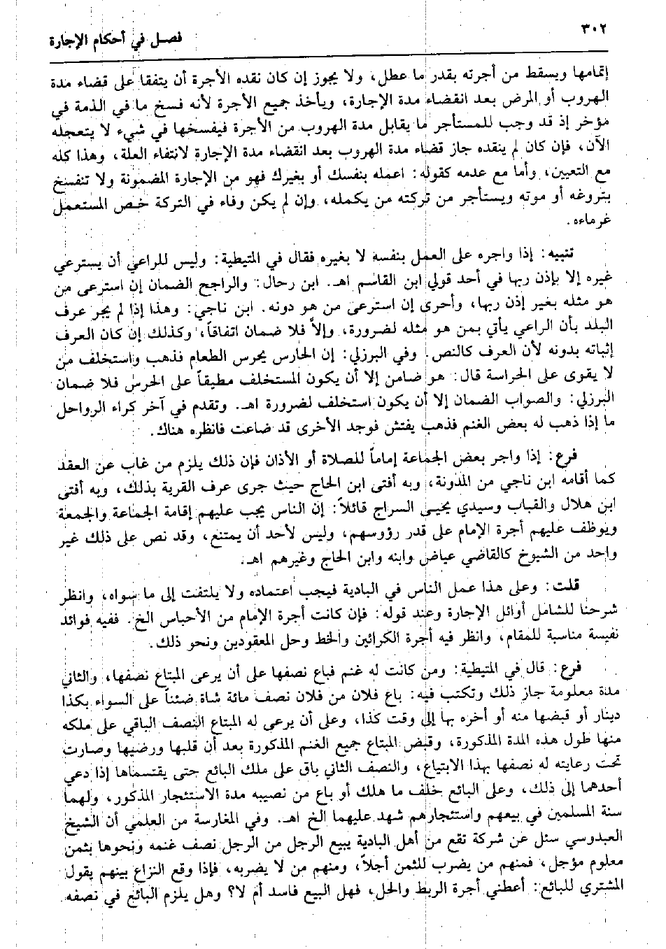 إِتْمَامهَا وَيسْقط من أجرته بِقدر مَا عطل، وَلَا يجوز إِن كَانَ نَقده الْأُجْرَة أَن يتَّفقَا على قَضَاء مُدَّة الهروب أَو الْمَرَض بعد انْقِضَاء مُدَّة الْإِجَارَة وَيَأْخُذ جَمِيع الْأُجْرَة لِأَنَّهُ فسخ مَا فِي الذِّمَّة فِي مُؤخر إِذْ قد وَجب للْمُسْتَأْجر مَا يُقَابل مُدَّة الهروب من الْأُجْرَة فيفسخها فِي شَيْء لَا يتعجله الْآن، فَإِن كَانَ لم ينقده جَازَ قَضَاء مُدَّة الهروب بعد انْقِضَاء مُدَّة الْإِجَارَة لانْتِفَاء الْعلَّة، وَهَذَا كُله مَعَ التَّعْيِين، وَأما مَعَ عَدمه كَقَوْلِه: اعمله بِنَفْسِك أَو بغيرك فَهُوَ من الْإِجَارَة الْمَضْمُونَة وَلَا تَنْفَسِخ بتروغه أَو مَوته ويستأجر من تركته من يكمله، وَإِن لم يكن وَفَاء فِي التَّرِكَة خص الْمُسْتَعْمل غرماءه. تَنْبِيه: إِذا واجره على الْعَمَل بِنَفسِهِ لَا بِغَيْرِهِ فَقَالَ فِي الْمُتَيْطِيَّة: وَلَيْسَ لِلرَّاعِي أَن يسترعي غَيره إِلَّا بِإِذن رَبهَا فِي أحد قولي ابْن الْقَاسِم اه. ابْن رحال: وَالرَّاجِح الضَّمَان إِن استرعى من هُوَ مثله بِغَيْر إِذن رَبهَا، وَأَحْرَى إِن استرعى من هُوَ دونه. ابْن نَاجِي: وَهَذَا إِذا لم يجر عرف الْبَلَد بِأَن الرَّاعِي يَأْتِي بِمن هُوَ مثله لضَرُورَة، وإلاَّ فَلَا ضَمَان اتِّفَاقًا، وَكَذَلِكَ إِن كَانَ الْعرف إثْبَاته بِدُونِهِ لِأَن الْعرف كالنص. وَفِي الْبُرْزُليّ: إِن الحارس يحرس الطَّعَام فَذهب واستخلف من لَا يقوى على الحراسة قَالَ: هُوَ ضَامِن إِلَّا أَن يكون الْمُسْتَخْلف مطيقاً على الحرس فَلَا ضَمَان الْبُرْزُليّ: وَالصَّوَاب الضَّمَان إِلَّا أَن يكون اسْتخْلف لضَرُورَة اه. وَتقدم فِي آخر كِرَاء الرَّوَاحِل مَا إِذا ذهب لَهُ بعض الْغنم فَذهب يفتش فَوجدَ الْأُخْرَى قد ضَاعَت فَانْظُرْهُ هُنَاكَ. فرع: إِذا واجر بعض الْجَمَاعَة إِمَامًا للصَّلَاة أَو الْأَذَان فَإِن ذَلِك يلْزم من غَابَ عَن العقد كَمَا أَقَامَهُ ابْن نَاجِي من الْمُدَوَّنَة، وَبِه أفتى ابْن الْحَاج حَيْثُ جرى عرف الْقرْيَة بذلك، وَبِه أفتى ابْن هِلَال والقباب وسيدي يحيى السراج قَائِلا: إِن النَّاس يجب عَلَيْهِم إِقَامَة الْجَمَاعَة وَالْجُمُعَة ويوظف عَلَيْهِم أُجْرَة الإِمَام على قدر رؤوسهم، وَلَيْسَ لأحد أَن يمْتَنع، وَقد نَص على ذَلِك غير وَاحِد من الشُّيُوخ كَالْقَاضِي عِيَاض وَابْنه وَابْن الْحَاج وَغَيرهم اه. قلت: وعَلى هَذَا عمل النَّاس فِي الْبَادِيَة فَيجب اعْتِمَاده وَلَا يلْتَفت إِلَى مَا سواهُ، وَانْظُر شرحنا للشامل أَوَائِل الْإِجَارَة وَعند قَوْله: فَإِن كَانَت أُجْرَة الإِمَام من الأحباس الخ. فَفِيهِ فَوَائِد نفيسة مُنَاسبَة للمقام، وَانْظُر فِيهِ أُجْرَة الكرائين والخط وَحل المعقودين وَنَحْو ذَلِك. فرع: قَالَ فِي الْمُتَيْطِيَّة: وَمن كَانَت لَهُ غنم فَبَاعَ نصفهَا على أَن يرْعَى الْمُبْتَاع نصفهَا، وَالثَّانِي مُدَّة مَعْلُومَة جَازَ ذَلِك وتكتب فِيهِ: بَاعَ فلَان من فلَان نصف مائَة شَاة ضئناً على السوَاء بِكَذَا دِينَار أَو قبضهَا مِنْهُ أَو أَخّرهُ بهَا إِلَى وَقت كَذَا، وعَلى أَن يرْعَى لَهُ الْمُبْتَاع النّصْف الْبَاقِي على ملكه مِنْهَا طول هَذِه الْمدَّة الْمَذْكُورَة، وَقبض الْمُبْتَاع جَمِيع الْغنم الْمَذْكُورَة بعد أَن قَلبهَا ورضيها وَصَارَت تَحت رعايته لَهُ نصفهَا بِهَذَا الابتياع، وَالنّصف الثَّانِي بَاقٍ على ملك البَائِع حَتَّى يقتسماها إِذا دعِي أَحدهمَا إِلَى ذَلِك، وعَلى البَائِع خلف مَا هلك أَو بَاعَ من نصِيبه مُدَّة الِاسْتِئْجَار الْمَذْكُور، وَلَهُمَا سنة الْمُسلمين فِي بيعهم واستئجارهم شهد عَلَيْهِمَا الخ اه. وَفِي المغارسة من العلمي أَن الشَّيْخ العبدوسي سُئِلَ عَن شركَة تقع من أهل الْبَادِيَة يَبِيع الرجل من الرجل نصف غنمه وَنَحْوهَا بِثمن مَعْلُوم مُؤَجل، فَمنهمْ من يضْرب للثّمن 