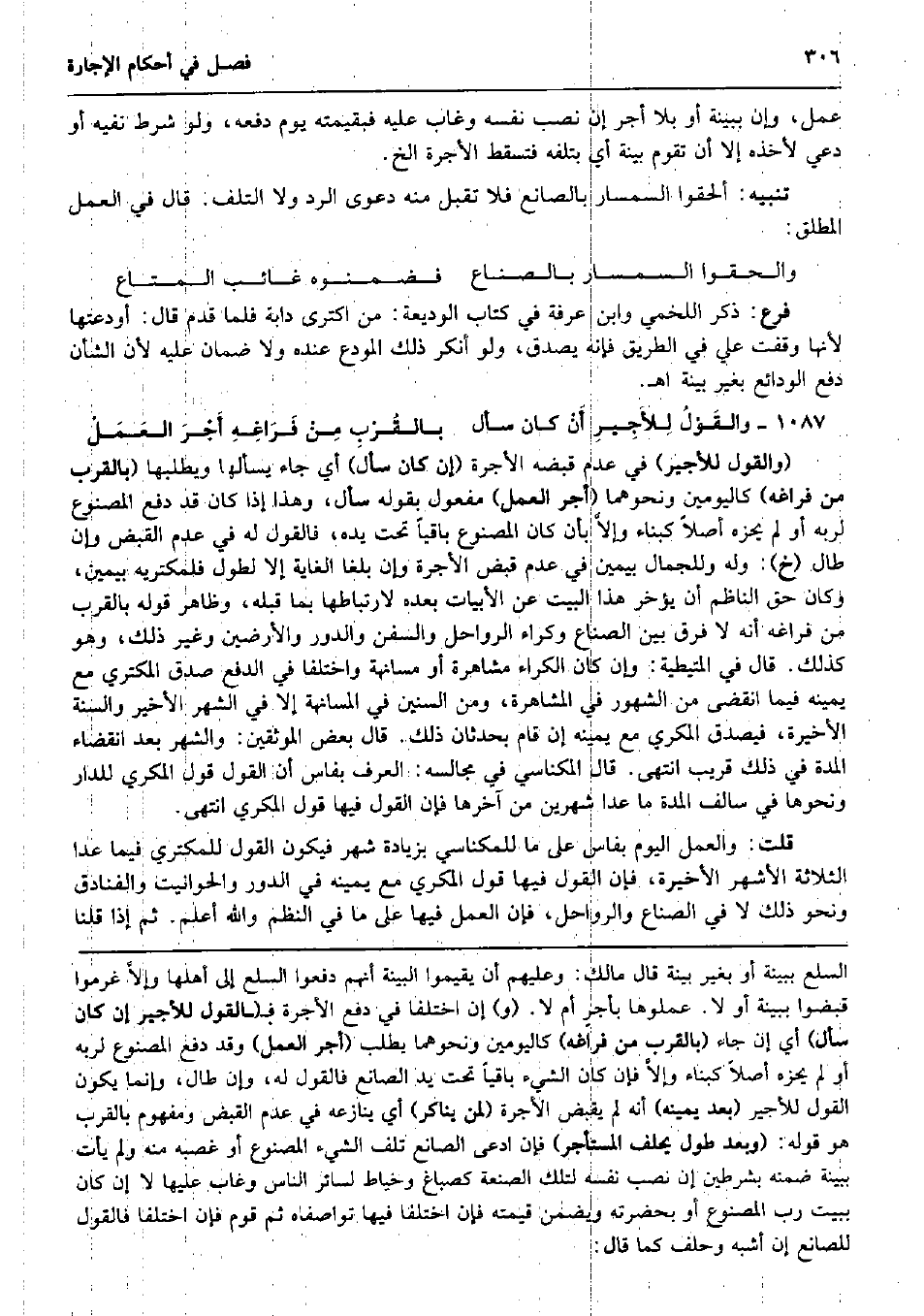 عمل، وَإِن بِبَيِّنَة أَو بِلَا أجر إِن نصب نَفسه وَغَابَ عَلَيْهِ فبقيمته يَوْم دَفعه، وَلَو شَرط نَفْيه أَو دعِي لأَخذه إِلَّا أَن تقوم بَيِّنَة أَي بتلفه فَتسقط الْأُجْرَة الخ. تَنْبِيه: ألْحقُوا السمسار بالصانع فَلَا تقبل مِنْهُ دَعْوَى الرَّد وَلَا التّلف. قَالَ فِي الْعَمَل الْمُطلق: والحقوا السمسار بالصناع فضمنوه غَائِب الْمَتَاع فرع: ذكر اللَّخْمِيّ وَابْن عَرَفَة فِي كتاب الْوَدِيعَة: من اكترى دَابَّة فَلَمَّا قدم قَالَ: أودعتها لِأَنَّهَا وقفت عَليّ فِي الطَّرِيق فَإِنَّهُ يصدق، وَلَو أنكر ذَلِك الْمُودع عِنْده وَلَا ضَمَان عَلَيْهِ لِأَن الشَّأْن دفع الودائع بِغَيْر بَيِّنَة اه. والقَوْلُ لِلأَجِيرِ أَنْ كَانَ سَأَلَ بالقُرْبِ مِنْ فَرَاغِهِ أَجْرَ العَمَلْ (وَالْقَوْل للْأَجِير) فِي عدم قَبضه الْأُجْرَة (إِن كَانَ سَأَلَ) أَي جَاءَ يسْأَلهَا ويطلبها (بِالْقربِ من فَرَاغه) كاليومين وَنَحْوهمَا (أجر الْعَمَل) مفعول بقوله سَأَلَ، وَهَذَا إِذا كَانَ قد دفع الْمَصْنُوع لرَبه أَو لم يحزه أصلا كبناء وإلاَّ بِأَن كَانَ الْمَصْنُوع بَاقِيا تَحت يَده، فَالْقَوْل لَهُ فِي عدم الْقَبْض وَإِن طَال (خَ) : وَله وللجمال بِيَمِين فِي عدم قبض الْأُجْرَة وَإِن بلغا الْغَايَة إِلَّا لطول فلمكتريه بِيَمِين، وَكَانَ حق النَّاظِم أَن يُؤَخر هَذَا الْبَيْت عَن الأبيات بعده لارتباطها بِمَا قبله، وَظَاهر قَوْله بِالْقربِ من فَرَاغه أَنه لَا فرق بَين الصناع وكراء الرَّوَاحِل والسفن والدور وَالْأَرضين وَغير ذَلِك، وَهُوَ كَذَلِك. قَالَ فِي الْمُتَيْطِيَّة: وَإِن كَانَ الْكِرَاء مشاهرة أَو مسانهة وَاخْتلفَا فِي الدّفع صدق الْمُكْتَرِي مَعَ يَمِينه فِيمَا انْقَضى من الشُّهُور فِي المشاهرة، وَمن السنين فِي المسانهة إِلَّا فِي الشَّهْر الْأَخير وَالسّنة الْأَخِيرَة، فَيصدق الْمكْرِي مَعَ يَمِينه إِن قَامَ بحدثان ذَلِك. قَالَ بعض الموثقين: والشهر بعد انْقِضَاء الْمدَّة فِي ذَلِك قريب انْتهى. قَالَ المكناسي فِي مجالسه: الْعرف بفاس أَن القَوْل قَول الْمكْرِي للدَّار وَنَحْوهَا فِي سالف الْمدَّة مَا عدا شَهْرَيْن من آخرهَا فَإِن القَوْل فِيهَا قَول الْمكْرِي انْتهى. قلت: وَالْعَمَل الْيَوْم بفاس على مَا للمكناسي بِزِيَادَة شهر فَيكون القَوْل للمكتري فِيمَا عدا الثَّلَاثَة الْأَشْهر الْأَخِيرَة، فَإِن القَوْل فِيهَا قَول الْمكْرِي مَعَ يَمِينه فِي الدّور والحوانيت والفنادق وَنَحْو ذَلِك لَا فِي الصناع والرواحل، فَإِن الْعَمَل فِيهَا على مَا فِي النّظم وَالله أعلم. ثمَّ إِذا قُلْنَا