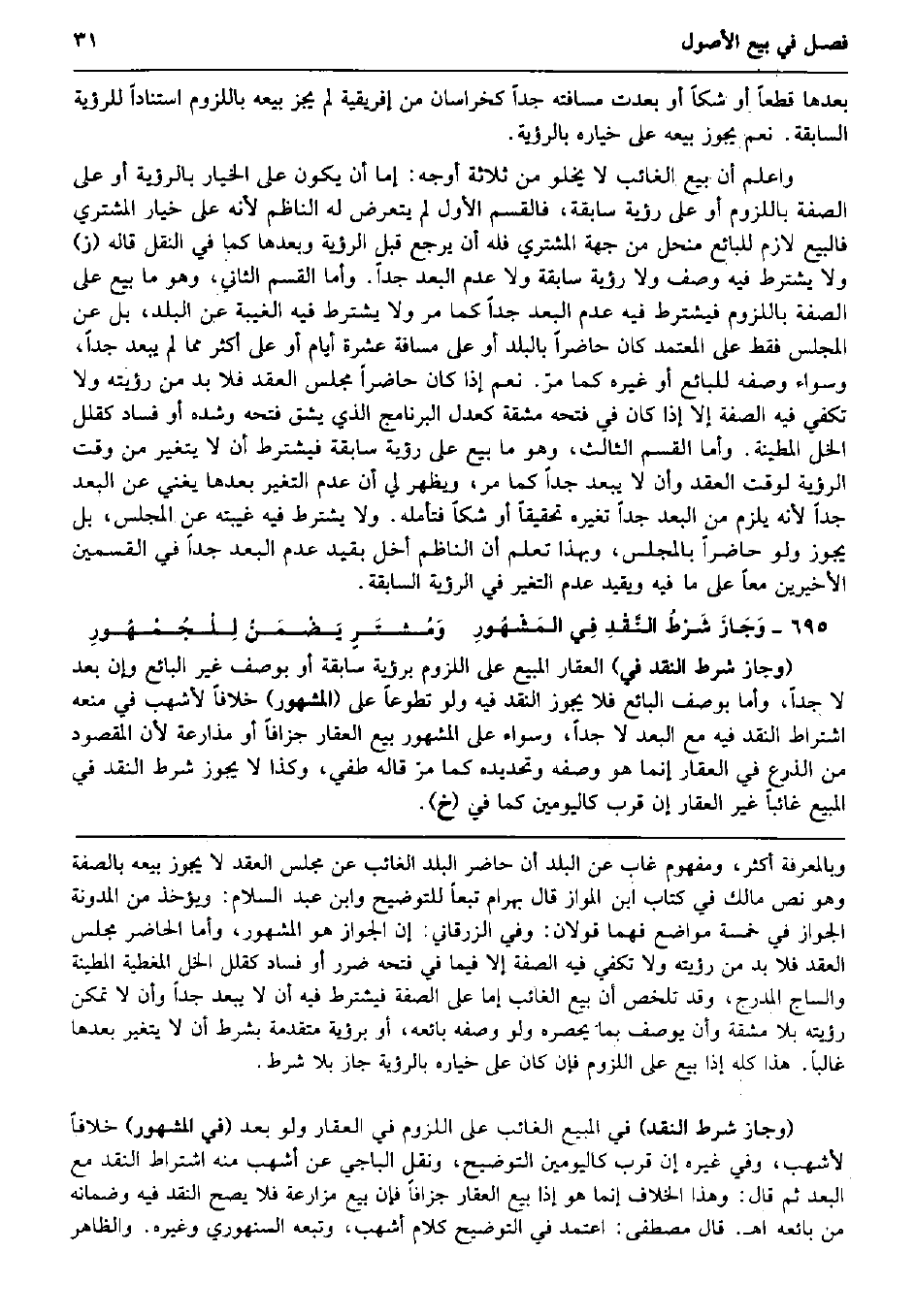 بعْدهَا قطعا أَو شكا أَو بَعدت مسافته جدا كخراسان من إفريقية لم يجز بَيْعه باللزوم استناداً للرؤية السَّابِقَة. نعم يجوز بَيْعه على خِيَاره بِالرُّؤْيَةِ. وَاعْلَم أَن بيع الْغَائِب لَا يَخْلُو من ثَلَاثَة أوجه: إِمَّا أَن يكون على الْخِيَار بِالرُّؤْيَةِ أَو على الصّفة باللزوم أَو على رُؤْيَة سَابِقَة، فالقسم الأول لم يتَعَرَّض لَهُ النَّاظِم لِأَنَّهُ على خِيَار المُشْتَرِي فَالْبيع لَازم للْبَائِع منحل من جِهَة المُشْتَرِي فَلهُ أَن يرجع قبل الرُّؤْيَة وَبعدهَا كَمَا فِي النَّقْل قَالَه (ز) وَلَا يشْتَرط فِيهِ وصف وَلَا رُؤْيَة سَابِقَة وَلَا عدم الْبعد جدا. وَأما الْقسم الثَّانِي، وَهُوَ مَا بيع على الصّفة باللزوم فَيشْتَرط فِيهِ عدم الْبعد جدا كَمَا مر وَلَا يشْتَرط فِيهِ الْغَيْبَة عَن الْبَلَد، بل عَن الْمجْلس فَقَط على الْمُعْتَمد كَانَ حَاضرا بِالْبَلَدِ أَو على مَسَافَة عشرَة أَيَّام أَو على أَكثر مِمَّا لم يبعد جدا، وَسَوَاء وَصفه للْبَائِع أَو غَيره كَمَا مرّ. نعم إِذا كَانَ حَاضرا مجْلِس العقد فَلَا بُد من رُؤْيَته وَلَا تَكْفِي فِيهِ الصّفة إِلَّا إِذا كَانَ فِي فَتحه مشقة كَعدْل البرنامج الَّذِي يشق فَتحه وشده أَو فَسَاد كقلل الْخلّ المطينة. وَأما الْقسم الثَّالِث، وَهُوَ مَا بيع على رُؤْيَة سَابِقَة فَيشْتَرط أَن لَا يتَغَيَّر من وَقت الرُّؤْيَة لوقت العقد وَأَن لَا يبعد جدا كَمَا مر وَيظْهر لي أَن عدم التَّغَيُّر بعْدهَا يُغني عَن الْبعد جدا لِأَنَّهُ يلْزم من الْبعد جدا تغيره تَحْقِيقا أَو شكا فَتَأَمّله. وَلَا يشْتَرط فِيهِ غيبته عَن الْمجْلس، بل يجوز وَلَو حَاضرا بِالْمَجْلِسِ، وَبِهَذَا تعلم أَن النَّاظِم أخل بِقَيْد عدم الْبعد جدا فِي الْقسمَيْنِ الْأَخيرينِ مَعًا على مَا فِيهِ ويقيد عدم التَّغَيُّر فِي الرُّؤْيَة السَّابِقَة. وَجَازَ شَرْطُ النَّقْدِ فِي المَشْهُورِ وَمُشتَرٍ يَضْمَنُ لِلْجُمْهُورِ (وَجَاز شَرط النَّقْد فِي) الْعقار الْمَبِيع على اللُّزُوم بِرُؤْيَة سَابِقَة أَو بِوَصْف غير البَائِع وَإِن بعد لَا جدا، وَأما بِوَصْف البَائِع فَلَا يجوز النَّقْد فِيهِ وَلَو تَطَوّعا على (الْمَشْهُور) خلافًا لأَشْهَب فِي مَنعه اشْتِرَاط النَّقْد فِيهِ مَعَ الْبعد لَا جدا، وَسَوَاء على الْمَشْهُور بيع الْعقار جزَافا أَو مذارعة لِأَن الْمَقْصُود من الذرع فِي الْعقار إِنَّمَا هُوَ وَصفه وتحديده كَمَا مرّ قَالَه طفي، وَكَذَا لَا يجوز شَرط النَّقْد فِي الْمَبِيع غَائِبا غير الْعقار إِن قرب كاليومين كَمَا فِي (خَ) .