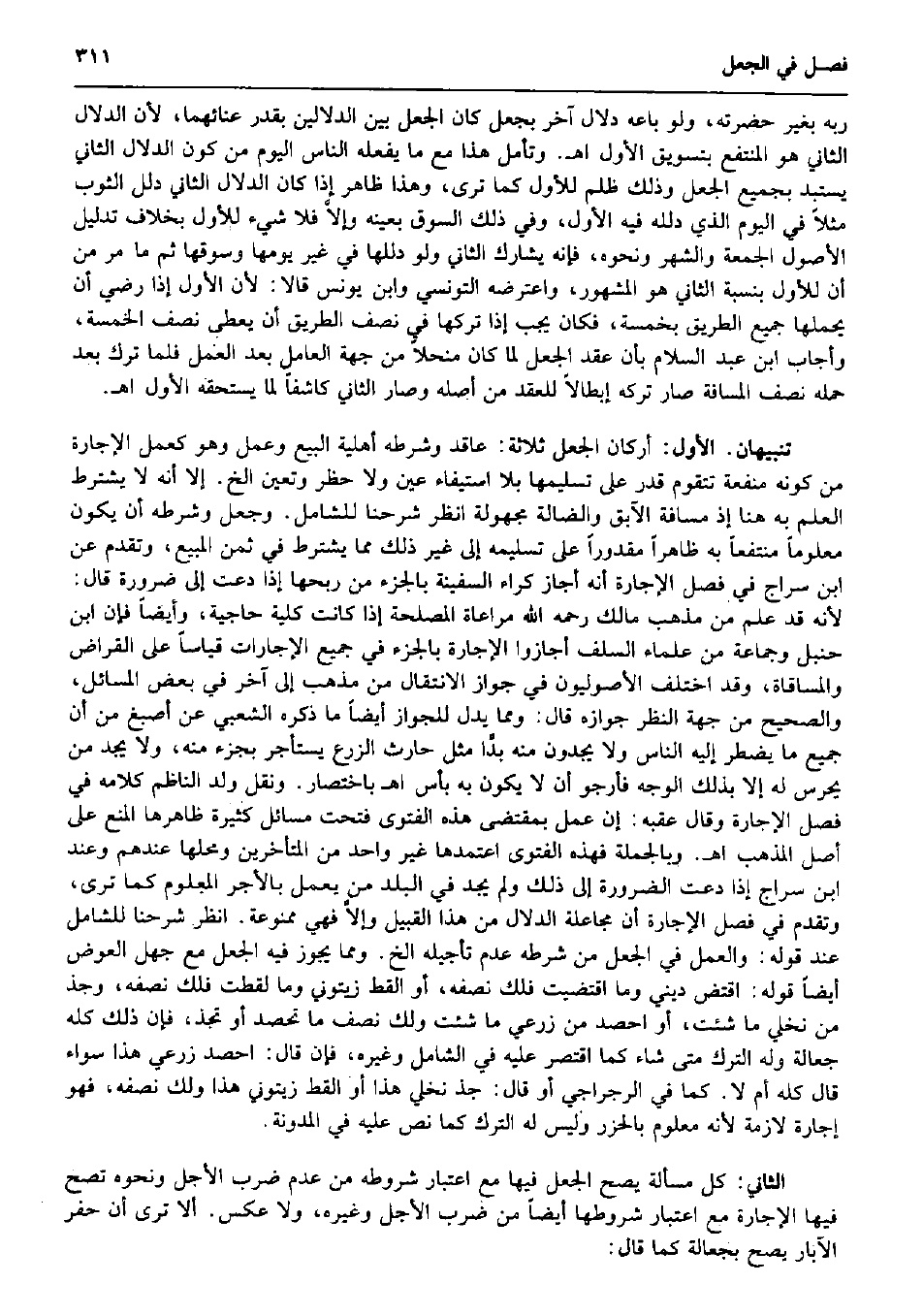 ربه بِغَيْر حَضرته، وَلَو بَاعه دلال آخر بِجعْل كَانَ الْجعل بَين الدلالين بِقدر عنائهما، لِأَن الدَّلال الثَّانِي هُوَ المنتفع بتسويق الأول اه. وَتَأمل هَذَا مَعَ مَا يَفْعَله النَّاس الْيَوْم من كَون الدَّلال الثَّانِي يستبد بِجَمِيعِ الْجعل وَذَلِكَ ظلم للْأولِ كَمَا ترى، وَهَذَا ظَاهر إِذا كَانَ الدَّلال الثَّانِي دلل الثَّوْب مثلا فِي الْيَوْم الَّذِي دلله فِيهِ الأول، وَفِي ذَلِك السُّوق بِعَيْنِه وإلاَّ فَلَا شَيْء للْأولِ بِخِلَاف تدليل الْأُصُول الْجُمُعَة والشهر وَنَحْوه، فَإِنَّهُ يُشَارك الثَّانِي وَلَو دللها فِي غير يَوْمهَا وسوقها ثمَّ مَا مر من أَن للْأولِ بِنِسْبَة الثَّانِي هُوَ الْمَشْهُور، وَاعْتَرضهُ التّونسِيّ وَابْن يُونُس قَالَا: لِأَن الأول إِذا رَضِي أَن يحملهَا جَمِيع الطَّرِيق بِخَمْسَة، فَكَانَ يجب إِذا تَركهَا فِي نصف الطَّرِيق أَن يعْطى نصف الْخَمْسَة، وَأجَاب ابْن عبد السَّلَام بِأَن عقد الْجعل لما كَانَ منحلاً من جِهَة الْعَامِل بعد الْعَمَل فَلَمَّا ترك بعد حمله نصف الْمسَافَة صَار تَركه إبطالاً للْعقد من أَصله وَصَارَ الثَّانِي كاشفاً لما يسْتَحقّهُ الأول اه. تَنْبِيهَانِ. الأول: أَرْكَان الْجعل ثَلَاثَة: عَاقد وَشَرطه أَهْلِيَّة البيع وَعمل وَهُوَ كعمل الْإِجَارَة من كَونه مَنْفَعَة تتقوم قدر على تَسْلِيمهَا بِلَا اسْتِيفَاء عين وَلَا حظر وَتعين الخ. إِلَّا أَنه لَا يشْتَرط الْعلم بِهِ هُنَا إِذْ مَسَافَة الْآبِق والضالة مَجْهُولَة انْظُر شرحنا للشامل. وَجعل وَشَرطه أَن يكون مَعْلُوما مُنْتَفعا بِهِ ظَاهرا مَقْدُورًا على تَسْلِيمه إِلَى غير ذَلِك مِمَّا يشْتَرط فِي ثمن الْمَبِيع، وَتقدم عَن ابْن سراج فِي فصل الْإِجَارَة أَنه أجَاز كِرَاء السَّفِينَة بالجزء من ربحها إِذا دعت إِلَى ضَرُورَة قَالَ: لِأَنَّهُ قد علم من مَذْهَب مَالك رَحمَه الله مُرَاعَاة الْمصلحَة إِذا كَانَت كُلية حاجية، وَأَيْضًا فَإِن ابْن حَنْبَل وَجَمَاعَة من عُلَمَاء السّلف أَجَازُوا الْإِجَارَة بالجزء فِي جَمِيع الْإِجَارَات قِيَاسا على الْقَرَاض وَالْمُسَاقَاة، وَقد اخْتلف الأصوليون فِي جَوَاز الِانْتِقَال من مَذْهَب إِلَى آخر فِي بعض الْمسَائِل، وَالصَّحِيح من جِهَة النّظر جَوَازه قَالَ: وَمِمَّا يدل للْجُوَاز أَيْضا مَا ذكره الشّعبِيّ عَن أصبغ من أَن جَمِيع مَا يضْطَر إِلَيْهِ النَّاس وَلَا يَجدونَ مِنْهُ بدًّا مثل حَارِث الزَّرْع يسْتَأْجر بِجُزْء مِنْهُ، وَلَا يجد من يحرس لَهُ إِلَّا بذلك الْوَجْه فأرجو أَن لَا يكون بِهِ بَأْس اه بِاخْتِصَار. وَنقل ولد النَّاظِم كَلَامه فِي فصل الْإِجَارَة وَقَالَ عقبه: إِن عمل بِمُقْتَضى هَذِه الْفَتْوَى فتحت مسَائِل كَثِيرَة ظَاهرهَا الْمَنْع على أصل الْمَذْهَب اه. وَبِالْجُمْلَةِ فَهَذِهِ الْفَتْوَى اعتمدها غير وَاحِد من الْمُتَأَخِّرين ومحلها عِنْدهم وَعند ابْن سراج إِذا دعت الضَّرُورَة إِلَى ذَلِك وَلم يجد فِي الْبَلَد من يعْمل بِالْأَجْرِ الْمَعْلُوم كَمَا ترى، وَتقدم فِي فصل الْإِجَارَة أَن مجاعلة الدَّلال من هَذَا الْقَبِيل وإلاَّ فَهِيَ مَمْنُوعَة. انْظُر شرحنا للشامل عِنْد قَوْله: وَالْعَمَل فِي الْجعل من شَرطه عدم تَأْجِيله الخ. وَمِمَّا يجوز فِيهِ الْجعل مَعَ جهل الْعِوَض أَيْضا قَوْله: اقتض ديني وَمَا اقتضيت فلك نصفه، أَو القط زيتوني وَمَا لقطت فلك نصفه، وجذ من نخلي مَا شِئْت، أَو احصد من زرعي مَا شِئْت وَلَك نصف مَا تحصد أَو تجذ، فَإِن ذَلِك كُله جعَالَة وَله التّرْك مَتى شَاءَ كَمَا اقْتصر عَلَيْهِ فِي الشَّامِل وَغَيره، فَإِن قَالَ: احصد زرعي هَذَا سَوَاء قَالَ كُله أم لَا. كَمَا فِي الرجراجي أَو قَالَ: جذ نخلي هَذَا أَو القط زيتوني هَذَا وَلَك نصفه، فَهُوَ إِجَارَة لَازِمَة لِأَنَّهُ مَعْلُوم بالحزر وَلَيْسَ لَهُ التّرْك كَمَا نَص عَلَ