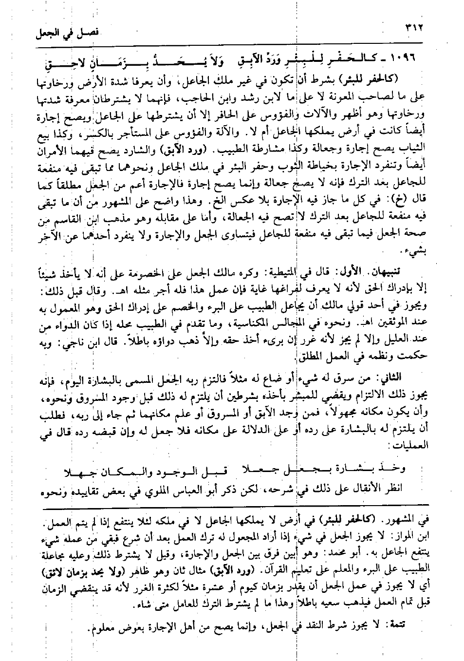 كالحَفْرِ لِلْبِئْرِ وَرَدِّ الآبِقِ وَلاَ يُحَدُّ بِزَمَانٍ لاحِقِ (كالحفر للبئر) بِشَرْط أَن تكون فِي غير ملك الْجَاعِل، وَأَن يعرفا شدَّة الأَرْض ورخاوتها على مَا لصَاحب المعونة لَا على مَا لِابْنِ رشد وَابْن الْحَاجِب فَإِنَّهُمَا لَا يشترطان معرفَة شدتها ورخاوتها وَهُوَ أظهر والآلات والفؤوس على الْحَافِر إِلَّا أَن يشترطها على الْجَاعِل وَيصِح إِجَارَة أَيْضا كَانَت فِي أَرض يملكهَا الْجَاعِل أم لَا. والآلة والفؤوس على الْمُسْتَأْجر بِالْكَسْرِ، وَكَذَا بيع الثِّيَاب يَصح إِجَارَة وجعالة وَكَذَا مشارطة الطَّبِيب. (ورد الْآبِق) والشارد يَصح فيهمَا الْأَمْرَانِ أَيْضا وتنفرد الْإِجَارَة بخياطة الثَّوْب وحفر الْبِئْر فِي ملك الْجَاعِل وَنَحْوهمَا مِمَّا تبقى فِيهِ مَنْفَعَة للجاعل بعد التّرْك فَإِنَّهُ لَا يَصح جعَالَة وَإِنَّمَا يَصح إِجَارَة فَالْإِجَارَة أَعم من الْجعل مُطلقًا كَمَا قَالَ (خَ) : فِي كل مَا جَازَ فِيهِ الْإِجَارَة بِلَا عكس الخ. وَهَذَا وَاضح على الْمَشْهُور من أَن مَا تبقى فِيهِ مَنْفَعَة للجاعل بعد التّرْك لَا تصح فِيهِ الْجعَالَة، وَأما على مُقَابِله وَهُوَ مَذْهَب ابْن الْقَاسِم من صِحَة الْجعل فِيمَا تبقى فِيهِ مَنْفَعَة للجاعل فيتساوى الْجعل وَالْإِجَارَة وَلَا ينْفَرد أَحدهمَا عَن الآخر بِشَيْء. تَنْبِيهَانِ. الأول: قَالَ فِي الْمُتَيْطِيَّة: وَكره مَالك الْجعل على الْخُصُومَة على أَنه لَا يَأْخُذ شَيْئا إِلَّا بِإِدْرَاك الْحق لِأَنَّهُ لَا يعرف لفراغها غَايَة فَإِن عمل هَذَا فَلهُ أجر مثله اه. وَقَالَ قبل ذَلِك: وَيجوز فِي أحد قولي مَالك أَن يجاعل الطَّبِيب على الْبُرْء والخصم على إِدْرَاك الْحق وَهُوَ الْمَعْمُول بِهِ عِنْد الموثقين اه. وَنَحْوه فِي الْمجَالِس المكناسية، وَمَا تقدم فِي الطَّبِيب مَحَله إِذا كَانَ الدَّوَاء من عِنْد العليل وَإِلَّا لم يجز لِأَنَّهُ غرر إِن برىء أَخذ حَقه وإلاَّ ذهب دواؤه بَاطِلا. قَالَ ابْن نَاجِي: وَبِه حكمت ونظمه فِي الْعَمَل الْمُطلق. الثَّانِي: من سرق لَهُ شَيْء أَو ضَاعَ لَهُ مثلا فالتزم ربه الْجعل الْمُسَمّى بالبشارة الْيَوْم، فَإِنَّهُ يجوز ذَلِك الِالْتِزَام وَيَقْضِي للمبشر بِأَخْذِهِ بِشَرْطَيْنِ أَن يلْتَزم لَهُ ذَلِك قبل وجود الْمَسْرُوق وَنَحْوه، وَأَن يكون مَكَانَهُ مَجْهُولا، فَمن وجد الْآبِق أَو الْمَسْرُوق أَو علم مكانهما ثمَّ جَاءَ إِلَى ربه، فَطلب أَن يلْتَزم لَهُ بالبشارة على رده أَو على الدّلَالَة على مَكَانَهُ فَلَا جعل لَهُ وَإِن قَبضه رده قَالَ فِي العمليات: وَخذ بِشَارَة بِجعْل جعلا قبل الْوُجُود وَالْمَكَان جهلا انْظُر الأنقال على ذَلِك فِي شَرحه، لَكِن ذكر أَبُو الْعَبَّاس الملوي فِي بعض تقاييده وَنَحْوه