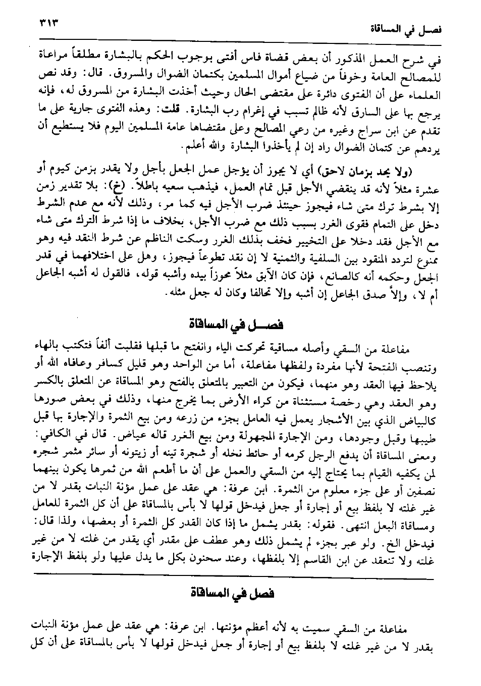 مفاعلة من السَّقْي وَأَصله مساقية تحركت الْيَاء وَانْفَتح مَا قبلهَا فقلبت ألفا فتكتب بِالْهَاءِ وتنصب الفتحة لِأَنَّهَا مُفْردَة ولفظها مفاعلة، أما من الْوَاحِد وَهُوَ قَلِيل كسافر وَعَافَاهُ الله أَو يُلَاحظ فِيهَا العقد وَهُوَ مِنْهُمَا، فَيكون من التَّعْبِير بالمتعلق بِالْفَتْح وَهُوَ الْمُسَاقَاة عَن الْمُتَعَلّق بِالْكَسْرِ وَهُوَ العقد وَهِي رخصَة مُسْتَثْنَاة من كِرَاء الأَرْض بِمَا يخرج مِنْهَا، وَذَلِكَ فِي بعض صورها كالبياض الَّذِي بَين الْأَشْجَار يعْمل فِيهِ الْعَامِل بِجُزْء من زرعه وَمن بيع الثَّمَرَة وَالْإِجَارَة بهَا قبل طيبها وَقبل وجودهَا، وَمن الْإِجَارَة المجهولة وَمن بيع الْغرَر قَالَه عِيَاض. قَالَ فِي الْكَافِي: وَمعنى الْمُسَاقَاة أَن يدْفع الرجل كرمه أَو حَائِط نخله أَو شَجَرَة تينه أَو زيتونه أَو سَائِر مثمر شَجَره لمن يَكْفِيهِ الْقيام بِمَا يحْتَاج إِلَيْهِ من السَّقْي وَالْعَمَل على أَن مَا أطْعم الله من ثَمَرهَا يكون بَينهمَا نِصْفَيْنِ أَو على جُزْء مَعْلُوم من الثَّمَرَة. ابْن عَرَفَة: هِيَ عقد على عمل مُؤنَة النَّبَات بِقدر لَا من غير غَلَّته لَا بِلَفْظ بيع أَو إِجَارَة أَو جعل فَيدْخل قَوْلهَا لَا بَأْس بالمساقاة على أَن كل الثَّمَرَة لِلْعَامِلِ ومساقاة البعل انْتهى. فَقَوله: بِقدر يَشْمَل مَا إِذا كَانَ الْقدر كل الثَّمَرَة أَو بَعْضهَا، وَلذَا قَالَ: فَيدْخل الخ. وَلَو عبر بِجُزْء لم يَشْمَل ذَلِك وَهُوَ عطف على مُقَدّر أَي يقدر من غَلَّته لَا من غير غَلَّته وَلَا تَنْعَقِد عَن ابْن الْقَاسِم إِلَّا بلفظها، وَعند سَحْنُون بِكُل مَا يدل عَلَيْهَا وَلَو بِلَفْظ الْإِجَارَة