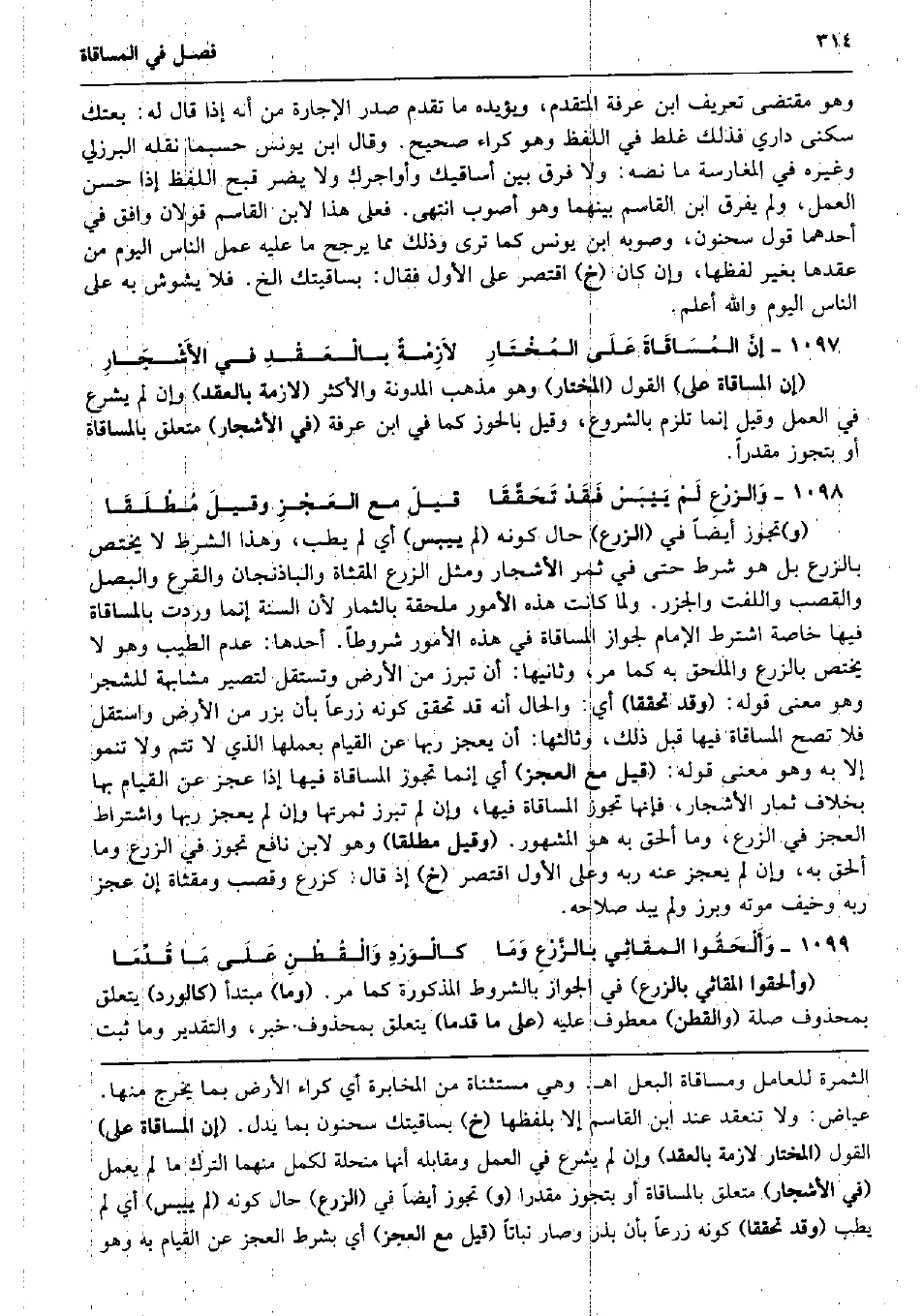 وَهُوَ مُقْتَضى تَعْرِيف ابْن عَرَفَة الْمُتَقَدّم، وَيُؤَيِّدهُ مَا تقدم صدر الْإِجَارَة من أَنه إِذا قَالَ لَهُ: بِعْتُك سُكْنى دَاري فَذَلِك غلط فِي اللَّفْظ وَهُوَ كِرَاء صَحِيح. وَقَالَ ابْن يُونُس حَسْبَمَا نَقله الْبُرْزُليّ وَغَيره فِي المغارسة مَا نَصه: وَلَا فرق بَين أساقيك وأواجرك وَلَا يضر قبح اللَّفْظ إِذا حسن الْعَمَل، وَلم يفرق ابْن الْقَاسِم بَينهمَا وَهُوَ أصوب انْتهى. فعلى هَذَا لِابْنِ الْقَاسِم قَولَانِ وَافق فِي أَحدهمَا قَول سَحْنُون، وَصَوَّبَهُ ابْن يُونُس كَمَا ترى وَذَلِكَ مِمَّا يرجح مَا عَلَيْهِ عمل النَّاس الْيَوْم من عقدهَا بِغَيْر لَفظهَا، وَإِن كَانَ (خَ) اقْتصر على الأول فَقَالَ: بساقيتك الخ. فَلَا يشوش بِهِ على النَّاس الْيَوْم وَالله أعلم. إنَّ المُسَاقَاةَ عَلَى المُخْتَارِ لاَزِمْةٌ بالْعَقْدِ فِي الأَشْجَارِ (إِن الْمُسَاقَاة على) القَوْل (الْمُخْتَار) وَهُوَ مَذْهَب الْمُدَوَّنَة وَالْأَكْثَر (لَازِمَة بِالْعقدِ) وَإِن لم يشرع فِي الْعَمَل وَقيل إِنَّمَا تلْزم بِالشُّرُوعِ، وَقيل بالحوز كَمَا فِي ابْن عَرَفَة (فِي الْأَشْجَار) مُتَعَلق بالمساقاة أَو بتجوز مُقَدرا. وَالزرْعِ لَمْ يَيْبَسْ فَقَدْ تَحَقَّقَا قيلَ مَعَ العَجْزِ وقيلَ مُطْلَقَا (و) تجوز أَيْضا فِي (الزَّرْع) حَال كَونه (لم ييبس) أَي لم يطب، وَهَذَا الشَّرْط لَا يخْتَص بالزرع بل هُوَ شَرط حَتَّى فِي ثَمَر الْأَشْجَار وَمثل الزَّرْع المقثاة والباذنجان والقرع والبصل والقصب واللفت والجزر. وَلما كَانَت هَذِه الْأُمُور مُلْحقَة بالثمار لِأَن السّنة إِنَّمَا وَردت بالمساقاة فِيهَا خَاصَّة اشْترط الإِمَام لجَوَاز الْمُسَاقَاة فِي هَذِه الْأُمُور شُرُوطًا. أَحدهَا: عدم الطّيب وَهُوَ لَا يخْتَص بالزرع والملحق بِهِ كَمَا مر، وَثَانِيها: أَن تبرز من الأَرْض وتستقل لتصير مشابهة للشجر وَهُوَ معنى قَوْله: (وَقد تحققا) أَي: وَالْحَال أَنه قد تحقق كَونه زرعا بِأَن بزر من الأَرْض واستقل فَلَا تصح الْمُسَاقَاة فِيهَا قبل ذَلِك، وَثَالِثهَا: أَن يعجز رَبهَا عَن الْقيام بعملها الَّذِي لَا تتمّ وَلَا تنمو إِلَّا بِهِ وَهُوَ معنى قَوْله: (قيل مَعَ الْعَجز) أَي إِنَّمَا تجوز الْمُسَاقَاة فِيهَا إِذا عجز عَن الْقيام بهَا بِخِلَاف ثمار الْأَشْجَار، فَإِنَّهَا تجوز الْمُسَاقَاة فِيهَا، وَإِن لم تبرز ثَمَرَتهَا وَإِن لم يعجز رَبهَا وَاشْتِرَاط الْعَجز فِي الزَّرْع، وَمَا ألحق بِهِ هُوَ الْمَشْهُور. 6 (وَقيل مُطلقًا) وَهُوَ لِابْنِ نَافِع تجوز فِي الزَّرْع وَمَا ألحق بِهِ، وَإِن لم يعجز عَنهُ ربه وعَلى الأول اقْتصر (خَ) إِذْ قَالَ: كزرع وقصب ومقثاة إِن عجز ربه وَخيف مَوته وبرز وَلم يبد صَلَاحه. وَأَلْحَقُوا المقاثِي بالزَّرْعِ وَمَا كالْوَرْدِ وَالْقُطْنِ عَلَى مَا قُدِّمَا (وألحقوا المقاثي بالزرع) فِي الْجَوَاز بِالشُّرُوطِ الْمَذْكُورَة كَمَا مر. (وَمَا) مُبْتَدأ (كالورد) يتَعَلَّق بِمَحْذُوف صلَة (والقطن) مَعْطُوف عَلَيْهِ (على مَا قدما) يتَعَلَّق بِمَحْذُوف خبر، وَالتَّقْدِير وَمَا ثَبت