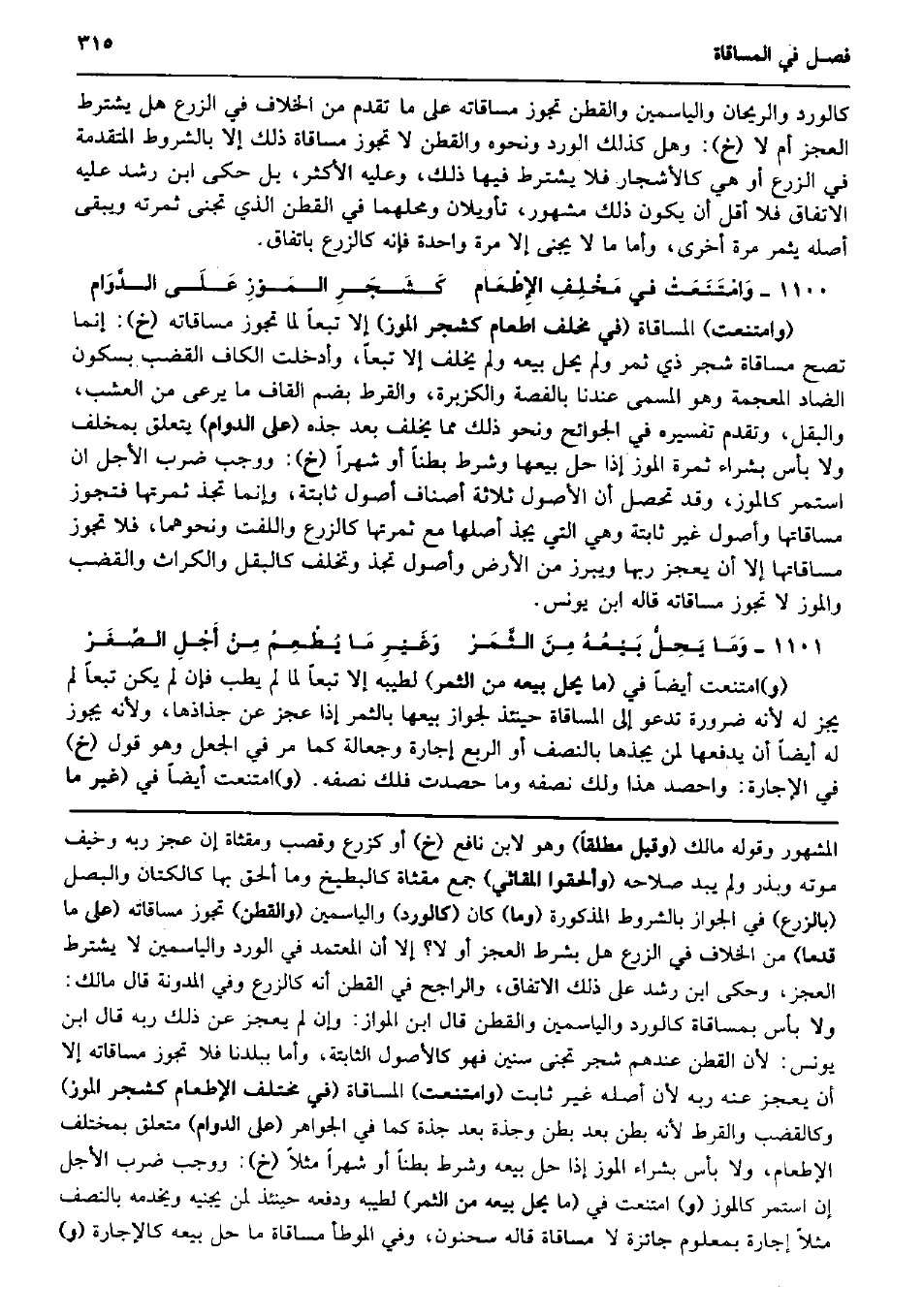 كالورد وَالريحَان والياسمين والقطن تجوز مساقاته على مَا تقدم من الْخلاف فِي الزَّرْع هَل يشْتَرط الْعَجز أم لَا (خَ) : وَهل كَذَلِك الْورْد وَنَحْوه والقطن لَا تجوز مُسَاقَاة ذَلِك إِلَّا بِالشُّرُوطِ الْمُتَقَدّمَة فِي الزَّرْع أَو هِيَ كالأشجار فَلَا يشْتَرط فِيهَا ذَلِك، وَعَلِيهِ الْأَكْثَر، بل حكى ابْن رشد عَلَيْهِ الِاتِّفَاق فَلَا أقل أَن يكون ذَلِك مَشْهُور، تَأْوِيلَانِ ومحلهما فِي الْقطن الَّذِي تجنى ثَمَرَته وَيبقى أَصله يُثمر مرّة أُخْرَى، وَأما مَا لَا يجنى إِلَّا مرّة وَاحِدَة فَإِنَّهُ كالزرع بِاتِّفَاق. وَامْتَنَعَتْ فِي مَخْلِفِ الإِطْعَام كَشَجَرِ المَوْزِ عَلَى الدَّوَام (وامتنعت) الْمُسَاقَاة (فِي مخلف اطعام كشجر الموز) إِلَّا تبعا لما تجوز مساقاته (خَ) : إِنَّمَا تصح مُسَاقَاة شجر ذِي ثَمَر وَلم يحل بَيْعه وَلم يخلف إِلَّا تبعا، وأدخلت الْكَاف القضب بِسُكُون الضَّاد الْمُعْجَمَة وَهُوَ الْمُسَمّى عندنَا بالفصة والكزبرة، والقرط بِضَم الْقَاف مَا يرْعَى من العشب، والبقل، وَتقدم تَفْسِيره فِي الجوائح وَنَحْو ذَلِك مِمَّا يخلف بعد جذه (على الدَّوَام) يتَعَلَّق بمخلف وَلَا بَأْس بشرَاء ثَمَرَة الموز إِذا حل بيعهَا وَشرط بَطنا أَو شهرا (خَ) : وَوَجَب ضرب الْأَجَل ان اسْتمرّ كالموز، وَقد تحصل أَن الْأُصُول ثَلَاثَة أَصْنَاف أصُول ثَابِتَة، وَإِنَّمَا تجذ ثَمَرَتهَا فَتجوز مساقاتها وأصول غير ثَابِتَة وَهِي الَّتِي يجذ أَصْلهَا مَعَ ثَمَرَتهَا كالزرع واللفت وَنَحْوهمَا، فَلَا تجوز مساقاتها إِلَّا أَن يعجز رَبهَا ويبرز من الأَرْض وأصول تجذ وتخلف كالبقل والكراث والقضب والموز لَا تجوز مساقاته قَالَه ابْن يُونُس. وَمَا يَحِلُّ بَيْعُهُ مِنَ الثَّمَرْ وَغَيْرِ مَا يُطْعِمُ مِنْ أَجْلِ الصِّغَرْ (و) امْتنعت أَيْضا فِي (مَا يحل بَيْعه من الثَّمر) لطيبه إِلَّا تبعا لما لم يطب فَإِن لم يكن تبعا لم يجز لَهُ لِأَنَّهُ ضَرُورَة تَدْعُو إِلَى الْمُسَاقَاة حِينَئِذٍ لجَوَاز بيعهَا بالثمر إِذا عجز عَن جذاذها، وَلِأَنَّهُ يجوز لَهُ أَيْضا أَن يَدْفَعهَا لمن يجذها بِالنِّصْفِ أَو الرّبع إِجَارَة وجعالة كَمَا مر فِي الْجعل وَهُوَ قَول (خَ) فِي الْإِجَارَة: واحصد هَذَا وَلَك نصفه وَمَا حصدت فلك نصفه. (و) امْتنعت أَيْضا فِي (غير مَا