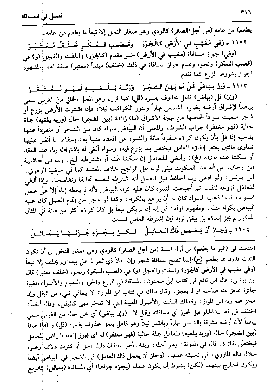 يطعم) من عَامه (من أجل الصغر) كالودي وَهُوَ صغَار النّخل إِلَّا تبعا لما يطعم من عَامه. وَفي مُغَيَّبٍ فِي الأَرْضِ كالْجَزَرْ وَقَصَبِ السُّكَّرِ خُلْفٌ مُعْتَبَرْ (وَفِي) جَوَاز مُسَاقَاة (مغيب فِي الأَرْض) خبر مقدم (كالجزر) واللفت والفجل (و) فِي (قصب السكر) وَنَحْوه وَعدم جَوَاز الْمُسَاقَاة فِي ذَلِك (خلف) مُبْتَدأ (مُعْتَبر) صفة لَهُ، وَالْمَشْهُور الْجَوَاز بِشُرُوط الزَّرْع كَمَا تقدم. وَإنْ بَيَاضٌ قَلَّ مَا بَيْنَ الشَّجَرْ وَرَبُّهُ يُلْغيهِ فَهْوَ مُغْتَفَرْ (وَإِن) قل (بَيَاض) فَاعل مَحْذُوف يفسره (قل) كَمَا قَررنَا وَهُوَ الْمحل الْخَالِي من الْغَرْس سمي بَيَاضًا لإشراق أرضه بضوء الشَّمْس نَهَارا وبنور الْكَوَاكِب لَيْلًا، فَإِذا اشترت الأَرْض بزرع أَو شجر سميت سواداً لحجبها عَن بهجة الْإِشْرَاق (مَا) زَائِدَة (بَين الشّجر) حَال (وربه يلغيه) جملَة حَالية (فَهُوَ مغتفر) جَوَاب الشَّرْط، وَالْمعْنَى أَن الْبيَاض سَوَاء كَانَ بَين الشّجر أَو مُنْفَردا عَنْهَا بِنَاحِيَة إِذا قلّ بِأَن يكون كراؤه مُنْفَردا مائَة وَالثَّمَرَة على الْمُعْتَاد مِنْهَا بعد إِسْقَاط مَا أنْفق عَلَيْهَا تَسَاوِي مِائَتَيْنِ يغْتَفر إلغاؤه لِلْعَامِلِ فَيخْتَص بِمَا يزرع فِيهِ، وَسَوَاء ألغي لَهُ باشتراطه إِيَّاه عِنْد العقد أَو سكتا عَنهُ عِنْده (خَ) : وألغي لِلْعَامِلِ إِن سكتا عَنهُ أَو اشْتَرَطَهُ الخ. وَمَا فِي حَاشِيَة ابْن رحال: من أَنه عِنْد السُّكُوت يبْقى لرَبه على الرَّاجِح خلاف الْمُعْتَمد كَمَا فِي حَاشِيَة الرهوني. ابْن يُونُس: وَلَو ادّعى رب الْحَائِط قبل الْعَمَل أَنه اشْتَرَطَهُ لنَفسِهِ تحَالفا وتفاسخا، وَإِذا ألغي لِلْعَامِلِ فزرعه لنَفسِهِ ثمَّ أجيحت الثَّمَرَة كَانَ عَلَيْهِ كِرَاء الْبيَاض لِأَنَّهُ لم يُعْطه إِيَّاه إِلَّا على عمل السوَاد، فَلَمَّا ذهب السوَاد كَانَ لَهُ أَن يرجع بالكراء، وَكَذَا لَو عجز عَن إتْمَام الْعَمَل كَانَ عَلَيْهِ الْبيَاض بكرَاء مثله، وَمَفْهُوم قَوْله: قل إِنَّه إِذا لم يكن تبعا بل كَانَ كراؤه أَكثر من مائَة فِي الْمِثَال الْمَذْكُور لم يجز إلغاؤه بل يبْقى لرَبه فَإِن اشْتَرَطَهُ الْعَامِل فَسدتْ. وَجازَ أنْ يَعْمَلَ ذَاكَ العامِلُ لكِنْ بِجُزْءِ جُزْئهَا يُمَاثِلُ