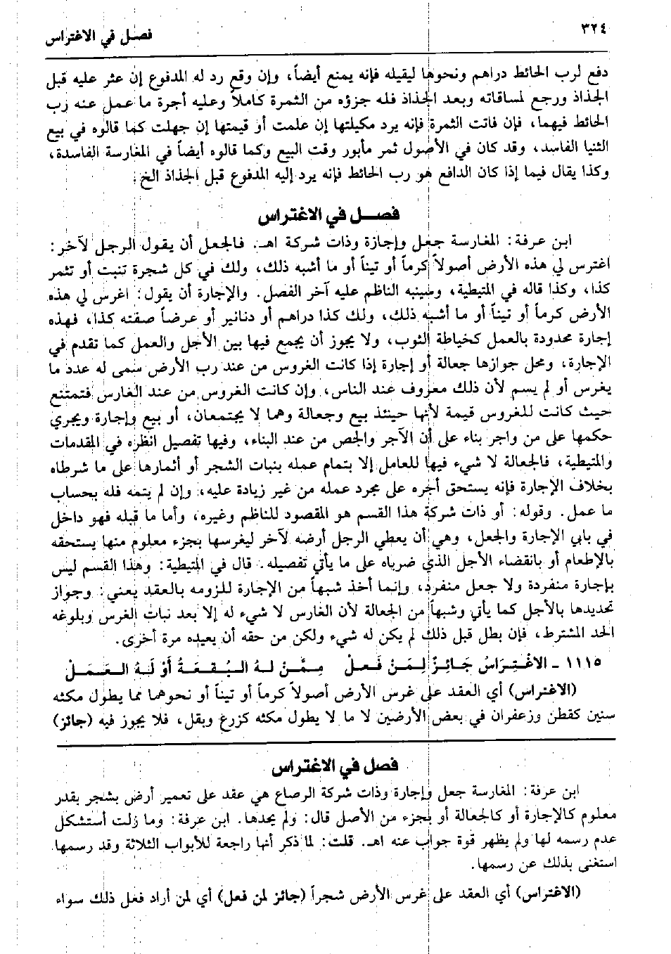 ابْن عَرَفَة: المغارسة جعل وإجازة وَذَات شركَة اه. فالجعل أَن يَقُول الرجل لآخر: اغترس لي هَذِه الأَرْض أصولاً كرماً أَو تيناً أَو مَا أشبه ذَلِك، وَلَك فِي كل شَجَرَة تنْبت أَو تثمر كَذَا، وَكَذَا قَالَه فِي الْمُتَيْطِيَّة، وسينبه النَّاظِم عَلَيْهِ آخر الْفَصْل. وَالْإِجَارَة أَن يَقُول: اغرس لي هَذِه الأَرْض كرماً أَو تيناً أَو مَا أشبه ذَلِك، وَلَك كَذَا دَرَاهِم أَو دَنَانِير أَو عرضا صفته كَذَا، فَهَذِهِ إِجَارَة محدودة بِالْعَمَلِ كخياطة الثَّوْب، وَلَا يجوز أَن يجمع فِيهَا بَين الْأَجَل وَالْعَمَل كَمَا تقدم فِي الْإِجَارَة، وَمحل جَوَازهَا جعَالَة أَو إِجَارَة إِذا كَانَت الغروس من عِنْد رب الأَرْض سمى لَهُ عدد مَا يغْرس أَو لم يسم لِأَن ذَلِك مَعْرُوف عِنْد النَّاس، وَإِن كَانَت الغروس من عِنْد الغارس فتمتنع حَيْثُ كَانَت للغروس قيمَة لِأَنَّهَا حِينَئِذٍ بيع وجعالة وهما لَا يَجْتَمِعَانِ، أَو بيع وَإِجَارَة وَيجْرِي حكمهَا على من واجر بِنَاء على أَن الْآجر والجص من عِنْد الْبناء، وفيهَا تَفْصِيل اُنْظُرْهُ فِي الْمُقدمَات والمتيطية، فالجعالة لَا شَيْء فِيهَا لِلْعَامِلِ إِلَّا بِتمَام عمله بنبات الشّجر أَو أثمارها على مَا شرطاه بِخِلَاف الْإِجَارَة فَإِنَّهُ يسْتَحق أجره على مُجَرّد عمله من غير زِيَادَة عَلَيْهِ، وَإِن لم يتمه فَلهُ بِحِسَاب مَا عمل. وَقَوله: أَو ذَات شركَة هَذَا الْقسم هُوَ الْمَقْصُود للناظم وَغَيره، وَأما مَا قبله فَهُوَ دَاخل فِي بَابي الْإِجَارَة والجعل، وَهِي أَن يُعْطي الرجل أرضه لآخر ليغرسها بِجُزْء مَعْلُوم مِنْهَا يسْتَحقّهُ بِالْإِطْعَامِ أَو بِانْقِضَاء الْأَجَل الَّذِي ضرباه على مَا يَأْتِي تَفْصِيله. قَالَ فِي الْمُتَيْطِيَّة: وَهَذَا الْقسم لَيْسَ بِإِجَارَة مُنْفَرِدَة وَلَا جعل مُنْفَرد، وَإِنَّمَا أَخذ شبها من الْإِجَارَة للزومه بِالْعقدِ يَعْنِي: وَجَوَاز تحديدها بالأجل كَمَا يَأْتِي وشبهاً من الْجعَالَة لِأَن الغارس لَا شَيْء لَهُ إِلَّا بعد نَبَات الْغَرْس وبلوغه الْحَد الْمُشْتَرط، فَإِن بَطل قبل ذَلِك لم يكن لَهُ شَيْء وَلَكِن من حَقه أَن يُعِيدهُ مرّة أُخْرَى. الاغْتِرَاسُ جَائِزٌ لِمَنْ فَعلْ مِمَّنْ لهُ البُقعَةُ أَوْ لَهُ العَمَلْ (الاغتراس) أَي العقد على غرس الأَرْض أصولاً كرماً أَو تيناً أَو نَحْوهمَا مِمَّا يطول مكثه سِنِين كقطن وزعفران فِي بعض الْأَرْضين لَا مَا لَا يطول مكثه كزرع وبقل، فَلَا يجوز فِيهِ (جَائِز)