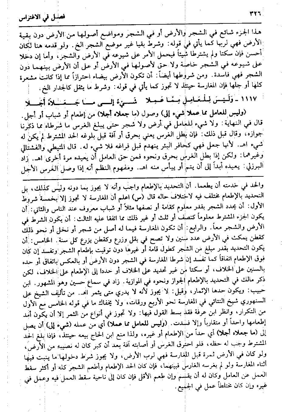 هَذَا الْجُزْء شَائِع فِي الشّجر وَالْأَرْض أَو فِي الشّجر ومواضع أُصُولهَا من الأَرْض دون بَقِيَّة الأَرْض فَهِيَ لِرَبِّهَا كَمَا يَأْتِي فِي قَوْله: وَشرط بقيا غير مَوضِع الشّجر الخ. وَلَو قدمه هُنَا لَكَانَ أحسن فَإِن سكتا وَلم يشترطا شَيْئا فَيحمل الْأَمر على شيوعه فِي الأَرْض وَالشَّجر، وَأما إِن دخلا على شيوعه فِي الشّجر خَاصَّة وَلَا حق لأصولها فِي الأَرْض أَو على أَن الأَرْض بَينهمَا دون الشّجر فَهِيَ فَاسِدَة. وَمن شُرُوطهَا أَيْضا: أَن تكون الأَرْض بَيْضَاء احْتِرَازًا مِمَّا إِذا كَانَت مشعرة كلهَا أَو جلها فَإِن المغارسة حِينَئِذٍ لَا تجوز كَمَا يَأْتِي فِي قَوْله: وَشرط مَا يثقل كالجدار الخ. وَلَيْسَ لِلْعَامِلِ مِمَّا عَمِلا شَيْءٌ إِلَى مَا جَعَلاَهُ أَجَلا (وَلَيْسَ لِلْعَامِلِ مِمَّا عملا شَيْء إِلَى) وُصُول (مَا جعلاه أَََجَلًا) من إطْعَام أَو شباب أَو أجل. قَالَ فِي النِّهَايَة: وَلَا شَيْء لِلْعَامِلِ فِي أَرض وَلَا شجر حَتَّى يبلغ الْغَرْس مَا شرطاه مِمَّا ذكرنَا جَوَازه، وَقَالَ قبل ذَلِك: فَإِن بَطل الْغَرْس يَعْنِي بحرق أَو آفَة قبل بُلُوغه الْحَد الْمُشْتَرط لم يكن لَهُ شَيْء اه. لِأَنَّهَا جعل فَهِيَ كحافر الْبِئْر ينهدم قبل فَرَاغه فَلَا شَيْء لَهُ. قَالَ المتيطي والفشتالي وَغَيرهمَا: وَلَكِن إِذا بَطل الْغَرْس بحرق وَنَحْوه فَمن حق الْعَامِل أَن يُعِيدهُ مرّة أُخْرَى اه. زَاد الْبُرْزُليّ: يُعِيدهُ أبدا إِلَى أَن يتم أَو ييأس مِنْهُ اه. وَمَفْهُوم النّظم أَنه إِذا وصل الْغَرْس الْأَجَل