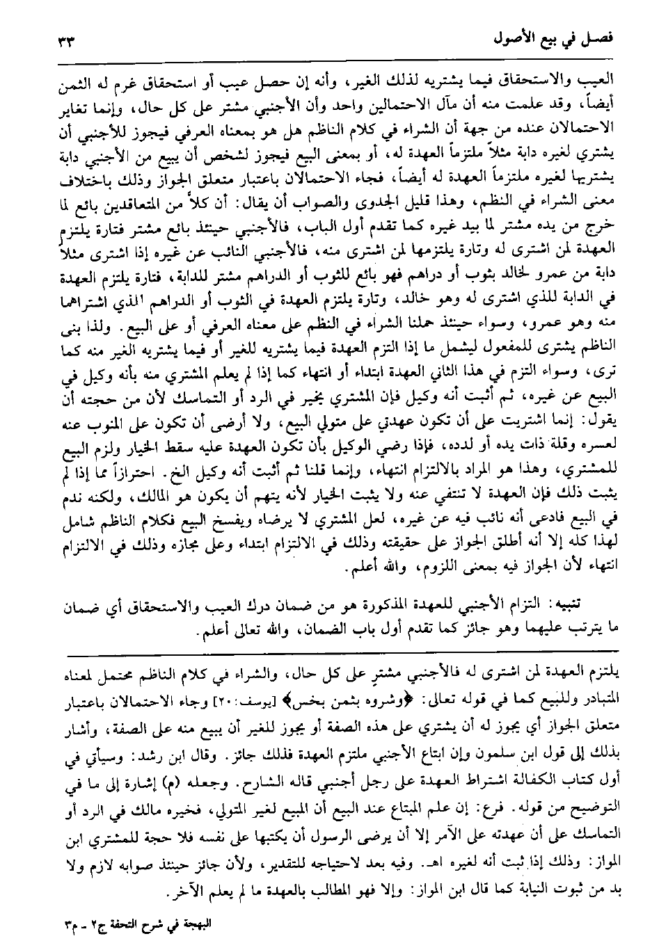 الْعَيْب والاستحقاق، وَأَنه إِن حصل أَحدهمَا غرم لَهُ الثّمن، وَيحْتَمل لِأَن يكون بِمَعْنى البيع على حد قَوْله تَعَالَى: وشروه بِثمن بخس} (يُوسُف: 20) أَي باعوه، وَالْمعْنَى عَلَيْهِ أَن الْأَجْنَبِيّ يجوز البيع مِنْهُ حَيْثُ اشْترى لغيره حَالَة كَونه مُلْتَزم عُهْدَة الْعَيْب والاستحقاق فِيمَا يَشْتَرِيهِ لذَلِك الْغَيْر، وَأَنه إِن حصل عيب أَو اسْتِحْقَاق غرم لَهُ الثّمن أَيْضا، وَقد علمت مِنْهُ أَن مآل الِاحْتِمَالَيْنِ وَاحِد وَأَن الْأَجْنَبِيّ مُشْتَر على كل حَال، وَإِنَّمَا تغاير الاحتمالان عِنْده من جِهَة أَن الشِّرَاء فِي كَلَام النَّاظِم هَل هُوَ بِمَعْنَاهُ الْعرفِيّ فَيجوز للْأَجْنَبِيّ أَن يَشْتَرِي لغيره دَابَّة مثلا مُلْتَزما الْعهْدَة لَهُ، أَو بِمَعْنى البيع فَيجوز لشخص أَن يَبِيع من الْأَجْنَبِيّ دَابَّة يَشْتَرِيهَا لغيره مُلْتَزما الْعهْدَة لَهُ أَيْضا فجَاء الاحتمالان بِاعْتِبَار مُتَعَلق الْجَوَاز وَذَلِكَ باخْتلَاف معنى الشِّرَاء فِي النّظم، وَهَذَا قَلِيل الجدوى وَالصَّوَاب أَن يُقَال: أَن كلاًّ من الْمُتَعَاقدين بَائِع لما خرج من يَده مُشْتَر لما بيد غَيره كَمَا تقدم أول الْبَاب، فالأجنبي حِينَئِذٍ بَائِع مُشْتَر فَتَارَة يلْتَزم الْعهْدَة لمن اشْترى لَهُ وَتارَة يلتزمها لمن اشْترى مِنْهُ، فالأجنبي النَّائِب عَن غَيره إِذا اشْترى مثلا دَابَّة من عَمْرو لخَالِد بِثَوْب أَو دَرَاهِم فَهُوَ بَائِع للثوب أَو الدَّرَاهِم مُشْتَر للدابة، فَتَارَة يلْتَزم الْعهْدَة فِي الدَّابَّة للَّذي اشْترى لَهُ وَهُوَ خَالِد، وَتارَة يلْتَزم الْعهْدَة فِي الثَّوْب أَو الدَّرَاهِم للَّذي اشتراهما مِنْهُ وَهُوَ عَمْرو، وَسَوَاء حِينَئِذٍ حملنَا الشِّرَاء فِي النّظم على مَعْنَاهُ الْعرفِيّ أَو على البيع. وَلذَا بنى النَّاظِم يشترى للْمَفْعُول ليشْمل مَا إِذا الْتزم الْعهْدَة فِيمَا يَشْتَرِيهِ للْغَيْر أَو فِيمَا يَشْتَرِيهِ الْغَيْر مِنْهُ كَمَا ترى، وَسَوَاء الْتزم فِي هَذَا الثَّانِي الْعهْدَة ابْتِدَاء أَو انْتِهَاء كَمَا إِذا لم يعلم المُشْتَرِي مِنْهُ بِأَنَّهُ وَكيل فِي البيع عَن غَيره، ثمَّ أثبت أَنه وَكيل فَإِن المُشْتَرِي يُخَيّر فِي الرَّد أَو التماسك لِأَن من حجَّته أَن يَقُول: إِنَّمَا اشْتريت على أَن تكون عهدتي على مُتَوَلِّي البيع، وَلَا أرْضى أَن تكون على المنوب عَنهُ لعسره وَقلة ذَات يَده أَو لدده، فَإِذا رَضِي الْوَكِيل بِأَن تكون الْعهْدَة عَلَيْهِ سقط الْخِيَار وَلزِمَ البيع للْمُشْتَرِي، وَهَذَا هُوَ المُرَاد بالالتزام انْتِهَاء، وَإِنَّمَا قُلْنَا ثمَّ أثبت أَنه وَكيل الخ. احْتِرَازًا مِمَّا إِذا لم يثبت ذَلِك فَإِن الْعهْدَة لَا تَنْتفِي عَنهُ وَلَا يثبت الْخِيَار لِأَنَّهُ يتهم أَن يكون هُوَ الْمَالِك، وَلكنه نَدم فِي البيع فَادّعى أَنه نَائِب فِيهِ عَن غَيره، لَعَلَّ المُشْتَرِي لَا يرضاه وَيفْسخ البيع فَكَلَام النَّاظِم شَامِل لهَذَا كُله إِلَّا أَنه أطلق الْجَوَاز على حَقِيقَته وَذَلِكَ فِي الِالْتِزَام ابْتِدَاء وعَلى مجازه وَذَلِكَ فِي الِالْتِزَام انْتِهَاء لِأَن الْجَوَاز فِيهِ بِمَعْنى اللُّزُوم، وَالله أعلم. تَنْبِيه: الْتِزَام الْأَجْنَبِيّ للعهدة الْمَذْكُورَة هُوَ من ضَمَان دَرك الْعَيْب والاستحقاق أَي ضَمَان مَا يَتَرَتَّب عَلَيْهِمَا وَهُوَ جَائِز كَمَا تقدم أول بَاب الضَّمَان، وَالله تَعَالَى أعلم.