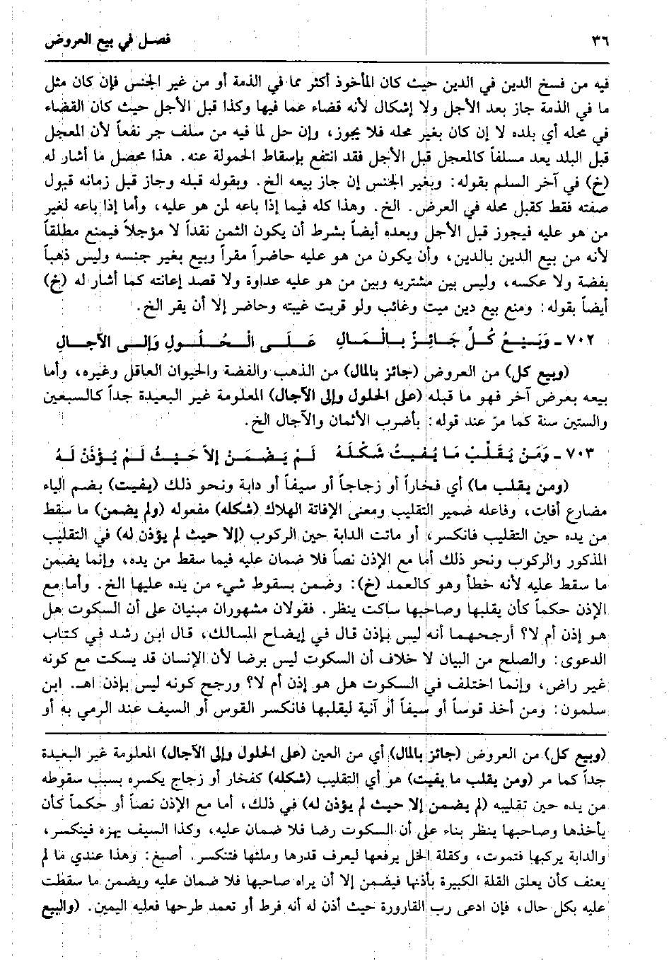 فِيهِ من فسخ الدّين فِي الدّين حَيْثُ كَانَ الْمَأْخُوذ أَكثر مِمَّا فِي الذِّمَّة أَو من غير الْجِنْس فَإِن كَانَ مثل مَا فِي الذِّمَّة جَازَ بعد الْأَجَل وَلَا إِشْكَال لِأَنَّهُ قَضَاء عَمَّا فِيهَا وَكَذَا قبل الْأَجَل حَيْثُ كَانَ الْقَضَاء فِي مَحَله أَي بَلَده لَا إِن كَانَ بِغَيْر مَحَله فَلَا يجوز، وَإِن حل لما فِيهِ من سلف جر نفعا لِأَن الْمُعَجل قبل الْبَلَد يعد مسلفاً كالمعجل قبل الْأَجَل فقد انْتفع بِإِسْقَاط الحمولة عَنهُ. هَذَا مُحَصل مَا أَشَارَ لَهُ (خَ) فِي آخر السّلم بقوله: وَبِغير الْجِنْس إِن جَازَ بَيْعه الخ. وَبِقَوْلِهِ قبله وَجَاز قبل زَمَانه قبُول صفته فَقَط كقبل مَحَله فِي الْعرض. الخ. وَهَذَا كُله فِيمَا إِذا بَاعه لمن هُوَ عَلَيْهِ، وَأما إِذا بَاعه لغير من هُوَ عَلَيْهِ فَيجوز قبل الْأَجَل وَبعده أَيْضا بِشَرْط أَن يكون الثّمن نَقْدا لَا مُؤَجّلا فَيمْنَع مُطلقًا لِأَنَّهُ من بيع الدّين بِالدّينِ، وَأَن يكون من هُوَ عَلَيْهِ حَاضرا مقرا وَبيع بِغَيْر جنسه وَلَيْسَ ذَهَبا بِفِضَّة وَلَا عَكسه، وَلَيْسَ بَين مُشْتَرِيه وَبَين من هُوَ عَلَيْهِ عَدَاوَة وَلَا قصد إعانته كَمَا أَشَارَ لَهُ (خَ) أَيْضا بقوله: وَمنع بيع دين ميت وغائب وَلَو قربت غيبته وحاضر إِلَّا أَن يقر الخ. وَبَيْعُ كُلَ جَائِزٌ بالْمَالِ عَلَى الْحُلُولِ وَإلى الآجالِ (وَبيع كل) من الْعرُوض (جَائِز بِالْمَالِ) من الذَّهَب وَالْفِضَّة وَالْحَيَوَان الْعَاقِل وَغَيره، وَأما بَيْعه بِعرْض آخر فَهُوَ مَا قبله (على الْحُلُول وَإِلَى الْآجَال) الْمَعْلُومَة غير الْبَعِيدَة جدا كالسبعين وَالسِّتِّينَ سنة كَمَا مرّ عِنْد قَوْله: بأضرب الْأَثْمَان والآجال الخ. وَمَنْ يُقَلِّبْ مَا يُفيتُ شَكْلَهُ لَمْ يَضْمَنْ إلاّ حَيْثُ لَمْ يُؤْذَنْ لَهُ (وَمن يقلب مَا) أَي فخاراً أَو زجاجاً أَو سَيْفا أَو دَابَّة وَنَحْو ذَلِك (يفيت) بِضَم الْيَاء مضارع أفات، وفاعله ضمير التقليب وَمعنى الإفاتة الْهَلَاك (شكله) مَفْعُوله (وَلم يضمن) مَا سقط من يَده حِين التقليب فانكسر، أَو مَاتَت الدَّابَّة حِين الرّكُوب (إِلَّا حَيْثُ لم يُؤذن لَهُ) فِي التقليب الْمَذْكُور وَالرُّكُوب وَنَحْو ذَلِك أما مَعَ الْإِذْن نصا فَلَا ضَمَان عَلَيْهِ فِيمَا سقط من يَده، وَإِنَّمَا يضمن مَا سقط عَلَيْهِ لِأَنَّهُ خطأ وَهُوَ كالعمد (خَ) : وَضمن بِسُقُوط شَيْء من يَده عَلَيْهَا الخ. وَأما مَعَ الْإِذْن حكما كَأَن يقلبها وصاحبها سَاكِت ينظر. فَقَوْلَانِ مشهوران مبنيان على أَن السُّكُوت هَل هُوَ إِذن أم لَا؟ أرجحهما أَنه لَيْسَ بِإِذن قَالَ فِي إِيضَاح المسالك، قَالَ ابْن رشد فِي كتاب الدَّعْوَى: وَالصُّلْح من الْبَيَان لَا خلاف أَن السُّكُوت لَيْسَ بِرِضا لِأَن الْإِنْسَان قد يسكت مَعَ كَونه غير رَاض، وَإِنَّمَا اخْتلف فِي السُّكُوت هَل هُوَ إِذن أم لَا؟ وَرجح كَونه لَيْسَ بِإِذن اه. ابْن سَلمُون: وَمن أَخذ قوساً أَو سَيْفا أَو آنِية ليقلبها فانكسر الْقوس أَو السَّيْف عِنْد الرَّمْي بِهِ