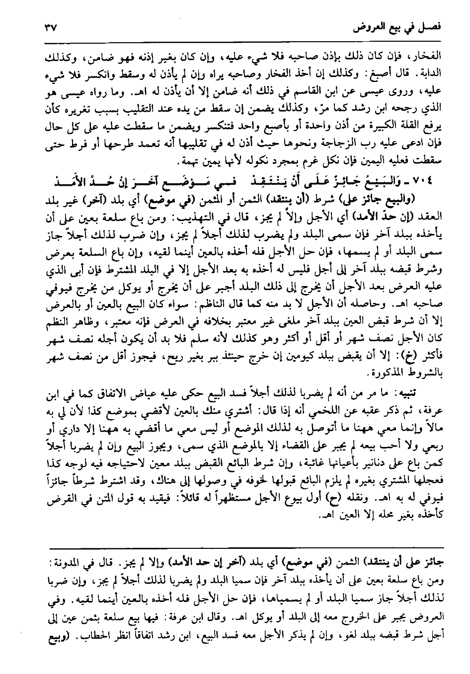أَو الفخار، فَإِن كَانَ ذَلِك بِإِذن صَاحبه فَلَا شَيْء عَلَيْهِ، وَإِن كَانَ بِغَيْر إِذْنه فَهُوَ ضَامِن، وَكَذَلِكَ الدَّابَّة. قَالَ أصبغ: وَكَذَلِكَ إِن أَخذ الفخار وَصَاحبه يرَاهُ وَإِن لم يَأْذَن لَهُ وَسقط وانكسر فَلَا شَيْء عَلَيْهِ، وروى عِيسَى عَن ابْن الْقَاسِم فِي ذَلِك أَنه ضَامِن إِلَّا أَن يَأْذَن لَهُ اه. وَمَا رَوَاهُ عِيسَى هُوَ الَّذِي رَجحه ابْن رشد كَمَا مرّ، وَكَذَلِكَ يضمن إِن سقط من يَده عِنْد التقليب بِسَبَب تغريره كَأَن يرفع الْقلَّة الْكَبِيرَة من أذن وَاحِدَة أَو بأصبع وَاحِد فتنكسر وَيضمن مَا سَقَطت عَلَيْهِ على كل حَال فَإِن ادّعى عَلَيْهِ رب الزجاجة وَنَحْوهَا حَيْثُ أذن لَهُ فِي تقليبها أَنه تعمد طرحها أَو فرط حَتَّى سَقَطت فَعَلَيهِ الْيَمين فَإِن نكل غرم بِمُجَرَّد نُكُوله لِأَنَّهَا يَمِين تُهْمَة. وَالبَيْعُ جَائِزٌ عَلَى أَنْ يَنْتَقِدْ فِي مَوْضَع آخَرَ إنْ حُدَّ الأَمَدْ (وَالْبيع جَائِز على) شَرط (أَن ينْتَقد) الثّمن أَو الْمُثمن (فِي مَوضِع) أَي بلد (آخر) غير بلد العقد (إِن حدّ الأمد) أَي الْأَجَل وإلاَّ لم يجز، قَالَ فِي التَّهْذِيب: وَمن بَاعَ سلْعَة بِعَين على أَن يَأْخُذهُ بِبَلَد آخر فَإِن سمى الْبَلَد وَلم يضْرب لذَلِك أَََجَلًا لم يجز، وَإِن ضرب لذَلِك أَََجَلًا جَازَ سمى الْبَلَد أَو لم يسمهَا، فَإِن حل الْأَجَل فَلهُ أَخذه بِالْعينِ أَيْنَمَا لقِيه، وَإِن بَاعَ السّلْعَة بِعرْض وَشرط قَبضه بِبَلَد آخر إِلَى أجل فَلَيْسَ لَهُ أَخذه بِهِ بعد الْأَجَل إِلَّا فِي الْبَلَد الْمُشْتَرط فَإِن أَبى الَّذِي عَلَيْهِ الْعرض بعد الْأَجَل أَن يخرج إِلَى ذَلِك الْبَلَد أجبر على أَن يخرج أَو يُوكل من يخرج فيوفي صَاحبه اه. وَحَاصِله أَن الْأَجَل لَا بُد مِنْهُ كَمَا قَالَ النَّاظِم: سَوَاء كَانَ البيع بِالْعينِ أَو بِالْعرضِ إِلَّا أَن شَرط قبض الْعين بِبَلَد آخر ملغى غير مُعْتَبر بِخِلَافِهِ فِي الْعرض فَإِنَّهُ مُعْتَبر، وَظَاهر النّظم كَانَ الْأَجَل نصف شهر أَو أقل أَو أَكثر وَهُوَ كَذَلِك لِأَنَّهُ سلم فَلَا بُد أَن يكون أَجله نصف شهر فَأكْثر (خَ) : إِلَّا أَن يقبض بِبَلَد كيومين إِن خرج حِينَئِذٍ ببر بِغَيْر ريح، فَيجوز أقل من نصف شهر بِالشُّرُوطِ الْمَذْكُورَة. تَنْبِيه: مَا مر من أَنه لم يضربا لذَلِك أَََجَلًا فسد البيع حكى عَلَيْهِ عِيَاض الِاتِّفَاق كَمَا فِي ابْن عَرَفَة، ثمَّ ذكر عقبه عَن اللَّخْمِيّ أَنه إِذا قَالَ: أَشْتَرِي مِنْك بِالْعينِ لأقضي بِموضع كَذَا لِأَن لي بِهِ مَالا وَإِنَّمَا معي هَهُنَا مَا أتوصل بِهِ لذَلِك الْموضع أَو لَيْسَ معي مَا أَقْْضِي بِهِ هَهُنَا إِلَّا دَاري أَو ربعي وَلَا أحب بَيْعه لم يجْبر على الْقَضَاء إِلَّا بالموضع الَّذِي سمى، وَيجوز البيع وَإِن لم يضربا أَََجَلًا كمن بَاعَ على دَنَانِير بِأَعْيَانِهَا غَائِبَة، وَإِن شَرط البَائِع الْقَبْض بِبَلَد معِين لاحتياجه فِيهِ لوجه كَذَا فعجلها المُشْتَرِي بِغَيْرِهِ لم يلْزم البَائِع قبُولهَا لخوفه فِي وصولها إِلَى هُنَاكَ، وَقد اشْترط شرطا جَائِزا فيوفي لَهُ بِهِ اه. وَنَقله (ح) أول بُيُوع الْأَجَل مستظهراً لَهُ قَائِلا: فيقيد بِهِ قَول الْمَتْن فِي الْقَرْض كأخذه بِغَيْر مَحَله إِلَّا الْعين اه.