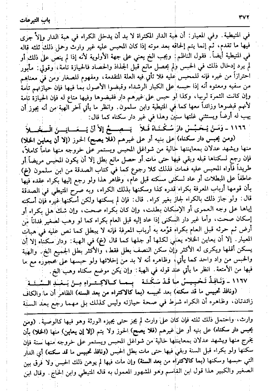 فِي الْمُتَيْطِيَّة. وَفِي المعيار: أَن هبة الدَّار المكتراة لَا بُد أَن يدْخل الْكِرَاء فِي هبة الدَّار وإلاَّ جرى فِيهَا مَا تقدم، ثمَّ إِنَّمَا يتم إِلْحَاقه بعد مَوته إِذا كَانَ الْمحبس عَلَيْهِ غير وَارِث وَحمل ذَلِك ثلثه قَالَه فِي الْمُتَيْطِيَّة أَيْضا. فَقَوْل النَّاظِم: وَيجب الخ يَعْنِي على جِهَة الْأَوْلَوِيَّة لِأَنَّهُ إِذا لم ينص على ذَلِك أَو لم يرد إِدْخَال ذَلِك فِي الْحَبْس وَلم يحصل مَانع قبل الْجذاذ والحصاد فالحيازة تَامَّة، وَقَوْلِي: مَأْبُور احْتِرَازًا من غَيره فَإِنَّهُ للمحبس عَلَيْهِ فَلَا تَأتي فِيهِ الْعلَّة الْمُتَقَدّمَة، وَمَفْهُوم للصغار وَمن فِي معناهم من سَفِيه ومعتوه أَنه إِذا حَبسه على الْكِبَار الرشداء وقبضوا الْأُصُول بِمَا فِيهَا فَإِن حيازتهم تَامَّة وَإِن كَانَت الثَّمَرَة لِرَبِّهَا، وَكَذَا لَو حبس على غَيرهم دَار فقبضوها وفيهَا مَتَاع لَهُ فَإِن الْحِيَازَة تَامَّة لأَنهم قبضوها وزائداً مَعهَا كَمَا فِي الْمُتَيْطِيَّة وَابْن سَلمُون. وَانْظُر مَا يَأْتِي آخر الْهِبَة من أَنه يجوز أَن يهب لَهُ أَرضًا ويستثني غَلَّتهَا سِنِين وَهَذَا فِي غير دَار سكناهُ كَمَا قَالَ: وَمَنْ يُحَبِّسْ دارَ سُكْنَاهُ فَلاَ يَصِحُّ إلاّ أنْ يُعَايَنَ الْخَلاَ (وَمن يحبس دَار سكناهُ) على بنيه أَو على غَيرهم (فَلَا يَصح) الْحَوْز (إِلَّا أَن يعاين الخلا) مِنْهَا وَيشْهد عَدْلَانِ بمعاينتها خَالِيَة من شواغل الْمحبس وَيسْتَمر على خُرُوجه مِنْهَا عَاما كَامِلا، فَإِن رَجَعَ لسكناها قبله وَبَقِي فِيهَا حَتَّى مَاتَ أَو حصل مَانع بَطل إِلَّا أَن يكون الْمحبس مَرِيضا أَو طريداً فآواه الْمحبس عَلَيْهِ فَمَاتَ فَذَلِك كلا رُجُوع كَمَا فِي كتاب الصَّدَقَة من ابْن سَلمُون (خَ) عاطفاً على المبطلات أَو عَاد لسكنى مَسْكَنه قبل عَام، وَظَاهر هَذَا وَلَو رَجَعَ إِلَيْهَا بكرَاء عقده فِيهَا بِأَن قَومهَا أَرْبَاب الْمعرفَة بكرَاء قدره كَذَا وسكنها بذلك الْكِرَاء، وَبِه صرح المتيطي فِي الصَّدَقَة قَالَ: وَلَو جَازَ ذَلِك بالكراء لجَاز بِغَيْر كِرَاء. قَالَ: فَإِن لم يسكنهَا وَلَكِن أسكنها غَيره فَإِن أسْكنهُ إِيَّاهَا على وَجه الْعُمْرَى أَو الإسكان بطلت، وَإِن كَانَ بكرَاء صحت، وَإِن شكّ هَل بكرَاء أَو إسكان صحت، وَأما غير دَار السُّكْنَى إِذا عَاد إِلَيْهِ قبل الْعَام بكرَاء كَمَا لَو وهب لصغير فداناً من أَرض ثمَّ حرثه قبل الْعَام بكرَاء قوَّمه بِهِ أَرْبَاب الْمعرفَة فَإِنَّهُ لَا يبطل كَمَا نَص عَلَيْهِ فِي هبات المعيار. إِلَّا أَن يعاين الْخَلَاء يَعْنِي لكلها أَو جلها كَمَا قَالَ (خَ) فِي الْهِبَة: وَدَار سكناهُ إِلَّا أَن يسكن أقلهَا ويكرى لَهُ الْأَكْثَر وَإِن سكن النّصْف بَطل فَقَط، وَالْأَكْثَر بَطل الْجَمِيع الخ. وَالْهِبَة وَالْحَبْس من وَاد وَاحِد كَمَا يَأْتِي، وَظَاهره أَنه لَا بُد من إخلائها وَلَو حَبسهَا على مَحْجُوره مَعَ مَا فِيهَا من الْأَمْتِعَة. انْظُر مَا يَأْتِي عِنْد قَوْله فِي الْهِبَة: وَإِن يكن مَوضِع سكناهُ وهب الخ. وَنَافِذٌ تَحْبِيسُ مَا قَدْ سَكَنَهْ بِما كالاكِتراءِ مِنْ بَعْدِ السَّنَهْ (ونافذ تحبيس مَا قد سكنه) بعد تحبيسه (بِمَا كالاكتراء من بعد السنه) الظَّاهِر أَن مَا وَالْكَاف زائدتان، وَظَاهره أَن الْكِرَاء شَرط فِي صِحَة حيازته وَلَيْسَ كَذَلِك بل مهما رَجَعَ بعد السّنة