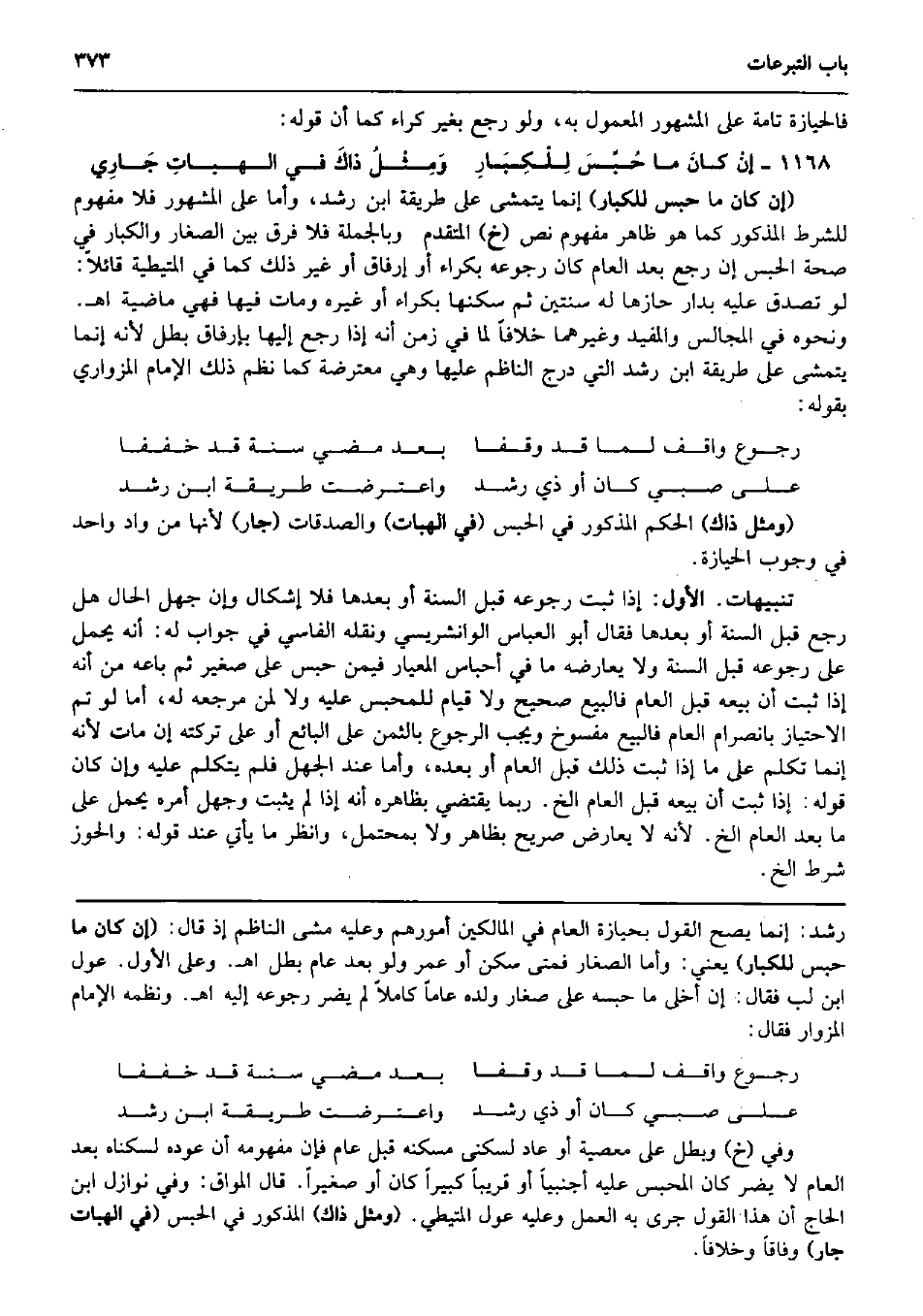 فالحيازة تَامَّة على الْمَشْهُور الْمَعْمُول بِهِ، وَلَو رَجَعَ بِغَيْر كِرَاء كَمَا أَن قَوْله: إنْ كانَ مَا حُبِّسَ لِلْكِبَارِ وَمِثْلُ ذاكَ فِي الهباتِ جَارِي (إِن كَانَ مَا حبس للكبار) إِنَّمَا يتمشى على طَريقَة ابْن رشد، وَأما على الْمَشْهُور فَلَا مَفْهُوم للشّرط الْمَذْكُور كَمَا هُوَ ظَاهر مَفْهُوم نَص (خَ) الْمُتَقَدّم. وَبِالْجُمْلَةِ فَلَا فرق بَين الصغار والكبار فِي صِحَة الْحَبْس إِن رَجَعَ بعد الْعَام كَانَ رُجُوعه بكرَاء أَو إرفاق أَو غير ذَلِك كَمَا فِي الْمُتَيْطِيَّة قَائِلا: لَو تصدق عَلَيْهِ بدار حازها لَهُ سنتَيْن ثمَّ سكنها بكرَاء أَو غَيره وَمَات فِيهَا فَهِيَ مَاضِيَة اه. وَنَحْوه فِي الْمجَالِس والمفيد وَغَيرهمَا خلافًا لما فِي زمن أَنه إِذا رَجَعَ إِلَيْهَا بإرفاق بَطل لِأَنَّهُ إِنَّمَا يتمشى على طَريقَة ابْن رشد الَّتِي درج النَّاظِم عَلَيْهَا وَهِي مُعْتَرضَة كَمَا نظم ذَلِك الإِمَام المزواري بقوله: رُجُوع وَاقِف لما قد وَقفا بعد مُضِيّ سنة قد خففا على صبي كَانَ أَو ذِي رشد واعترضت طَريقَة ابْن رشد (وَمثل ذَاك) الحكم الْمَذْكُور فِي الْحَبْس (فِي الهبات) وَالصَّدقَات (جَار) لِأَنَّهَا من وَاد وَاحِد فِي وجوب الْحِيَازَة. تَنْبِيهَات. الأول: إِذا ثَبت رُجُوعه قبل السّنة أَو بعْدهَا فَلَا إِشْكَال وَإِن جهل الْحَال هَل رَجَعَ قبل السّنة أَو بعْدهَا فَقَالَ أَبُو الْعَبَّاس الوانشريسي وَنَقله الفاسي فِي جَوَاب لَهُ: أَنه يحمل على رُجُوعه قبل السّنة وَلَا يُعَارضهُ مَا فِي أحباس المعيار فِيمَن حبس على صَغِير ثمَّ بَاعه من أَنه إِذا ثَبت أَن بَيْعه قبل الْعَام فَالْبيع صَحِيح وَلَا قيام للمحبس عَلَيْهِ وَلَا لمن مرجعه لَهُ، أما لَو تمّ الاحتياز بانصرام الْعَام فَالْبيع مفسوخ وَيجب الرُّجُوع بِالثّمن على البَائِع أَو على تركته إِن مَاتَ لِأَنَّهُ إِنَّمَا تكلم على مَا إِذا ثَبت ذَلِك قبل الْعَام أَو بعده، وَأما عِنْد الْجَهْل فَلم يتَكَلَّم عَلَيْهِ وَإِن كَانَ قَوْله: إِذا ثَبت أَن بَيْعه قبل الْعَام الخ. رُبمَا يَقْتَضِي بِظَاهِرِهِ أَنه إِذا لم يثبت وَجَهل أمره يحمل على مَا بعد الْعَام الخ. لِأَنَّهُ لَا يُعَارض صَرِيح بِظَاهِر وَلَا بمحتمل، وَانْظُر مَا يَأْتِي عِنْد قَوْله: والحوز شَرط الخ.