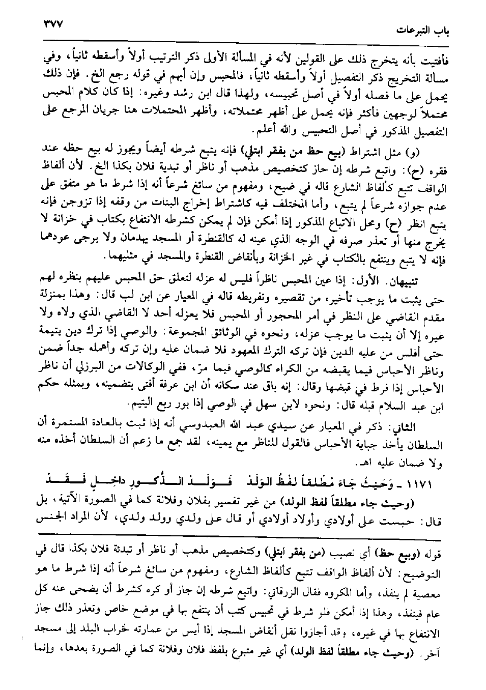 فأفتيت بِأَنَّهُ يتَخَرَّج ذَلِك على الْقَوْلَيْنِ لِأَنَّهُ فِي الْمَسْأَلَة الأولى ذكر التَّرْتِيب أَولا وأسقطه ثَانِيًا، وَفِي مَسْأَلَة التَّخْرِيج ذكر التَّفْصِيل أَولا وأسقطه ثَانِيًا، فالمحبس وَإِن أبهم فِي قَوْله رَجَعَ الخ. فَإِن ذَلِك يحمل على مَا فَصله أَولا فِي أصل تحبيسه، وَلِهَذَا قَالَ ابْن رشد وَغَيره: إِذا كَانَ كَلَام الْمحبس مُحْتملا لوَجْهَيْنِ فَأكْثر فَإِنَّهُ يحمل على أظهر محتملاته، وَأظْهر المحتملات هُنَا جَرَيَان الْمرجع على التَّفْصِيل الْمَذْكُور فِي أصل التحبيس وَالله أعلم. (و) مثل اشْتِرَاط (بيع حَظّ من بفقر ابْتُلِيَ) فَإِنَّهُ يتبع شَرطه أَيْضا وَيجوز لَهُ بيع حَظه عِنْد فقره (ح) : وَاتبع شَرطه إِن حَاز كتخصيص مَذْهَب أَو نَاظر أَو تبدية فلَان بِكَذَا الخ. لِأَن أَلْفَاظ الْوَاقِف تتبع كألفاظ الشَّارِع قَالَه فِي ضيح، وَمَفْهُوم من سَائِغ شرعا أَنه إِذا شَرط مَا هُوَ مُتَّفق على عدم جَوَازه شرعا لم يتبع وَأما الْمُخْتَلف فِيهِ كاشتراط إِخْرَاج الْبَنَات من وَقفه إِذا تَزَوَّجن فَإِنَّهُ يتبع انْظُر (ح) وَمحل الِاتِّبَاع الْمَذْكُور إِذا أمكن فَإِن لم يُمكن كشرطه الِانْتِفَاع بِكِتَاب فِي خزانَة لَا يخرج مِنْهَا أَو تعذر صرفه فِي الْوَجْه الَّذِي عينه لَهُ كالقنطرة أَو الْمَسْجِد يهدمان وَلَا يُرْجَى عودهما فَإِنَّهُ لَا يتبع وَينْتَفع بِالْكتاب فِي غير الخزانة وبأنقاض القنطرة وَالْمَسْجِد فِي مثليهما. تَنْبِيهَانِ. الأول: إِذا عين الْمحبس نَاظرا فَلَيْسَ لَهُ عَزله لتَعلق حق الْمحبس عَلَيْهِم بنظره لَهُم حَتَّى يثبت مَا يُوجب تَأْخِيره من تَقْصِيره وتفريطه قَالَه فِي المعيار عَن ابْن لب قَالَ: وَهَذَا بِمَنْزِلَة مقدم القَاضِي على النّظر فِي أَمر الْمَحْجُور أَو الْمحبس فَلَا يعزله أحد لَا القَاضِي الَّذِي ولاه وَلَا غَيره إِلَّا أَن يثبت مَا يُوجب عَزله، وَنَحْوه فِي الوثائق الْمَجْمُوعَة: وَالْوَصِيّ إِذا ترك دين يتيمة حَتَّى أفلس من عَلَيْهِ الدّين فَإِن تَركه التّرْك الْمَعْهُود فَلَا ضَمَان عَلَيْهِ وَإِن تَركه وَأَهْمَلَهُ جدا ضمن وناظر الأحباس فِيمَا يقبضهُ من الْكِرَاء كالوصي فِيمَا مرّ، فَفِي الوكالات من الْبُرْزُليّ أَن نَاظر الأحباس إِذا فرط فِي قبضهَا وَقَالَ: إِنَّه بَاقٍ عِنْد سكانه أَن ابْن عَرَفَة أفتى بتضمينه، وبمثله حكم ابْن عبد السَّلَام قبله قَالَ: وَنَحْوه لِابْنِ سهل فِي الْوَصِيّ إِذا بور ربع الْيَتِيم. الثَّانِي: ذكر فِي المعيار عَن سَيِّدي عبد الله العبدوسي أَنه إِذا ثَبت بِالْعَادَةِ المستمرة أَن السُّلْطَان يَأْخُذ جباية الأحباس فَالْقَوْل للنَّاظِر مَعَ يَمِينه، لقد جمع مَا زعم أَن السُّلْطَان أَخذه مِنْهُ وَلَا ضَمَان عَلَيْهِ اه. وَحَيْثُ جَاءَ مُطْلقاً لفْظُ الوَلَدْ فَوَلَدْ الذُّكورِ داخِلٍ فَقَدْ (وَحَيْثُ جَاءَ مُطلقًا لفظ الْوَلَد) من غير تَفْسِير بفلان وفلانة كَمَا فِي الصُّورَة الْآتِيَة، بل قَالَ: حبست على أَوْلَادِي وَأَوْلَاد أَوْلَادِي أَو قَالَ على وَلَدي وَولد وَلَدي، لِأَن المُرَاد الْجِنْس