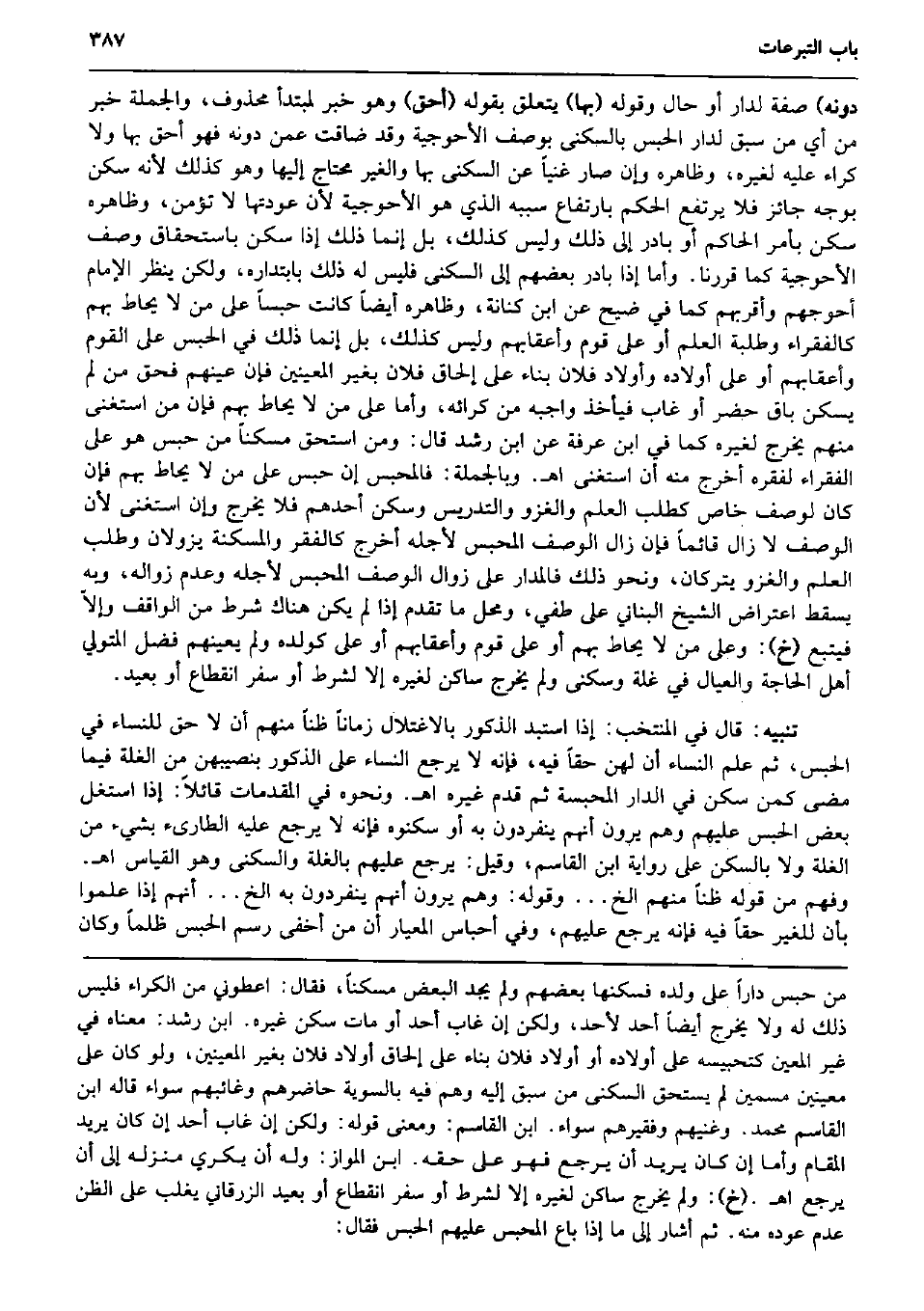 دونه) صفة لدار أَو حَال وَقَوله (بهَا) يتَعَلَّق بقوله (أَحَق) وَهُوَ خبر لمبتدأ مَحْذُوف، وَالْجُمْلَة خبر من أَي من سبق لدار الْحَبْس بِالسُّكْنَى بِوَصْف الأحوجية وَقد ضَاقَتْ عَمَّن دونه فَهُوَ أَحَق بهَا وَلَا كِرَاء عَلَيْهِ لغيره، وَظَاهره وَإِن صَار غَنِيا عَن السُّكْنَى بهَا والغير مُحْتَاج إِلَيْهَا وَهُوَ كَذَلِك لِأَنَّهُ سكن بِوَجْه جَائِز فَلَا يرْتَفع الحكم بارتفاع سَببه الَّذِي هُوَ الأحوجية لِأَن عودتها لَا تؤمن، وَظَاهره سكن بِأَمْر الْحَاكِم أَو بَادر إِلَى ذَلِك وَلَيْسَ كَذَلِك، بل إِنَّمَا ذَلِك إِذا سكن بِاسْتِحْقَاق وصف الأحوجية كَمَا قَررنَا. وَأما إِذا بَادر بَعضهم إِلَى السُّكْنَى فَلَيْسَ لَهُ ذَلِك بابتداره، وَلَكِن ينظر الإِمَام أحوجهم وأقربهم كَمَا فِي ضيح عَن ابْن كنَانَة، وَظَاهره أَيْضا كَانَت حبسا على من لَا يحاط بهم كالفقراء وطلبة الْعلم أَو على قوم وَأَعْقَابهمْ وَلَيْسَ كَذَلِك، بل إِنَّمَا ذَلِك فِي الْحَبْس على الْقَوْم وَأَعْقَابهمْ أَو على أَوْلَاده وَأَوْلَاد فلَان بِنَاء على إِلْحَاق فلَان بِغَيْر المعينين فَإِن عينهم فَحق من لم يسكن بَاقٍ حضر أَو غَابَ فَيَأْخُذ واجبه من كرائه، وَأما على من لَا يحاط بهم فَإِن من اسْتغنى مِنْهُم يخرج لغيره كَمَا فِي ابْن عَرَفَة عَن ابْن رشد قَالَ: وَمن اسْتحق مسكنا من حبس هُوَ على الْفُقَرَاء لفقره أخرج مِنْهُ أَن اسْتغنى اه. وَبِالْجُمْلَةِ: فالمحبس إِن حبس على من لَا يحاط بهم فَإِن كَانَ لوصف خَاص كَطَلَب الْعلم والغزو والتدريس وَسكن أحدهم فَلَا يخرج وَإِن اسْتغنى لِأَن الْوَصْف لَا زَالَ قَائِما فَإِن زَالَ الْوَصْف الْمحبس لأَجله أخرج كالفقر والمسكنة يزولان وَطلب الْعلم والغزو يتركان، وَنَحْو ذَلِك فالمدار على زَوَال الْوَصْف الْمحبس لأَجله وَعدم زَوَاله، وَبِه يسْقط اعْتِرَاض الشَّيْخ الْبنانِيّ على طفي، وَمحل مَا تقدم إِذا لم يكن هُنَاكَ شَرط من الْوَاقِف وإلاّ فَيتبع (خَ) : وعَلى من لَا يحاط بهم أَو على قوم وَأَعْقَابهمْ أَو على كولده وَلم يعينهم فضل الْمُتَوَلِي أهل الْحَاجة والعيال فِي غلَّة وسكنى وَلم يخرج سَاكن لغيره إِلَّا لشرط أَو سفر انْقِطَاع أَو بعيد. تَنْبِيه: قَالَ فِي الْمُنْتَخب: إِذا استبد الذُّكُور بالاغتلال زَمَانا ظنا مِنْهُم أَن لَا حق للنِّسَاء فِي الْحَبْس، ثمَّ علم النِّسَاء أَن لَهُنَّ حَقًا فِيهِ، فَإِنَّهُ لَا يرجع النِّسَاء على الذُّكُور بنصيبهن من الْغلَّة فِيمَا مضى كمن سكن فِي الدَّار المحبسة ثمَّ قدم غَيره اه. وَنَحْوه فِي الْمُقدمَات قَائِلا: إِذا استغل بعض الْحَبْس عَلَيْهِم وهم يرَوْنَ أَنهم ينفردون بِهِ أَو سكنوه فَإِنَّهُ لَا يرجع عَلَيْهِ الطارىء بِشَيْء من الْغلَّة وَلَا بالسكن على رِوَايَة ابْن الْقَاسِم، وَقيل: يرجع عَلَيْهِم بالغلة وَالسُّكْنَى وَهُوَ الْقيَاس اه. وَفهم من قَوْله ظنا مِنْهُم الخ ... وَقَوله: وهم يرَوْنَ أَنهم ينفردون بِهِ الخ ... أَنهم إِذا علمُوا بِأَن للْغَيْر حَقًا فِيهِ فَإِنَّهُ يرجع عَلَيْهِم وَفِي أحباس المعيار أَن من أخْفى رسم الْحَبْس ظلما وَكَانَ