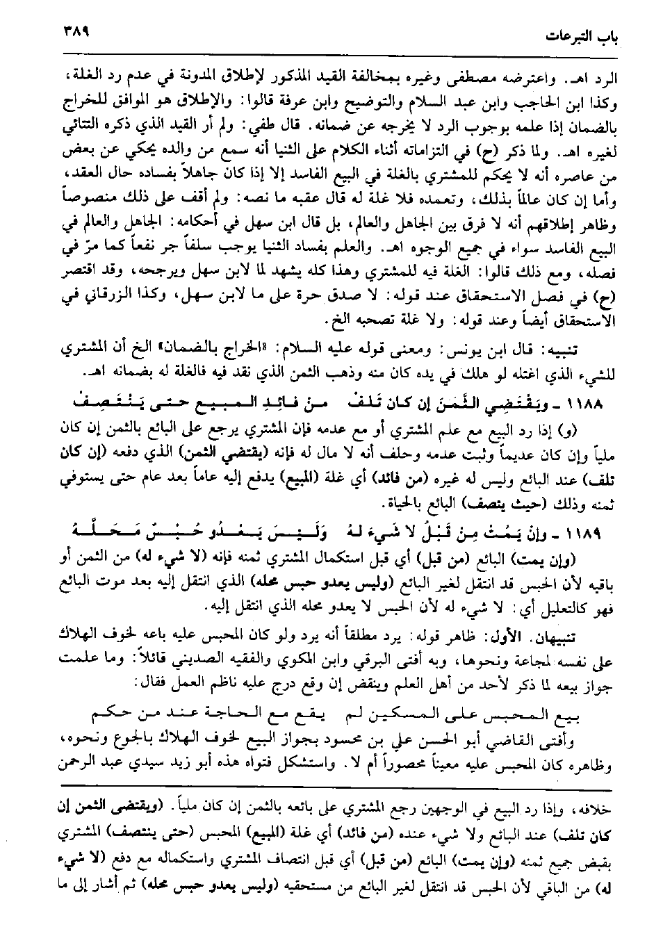 الرَّد اه. وَاعْتَرضهُ مصطفى وَغَيره بمخالفة الْقَيْد الْمَذْكُور لإِطْلَاق الْمُدَوَّنَة فِي عدم رد الْغلَّة، وَكَذَا ابْن الْحَاجِب وَابْن عبد السَّلَام والتوضيح وَابْن عَرَفَة قَالُوا: وَالْإِطْلَاق هُوَ الْمُوَافق للخراج بِالضَّمَانِ إِذا علمه بِوُجُوب الرَّد لَا يُخرجهُ عَن ضَمَانه. قَالَ طفي: وَلم أر الْقَيْد الَّذِي ذكره التتائي لغيره اه. وَلما ذكر (ح) فِي التزاماته أثْنَاء الْكَلَام على الثنيا أَنه سمع من وَالِده يَحْكِي عَن بعض من عاصره أَنه لَا يحكم للْمُشْتَرِي بالغلة فِي البيع الْفَاسِد إِلَّا إِذا كَانَ جَاهِلا بفساده حَال العقد، وَأما إِن كَانَ عَالما بذلك، وتعمده فَلَا غلَّة لَهُ قَالَ عقبه مَا نَصه: وَلم أَقف على ذَلِك مَنْصُوصا وَظَاهر إِطْلَاقهم أَنه لَا فرق بَين الْجَاهِل والعالم، بل قَالَ ابْن سهل فِي أَحْكَامه: الْجَاهِل والعالم فِي البيع الْفَاسِد سَوَاء فِي جَمِيع الْوُجُوه اه. وَالْعلم بِفساد الثنيا يُوجب سلفا جر نفعا كَمَا مرّ فِي فَصله، وَمَعَ ذَلِك قَالُوا: الْغلَّة فِيهِ للْمُشْتَرِي وَهَذَا كُله يشْهد لما لِابْنِ سهل ويرجحه، وَقد اقْتصر (ح) فِي فصل الِاسْتِحْقَاق عِنْد قَوْله: لَا صدق حرَّة على مَا لِابْنِ سهل، وَكَذَا الزّرْقَانِيّ فِي الِاسْتِحْقَاق أَيْضا وَعند قَوْله: وَلَا غلَّة تصحبه الخ. تَنْبِيه: قَالَ ابْن يُونُس: وَمعنى قَوْله عَلَيْهِ السَّلَام: (الْخراج بِالضَّمَانِ) الخ أَن المُشْتَرِي للشَّيْء الَّذِي اغتله لَو هلك فِي يَده كَانَ مِنْهُ وَذهب الثّمن الَّذِي نقد فِيهِ فالغلة لَهُ بضمانه اه. ويَقْتَضِي الثَّمَنَ إِن كَانَ تَلفْ منْ فائِدِ الْمَبِيع حَتَّى يَنْتَصِفْ (و) إِذا رد البيع مَعَ علم المُشْتَرِي أَو مَعَ عَدمه فَإِن المُشْتَرِي يرجع على البَائِع بِالثّمن إِن كَانَ مَلِيًّا وَإِن كَانَ عديماً وَثَبت عَدمه وَحلف أَنه لَا مَال لَهُ فَإِنَّهُ (يَقْتَضِي الثّمن) الَّذِي دَفعه (إِن كَانَ تلف) عِنْد البَائِع وَلَيْسَ لَهُ غَيره (من فائد) أَي غلَّة (الْمَبِيع) يدْفع إِلَيْهِ عَاما بعد عَام حَتَّى يَسْتَوْفِي ثمنه وَذَلِكَ (حَيْثُ يَتَّصِف) البَائِع بِالْحَيَاةِ. وإنْ يَمُتْ مِنْ قَبْلُ لَا شَيءَ لهُ وَلَيْسَ يَعْدُو حُبْسٌ مَحَلَّهُ (وَإِن يمت) البَائِع (من قبل) أَي قبل استكمال المُشْتَرِي ثمنه فَإِنَّهُ (لَا شَيْء لَهُ) من الثّمن أَو بَاقِيه لِأَن الْحَبْس قد انْتقل لغير البَائِع (وَلَيْسَ يعدو حبس مَحَله) الَّذِي انْتقل إِلَيْهِ بعد موت البَائِع فَهُوَ كالتعليل أَي: لَا شَيْء لَهُ لِأَن الْحَبْس لَا يعدو مَحَله الَّذِي انْتقل إِلَيْهِ. تَنْبِيهَانِ. الأول: ظَاهر قَوْله: يرد مُطلقًا أَنه يرد وَلَو كَانَ الْمحبس عَلَيْهِ بَاعه لخوف الْهَلَاك على نَفسه لمجاعة وَنَحْوهَا، وَبِه أفتى البرقي وَابْن المكوي والفقيه الصديني قَائِلا: وَمَا علمت جَوَاز بَيْعه لما ذكر لأحد من أهل الْعلم وينقض إِن وَقع درج عَلَيْهِ ناظم الْعَمَل فَقَالَ: بيع الْمحبس على الْمِسْكِين لم يَقع مَعَ الْحَاجة عِنْد من حكم وَأفْتى القَاضِي أَبُو الْحسن عَليّ بن مَحْسُود بِجَوَاز البيع لخوف الْهَلَاك بِالْجُوعِ وَنَحْوه، وَظَاهره كَانَ الْمحبس عَلَيْهِ معينا محصوراً أم لَا. وَاسْتشْكل فتواه هَذِه أَبُو زيد سَيِّدي عبد الرَّحْمَن