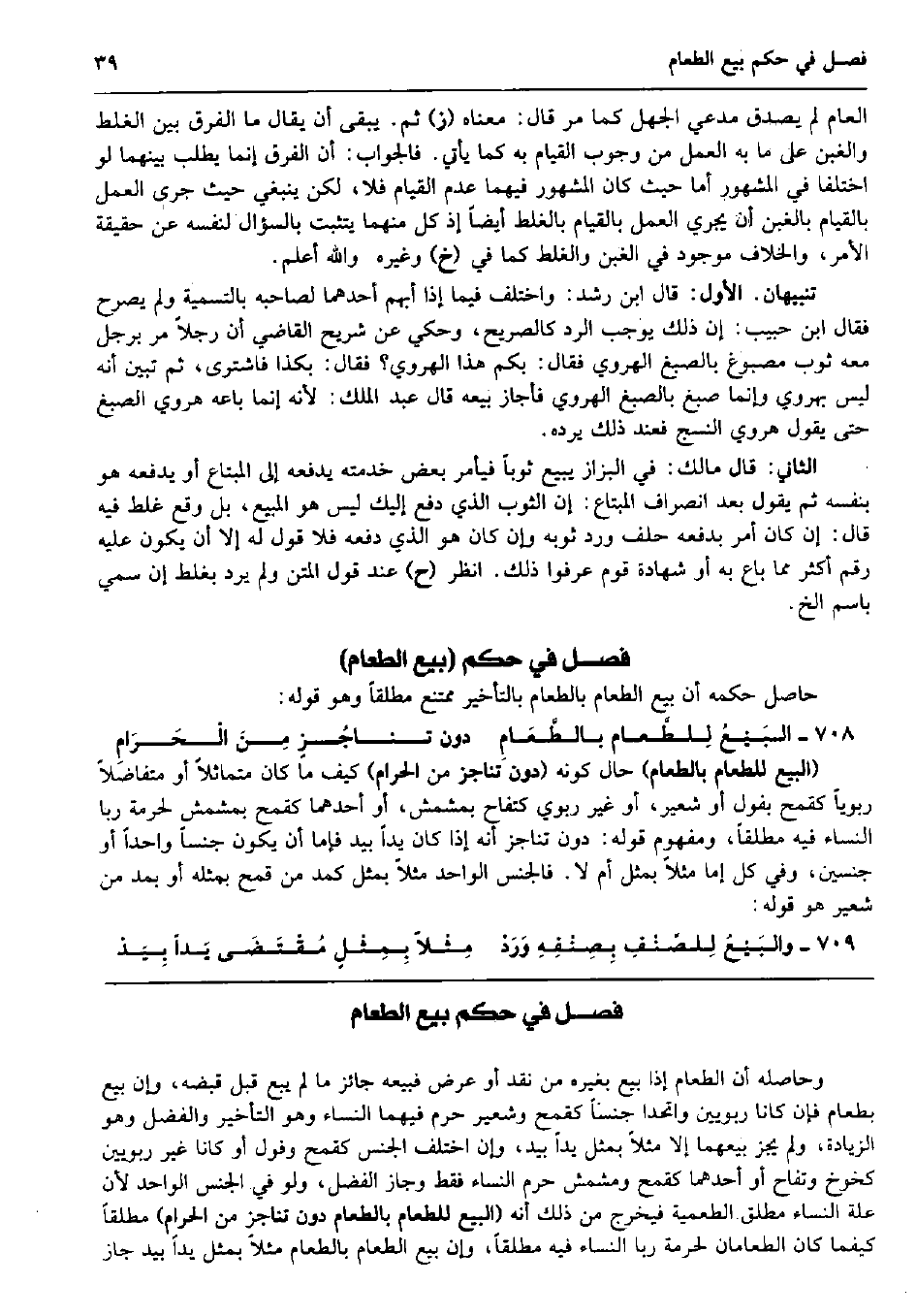 حَاصِل حكمه أَن بيع الطَّعَام بِالطَّعَامِ بِالتَّأْخِيرِ مُمْتَنع مُطلقًا وَهُوَ قَوْله: البَيْعُ لِلطَّعام بالطَّعَامِ دون تناجُزٍ مِنَ الْحَرَامِ (البيع للطعام بِالطَّعَامِ) حَال كَونه (دون تناجز من الْحَرَام) كَيفَ مَا كَانَ متماثلاً أَو مُتَفَاضلا ربوياً كقمح بفول أَو شعير، أَو غير رِبَوِيّ كتفاح بمشمش، أَو أَحدهمَا كقمح بمشمش لحُرْمَة رَبًّا النِّسَاء فِيهِ مُطلقًا، وَمَفْهُوم قَوْله: دون تناجز أَنه إِذا كَانَ يدا بيد فإمَّا أَن يكون جِنْسا وَاحِدًا أَو جِنْسَيْنِ، وَفِي كل إِمَّا مثلا بِمثل أم لَا. فالجنس الْوَاحِد مثلا بِمثل كمد من قَمح بِمثلِهِ أَو بِمد من شعير هُوَ قَوْله: والبَيْعُ لِلصِّنْفِ بِصِنْفِهِ وَرَدْ مِثْلاً بِمِثْلٍ مُقْتَضَى يَداً بِيَدْ