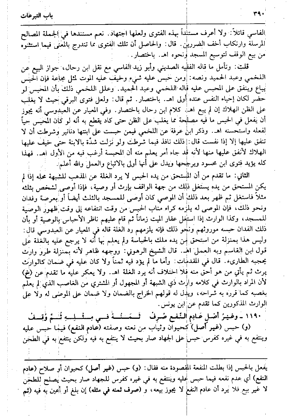 الفاسي قَائِلا: وَلَا أعرف مُسْتَندا بِهَذِهِ الْفَتْوَى ولعلها اجْتِهَاد. نعم مستندها فِي الْجُمْلَة الْمصَالح الْمُرْسلَة وارتكاب أخف الضررين. قَالَ: وَالْحَاصِل أَن تِلْكَ الْفَتْوَى مِمَّا تندرج بِالْمَعْنَى فِيمَا استثنوه من بيع الْوَقْف لتوسيع الْمَسْجِد وَنَحْوه اه. بِاخْتِصَار. قلت: وَتَأمل مَا قَالَه الْفَقِيه الصديني وَأَبُو زيد الفاسي مَعَ نقل ابْن رحال، جَوَاز البيع عَن اللَّخْمِيّ وَعبد الحميد وَنَصه: وَمن حبس عَلَيْهِ شَيْء وَخيف عَلَيْهِ الْمَوْت لمثل مجاعَة فَإِن الْحَبْس يُبَاع وَينْفق على الْمحبس عَلَيْهِ قَالَه اللَّخْمِيّ وَعبد الحميد. وَعلل اللَّخْمِيّ ذَلِك بِأَن الْمحبس لَو حضر لَكَانَ إحْيَاء النَّفس عِنْده أولى اه. بِاخْتِصَار. ثمَّ قَالَ: وَلَعَلَّ فَتْوَى البرقي حَيْثُ لَا يغلب على الظَّن الْهَلَاك إِن لم يبع اه. كَلَام ابْن رحال بِاخْتِصَار. وَفِي المعيار عَن العبدوسي أَنه يجوز أَن يفعل فِي الْحَبْس مَا فِيهِ مصلحَة مِمَّا يغلب على الظَّن حَتَّى كَاد يقطع بِهِ أَنه لَو كَانَ الْمحبس حَيا لفعله وَاسْتَحْسنهُ اه. وَذكر ابْن عَرَفَة عَن اللَّخْمِيّ فِيمَن حبست على ابْنَتهَا دَنَانِير وشرطت أَن لَا تنْفق عَلَيْهَا إِلَّا إِذا نفست قَالَ: ذَلِك نَافِذ فِيمَا شرطت وَلَو نزلت شدَّة بالابنة حَتَّى خيف عَلَيْهَا الْهَلَاك لأنفق عَلَيْهَا مِنْهَا لِأَنَّهُ قد جَاءَ أَمر يعلم مِنْهُ أَن المحبسة أَرغب فِيهِ من الأول اه. فَهَذَا كُله يُؤَيّد فَتْوَى ابْن مَحْسُود ويرجحها وَيدل على أَنَّهَا أولى بالاتباع وَالْعَمَل وَالله أعلم. الثَّانِي: مَا تقدم من أَن الْمُسْتَحق من يَده الْحَبْس لَا يرد الْغلَّة عَن الْمَذْهَب للشُّبْهَة مَحَله إِذا لم يكن الْمُسْتَحق من يَده يستغل ذَلِك من جِهَة الْوَاقِف بِإِرْث أَو وَصِيَّة، فَإِذا أوصى لشخص بِثُلثِهِ مثلا فاستغل ثمَّ ظهر بعد ذَلِك أَن الْمُوصي كَانَ أوصى لِلْمَسْجِدِ بِالثُّلثِ أَيْضا أَو بعرصة وفدان وَنَحْو ذَلِك، فَإِن الْمُوصى لَهُ يلْزمه كِرَاء مناب الْحَبْس من وَقت انتفاعه إِلَى وَقت ظُهُور الْوَصِيَّة لِلْمَسْجِدِ، وَكَذَا الْوَارِث إِذا استغل عقار الْمَيِّت زَمَانا ثمَّ قَامَ عَلَيْهِم نَاظر الأحباس بِالْوَصِيَّةِ أَو بِأَن ذَلِك الفدان حَبسه موروثهم وَنَحْو ذَلِك فَإِنَّهُ يلْزمهُم رد الْغلَّة قَالَه فِي المعيار عَن العبدوسي قَالَ: وَلَيْسَ هَذَا بِمَنْزِلَة من اسْتحق من يَده ملك بالحباسة وَلم يعلم بهَا أَنه لَا يرجع عَلَيْهِ بالغلة على قَول ابْن الْقَاسِم وَبِه الْعَمَل اه. قَالَ الشَّيْخ الرهوني: وَوَجهه ظَاهر لِأَنَّهُ بِمَنْزِلَة طرُو وَارِث يَحْجُبهُ الطارىء. قَالَ فِي الْمُقدمَات: وَأما مَا لم يؤد فِيهِ ثمنا وَلَا كَانَ عَلَيْهِ فِي ضَمَان كالوارث يَرث ثمَّ يَأْتِي من هُوَ أَحَق مِنْهُ فَلَا اخْتِلَاف أَنه يرد الْغلَّة اه. وَلَا يُعَكر عَلَيْهِ مَا تقدم عَن (خَ) لِأَن المُرَاد بالوارث فِي كَلَامه وَارِث ذِي الشُّبْهَة أَو الْمَجْهُول أَو المُشْتَرِي من الْغَاصِب الَّذِي لم يعلم بغصبه كَمَا قَرَّرَهُ بِهِ شراحه، وَيدل لَهُ قَوْلهم الْخراج بِالضَّمَانِ وَلَا ضَمَان على الْمُوصى لَهُ وَلَا على الْوَارِث الْمَذْكُورين كَمَا تقدم عَن ابْن يُونُس.