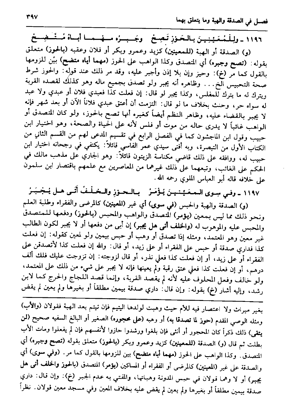 ولِلْمُعَيِّنِينَ بالحَوْزِ تَصِحْ وجَبرُه مهْما أباهُ مُتَّضِحْ (و) الصَّدَقَة أَو الْهِبَة (للمعينين) كزيد وَعَمْرو وَبكر أَو فلَان وعقبه (بالحوز) مُتَعَلق بقوله: (تصح وجبره) أَي الْمُتَصَدّق وَكَذَا الْوَاهِب على الْحَوْز (مهما أَيَّاهُ متضح) بيِّن للزومها بالْقَوْل كَمَا مر (خَ) : وحيز وَإِن بِلَا إِذن وأجبر عَلَيْهِ، وَقد مر ذَلِك عِنْد قَوْله: والحوز شَرط صِحَة التحبيس الخ ... وَظَاهره أَنه يجْبر وَلَو تصدق بِجَمِيعِ مَاله وَهُوَ كَذَلِك لقصده الْقرْبَة وَيتْرك لَهُ مَا يتْرك للْمُفلس، وَكَذَا يجْبر لَو قَالَ: إِن فعلت كَذَا فَعَبْدي فلَان أَو عَبدِي وَلَا عبد لَهُ سواهُ حر، وَحنث بِخِلَاف مَا لَو قَالَ: التزمت أَن أعتق عَبدِي فلَانا الْآن أَو بعد شهر فَإِنَّهُ لَا يجْبر بِالْقضَاءِ عَلَيْهِ، وَظَاهر النّظم أَيْضا كَغَيْرِهِ أَنَّهَا تصح بالحوز، وَلَو كَانَ الْمُتَصَدّق أَو الْوَاهِب غَائِبا لَا يدرى حَاله من موت أَو فلس لِأَنَّهُ على الْحَيَاة وَالصِّحَّة، وَهُوَ اخْتِيَار ابْن حبيب وَقَول ابْن الْمَاجشون كَمَا فِي الْفَصْل الرَّابِع فِي تَقْسِيم الْمُدعى لَهُم من الْقسم الثَّانِي من الْكتاب الأول من التَّبْصِرَة، وَبِه أفتى سَيِّدي عمر الفاسي قَائِلا: يَكْتَفِي فِي رجحانه اخْتِيَار ابْن حبيب لَهُ، وَوَافَقَهُ على ذَلِك قَاضِي مكناسة الزَّيْتُون قَائِلا: وَهُوَ الْجَارِي على مَذْهَب مَالك فِي الحكم على الْغَائِب، وتبعهما على ذَلِك غَيرهمَا من المعاصرين مَعَ علمهمْ باقتصار ابْن سَلمُون على خِلَافه قَالَه أَبُو الْعَبَّاس الملوي رَحمَه الله. وَفِي سِوى المعَيَّنينَ يُؤْمَرُ بالحوْزِ والخلْفُ أَتَى هَل يُجْبَرُ (و) الصَّدَقَة وَالْهِبَة وَالْحَبْس (فِي سوى) أَي غير (المعينين) كالمرضى والفقراء وطلبة الْعلم وَنَحْو ذَلِك مِمَّا لَيْسَ بِمعين (يُؤمر) الْمُتَصَدّق والواهب والمحبس (بالحوز) وَدفعهَا للمتصدق والمحبس عَلَيْهِ والموهوب لَهُ (وَالْخلف أَتَى هَل يجْبر) إِن أَبى من دَفعهَا أَو لَا يجْبر لكَون الطَّالِب غير معِين وَهُوَ الْمُعْتَمد، وَمثله إِذا تصدق أَو وهب أَو حبس بِيَمِين وَلَو لمُعين كَقَوْلِه: إِن فعلت كَذَا فداري صَدَقَة أَو حبس على الْفُقَرَاء أَو على زيد، أَو قَالَ: وَالله إِن فعلت كَذَا لأتصدقن على الْفُقَرَاء أَو على زيد، أَو إِن فعلت كَذَا فعلي نذر، أَو قَالَ لزوجته: إِن تزوجت عَلَيْك فلك ألف دِرْهَم، أَو إِن فعلت كَذَا فعلي عتق رَقَبَة وَلم يعينها فَإِنَّهُ لَا يجْبر على شَيْء من ذَلِك على الْمُعْتَمد، وَلَو خَالف وَفعل الْمَحْلُوف عَلَيْهِ لِأَنَّهُ لم يقْصد الْقرْبَة، وَإِنَّمَا قصد اللجاج والحرج كَمَا لِابْنِ رشد، وَإِلَيْهِ أَشَارَ (خَ) بقوله: وَإِن قَالَ: دَاري صَدَقَة بِيَمِين مُطلقًا أَو بغَيْرهَا وَلم يعين لم يقْض