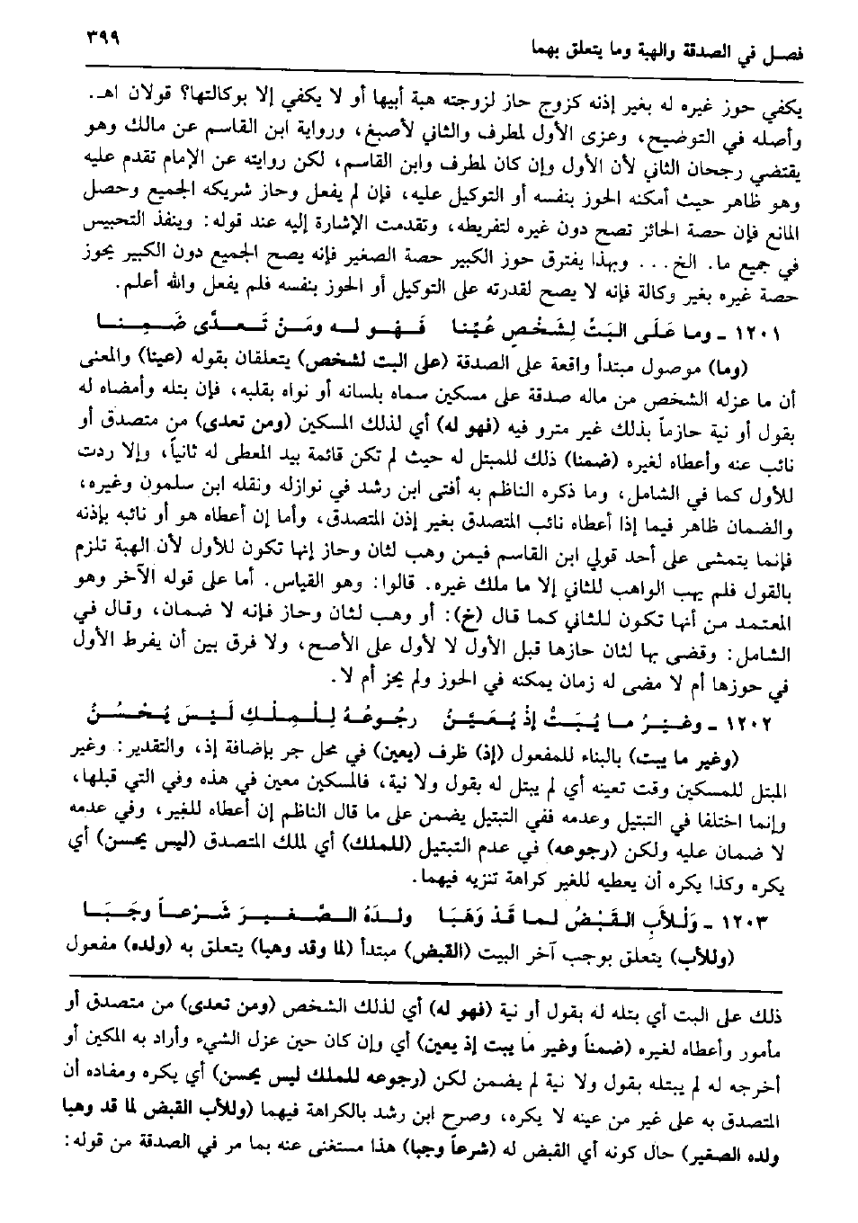 يَكْفِي حوز غَيره لَهُ بِغَيْر إِذْنه كَزَوج حَاز لزوجته هبة أَبِيهَا أَو لَا يَكْفِي إِلَّا بوكالتها؟ قَولَانِ اه. وَأَصله فِي التَّوْضِيح، وعزى الأول لمطرف وَالثَّانِي لأصبغ، وَرِوَايَة ابْن الْقَاسِم عَن مَالك وَهُوَ يَقْتَضِي رُجْحَان الثَّانِي لِأَن الأول وَإِن كَانَ لمطرف وَابْن الْقَاسِم، لَكِن رِوَايَته عَن الإِمَام تقدم عَلَيْهِ وَهُوَ ظَاهر حَيْثُ أمكنه الْحَوْز بِنَفسِهِ أَو التَّوْكِيل عَلَيْهِ، فَإِن لم يفعل وَحَازَ شَرِيكه الْجَمِيع وَحصل الْمَانِع فَإِن حِصَّة الْحَائِز تصح دون غَيره لتَفْرِيطه، وَتَقَدَّمت الْإِشَارَة إِلَيْهِ عِنْد قَوْله: وَينفذ التحبيس فِي جَمِيع مَا. الخ ... وَبِهَذَا يفْتَرق حوز الْكَبِير حِصَّة الصَّغِير فَإِنَّهُ يَصح الْجَمِيع دون الْكَبِير يحوز حِصَّة غَيره بِغَيْر وكَالَة فَإِنَّهُ لَا يَصح لقدرته على التَّوْكِيل أَو الْحَوْز بِنَفسِهِ فَلم يفعل وَالله أعلم. وَمَا عَلَى البَتِّ لِشَخْصٍ عُيِّنا فَهْو لَهُ ومَنْ تَعدَّى ضَمِنا (وَمَا) مَوْصُول مُبْتَدأ وَاقعَة على الصَّدَقَة (على الْبَتّ لشخص) يتعلقان بقوله (عينا) وَالْمعْنَى أَن مَا عَزله الشَّخْص من مَاله صَدَقَة على مِسْكين سَمَّاهُ بِلِسَانِهِ أَو نَوَاه بِقَلْبِه، فَإِن بتله وأمضاه لَهُ بقول أَو نِيَّة حازماً بذلك غير مترو فِيهِ (فَهُوَ لَهُ) أَي لذَلِك الْمِسْكِين (وَمن تعدى) من متصدق أَو نَائِب عَنهُ وَأَعْطَاهُ لغيره (ضمنا) ذَلِك للمبتل لَهُ حَيْثُ لم تكن قَائِمَة بيد الْمُعْطى لَهُ ثَانِيًا، وَإِلَّا ردَّتْ للْأولِ كَمَا فِي الشَّامِل، وَمَا ذكره النَّاظِم بِهِ أفتى ابْن رشد فِي نوازله وَنَقله ابْن سَلمُون وَغَيره، وَالضَّمان ظَاهر فِيمَا إِذا أعطَاهُ نَائِب الْمُتَصَدّق بِغَيْر إِذن الْمُتَصَدّق، وَأما إِن أعطَاهُ هُوَ أَو نَائِبه بِإِذْنِهِ فَإِنَّمَا يتمشى على أحد قولي ابْن الْقَاسِم فِيمَن وهب لثان وَحَازَ إِنَّهَا تكون للْأولِ لِأَن الْهِبَة تلْزم بالْقَوْل فَلم يهب الْوَاهِب للثَّانِي إِلَّا مَا ملك غَيره. قَالُوا: وَهُوَ الْقيَاس. أما على قَوْله الآخر وَهُوَ الْمُعْتَمد من أَنَّهَا تكون للثَّانِي كَمَا قَالَ (خَ) : أَو وهب لثان وَحَازَ فَإِنَّهُ لَا ضَمَان، وَقَالَ فِي الشَّامِل: وَقضى بهَا لثان حازها قبل الأول لَا لأوّل على الْأَصَح، وَلَا فرق بَين أَن يفرط الأول فِي حوزها أم لَا مضى لَهُ زمَان يُمكنهُ فِي الْحَوْز وَلم يحز أم لَا. وغيْرُ مَا يُبَتُّ إذْ يُعَيَّنُ رجُوعُهُ لِلْمِلْكِ لَيْسَ يُحْسُنُ (وَغير مَا يبت) بِالْبِنَاءِ للْمَفْعُول (إِذْ) ظرف (يعين) فِي مَحل جر بِإِضَافَة إِذْ وَالتَّقْدِير: وَغير المبتل للمسكين وَقت تعينه أَي لم يبتل لَهُ بقول وَلَا نِيَّة، فالمسكين معِين فِي هَذِه وَفِي الَّتِي قبلهَا، وَإِنَّمَا اخْتلفَا فِي التبتيل وَعَدَمه فَفِي التبتيل يضمن على مَا قَالَ النَّاظِم إِن أعطَاهُ للْغَيْر، وَفِي عَدمه لَا ضَمَان عَلَيْهِ وَلَكِن (رُجُوعه) فِي عدم التبتيل (للْملك) أَي لملك الْمُتَصَدّق (لَيْسَ يحسن) أَي يكره وَكَذَا يكره أَن يُعْطِيهِ للْغَيْر كَرَاهَة تَنْزِيه فيهمَا. وَلْلأَبِ القَبْضُ لما قَدْ وَهَبَا ولدَهُ الصَّغيرَ شَرْعاً وجَبَا (وَللْأَب) يتَعَلَّق بوجب آخر الْبَيْت (الْقَبْض) مُبْتَدأ (لما وَقد وهبا) يتَعَلَّق بِهِ (وَلَده) مفعول