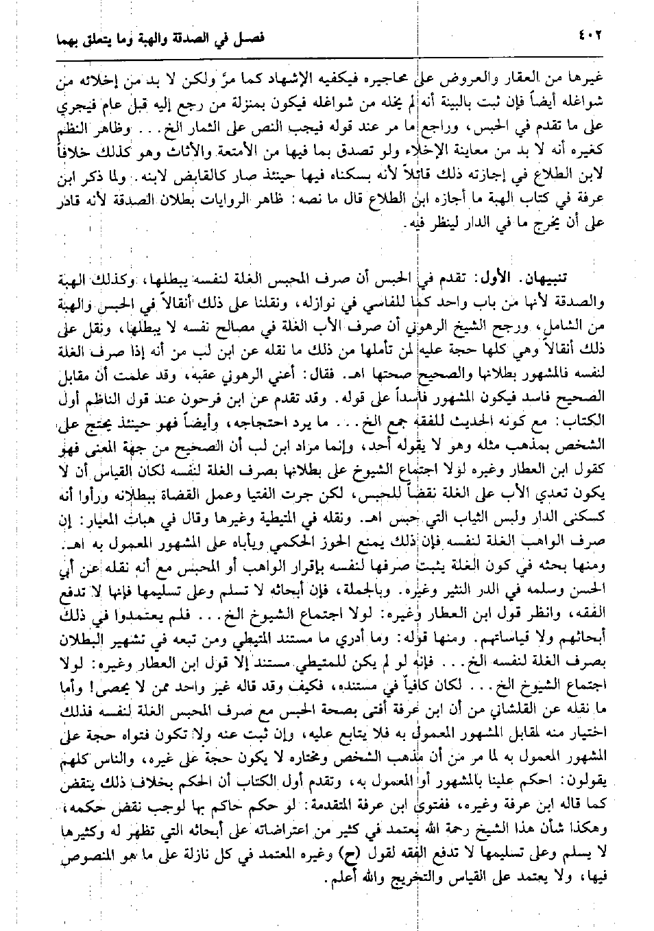 غَيرهَا من الْعقار وَالْعرُوض على محاجيره فيكفيه الْإِشْهَاد كَمَا مرَّ وَلَكِن لَا بُد من إخلائه من شواغله أَيْضا فَإِن ثَبت بِالْبَيِّنَةِ أَنه لم يخله من شواغله فَيكون بِمَنْزِلَة من رَجَعَ إِلَيْهِ قبل عَام فَيجْرِي على مَا تقدم فِي الْحَبْس، وراجع مَا مر عِنْد قَوْله فَيجب النَّص على الثِّمَار الخ ... وَظَاهر النّظم كَغَيْرِهِ أَنه لَا بُد من مُعَاينَة الإخلاء وَلَو تصدق بِمَا فِيهَا من الْأَمْتِعَة والأثاث وَهُوَ كَذَلِك خلافًا لِابْنِ الطلاع فِي إِجَازَته ذَلِك قَائِلا لِأَنَّهُ بسكناه فِيهَا حِينَئِذٍ صَار كالقابض لِابْنِهِ. وَلما ذكر ابْن عَرَفَة فِي كتاب الْهِبَة مَا أجَازه ابْن الطلاع قَالَ مَا نَصه: ظَاهر الرِّوَايَات بطلَان الصَّدَقَة لِأَنَّهُ قَادر على أَن يخرج مَا فِي الدَّار لينْظر فِيهِ. تَنْبِيهَانِ. الأول: تقدم فِي الْحَبْس أَن صرف الْمحبس الْغلَّة لنَفسِهِ يُبْطِلهَا، وَكَذَلِكَ الْهِبَة وَالصَّدَََقَة لِأَنَّهَا من بَاب وَاحِد كَمَا للفاسي فِي نوازله، ونقلنا على ذَلِك أنقالاً فِي الْحَبْس وَالْهِبَة من الشَّامِل، وَرجح الشَّيْخ الرهوني أَن صرف الْأَب الْغلَّة فِي مصَالح نَفسه لَا يُبْطِلهَا، وَنقل على ذَلِك أنقالاً وَهِي كلهَا حجَّة عَلَيْهِ لمن تأملها من ذَلِك مَا نَقله عَن ابْن لب من أَنه إِذا صرف الْغلَّة لنَفسِهِ فَالْمَشْهُور بُطْلَانهَا وَالصَّحِيح صِحَّتهَا اه. فَقَالَ: أَعنِي الرهوني عقبه، وَقد علمت أَن مُقَابل الصَّحِيح فَاسد فَيكون الْمَشْهُور فَاسِدا على قَوْله. وَقد تقدم عَن ابْن فَرِحُونَ عِنْد قَول النَّاظِم أول الْكتاب: مَعَ كَونه الحَدِيث للفقه جمع الخ ... مَا يرد احتجاجه، وَأَيْضًا فَهُوَ حِينَئِذٍ يحْتَج على الشَّخْص بِمذهب مثله وَهُوَ لَا يَقُوله أحد، وَإِنَّمَا مُرَاد ابْن لب أَن الصَّحِيح من جِهَة الْمَعْنى فَهُوَ كَقَوْل ابْن الْعَطَّار وَغَيره لَوْلَا اجْتِمَاع الشُّيُوخ على بُطْلَانهَا بِصَرْف الْغلَّة لنَفسِهِ لَكَانَ الْقيَاس أَن لَا يكون تعدِي الْأَب على الْغلَّة نقضا للحبس، لَكِن جرت الْفتيا وَعمل الْقُضَاة بِبُطْلَانِهِ وَرَأَوا أَنه كسكنى الدَّار وَلبس الثِّيَاب الَّتِي حبس اه. وَنَقله فِي الْمُتَيْطِيَّة وَغَيرهَا وَقَالَ فِي هبات المعيار: إِن صرف الْوَاهِب الْغلَّة لنَفسِهِ فَإِن ذَلِك يمْنَع الْحَوْز الْحكمِي ويأباه على الْمَشْهُور الْمَعْمُول بِهِ اه. وَمِنْهَا بَحثه فِي كَون الْغلَّة يثبت صرفهَا لنَفسِهِ بِإِقْرَار الْوَاهِب أَو الْمحبس مَعَ أَنه نَقله عَن أبي الْحسن وَسلمهُ فِي الدّرّ النثير وَغَيره. وَبِالْجُمْلَةِ، فَإِن أبحاثه لَا تسلم وعَلى تَسْلِيمهَا فَإِنَّهَا لَا تدفع الْفِقْه، وَانْظُر قَول ابْن الْعَطَّار وَغَيره: لَوْلَا اجْتِمَاع الشُّيُوخ الخ ... فَلم يعتمدوا فِي ذَلِك أبحاثهم وَلَا قياساتهم. وَمِنْهَا قَوْله: وَمَا أَدْرِي مَا مُسْتَند المتيطي وَمن تبعه فِي تشهير الْبطلَان بِصَرْف الْغلَّة لنَفسِهِ الخ ... فَإِنَّهُ لَو لم يكن للمتيطي مُسْتَند إِلَّا قَول ابْن الْعَطَّار وَغَيره: لَوْلَا اجْتِمَاع الشُّيُوخ الخ ... لَكَانَ كَافِيا فِي مُسْتَنده، فَكيف وَقد قَالَه غير وَاحِد مِمَّن لَا يُحْصى وَأما مَا نَقله عَن القلشاني من أَن ابْن عَرَفَة أفتى بِصِحَّة الْحَبْس مَعَ صرف الْمحبس الْغلَّة لنَفسِهِ فَذَلِك اخْتِيَار مِنْهُ لمقابل الْمَشْهُور الْمَعْمُول بِهِ فَلَا يُتَابع عَلَيْهِ، وَإِن ثَبت عَنهُ وَلَا تكون فتواه حجَّة على الْمَشْهُور الْمَعْمُول بِهِ لما مر من أَن مَذْهَب الشَّخْص ومختاره لَا يكون حجَّة على غَيره، وَالنَّاس كلهم يَقُولُونَ: احكم علينا بالمشهور أَو الْمَعْمُول بِهِ، وَتقدم أول الْكتاب أَن الحكم بِخِلَاف ذَلِك ينْقض كَمَا قَالَه ابْن عَرَفَة وَغَيره، ففتوى ابْن عَرَفَة الْمُتَقَدّمَة: لَو حكم حَاكم بهَا لوَجَب