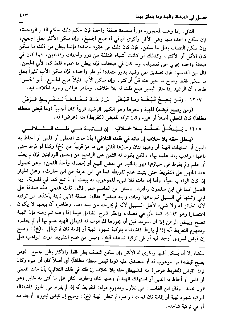 الثَّانِي: إِذا وهب لمحجوره دوراً مُتعَدِّدَة صَفْقَة وَاحِدَة فَإِن حكم ذَلِك حكم الدَّار الْوَاحِدَة، فَإِن سكن وَاحِدَة مِنْهَا وَهِي الْأَقَل وأكرى الْبَاقِي لَهُ صَحَّ الْجَمِيع، وَإِن سكن الْأَكْثَر بَطل الْجَمِيع، وَإِن سكن النّصْف بَطل مَا سكن، فَإِن كَانَ ذَلِك فِي عُقُود مُتعَدِّدَة فَإِنَّمَا يبطل من ذَلِك مَا سكن كَانَ الْأَقَل أَو الْأَكْثَر، وَكَذَلِكَ لَو كَانَت أَشْيَاء مُخْتَلفَة من دور وأجنات وفدادين، فَمَا كَانَ فِي صَفْقَة وَاحِدَة يجْرِي على تَفْصِيله، وَمَا كَانَ فِي صفقات فَإِنَّهُ يبطل مَا عمره فَقَط كَمَا لأبي الْحسن. قَالَ ابْن الْقَاسِم: فَإِن تَصْدِيق على رشيد بدور مُتعَدِّدَة أَو دَار وَاحِدَة، فَإِن سكن الْأَب كثيرا بَطل مَا سكن فَقَط وَصَحَّ مَا حيّز عَنهُ قلَّ أَو كثر، وَإِن سكن الْأَب قَلِيلا صَحَّ الْجَمِيع. أَبُو الْحسن: ظَاهره أَن الرشيد إِذا حَاز الْيَسِير صَحَّ ذَلِك لَهُ بِلَا خلاف، وَظَاهر عِيَاض وجود الْخلاف فِيهِ. ومَنْ يَصِحُّ قَبْضُهُ وَمَا قَبَضْ مُعْطاهُ مُطْلَقاً لتفْرِيطٍ عَرَضْ (وَمن يَصح قَبضه) للهبة وَنَحْوهَا وَهُوَ الْكَبِير الرشيد قَرِيبا كَانَ أَجْنَبِيّا (وَمَا قبض معطاه مُطلقًا) كَانَ الْمُعْطِي أصلا أَو غَيره وَكَانَ تَركه للقبض (لتفريط) مِنْهُ (عرض) لَهُ. يَبْطُلُ حَقُّهُ بِلا خِلاَفٍ إِن فَاتَهُ فِي ذَلِك التّلاَفِي (يبطل حَقه بِلَا خلاف إِن فَاتَهُ فِي ذَلِك التلافي) بِأَن مَاتَ الْمُعْطِي أَو فلس أَو أحَاط بِهِ الدّين أَو اسْتهْلك الْهِبَة أَو وَهبهَا لثان وحازها الثَّانِي على مَا مرّ قَرِيبا عَن (خَ) وَكَذَا لَو فرط حَتَّى بَاعهَا الْوَاهِب بعد علمه بهَا، وَلَكِن يكون لَهُ الثّمن على الرَّاجِح من إِحْدَى الرِّوَايَتَيْنِ فَإِن لم يعلم أَو علم وَلم يفرط فِي حيازتها فَهُوَ بِالْخِيَارِ فِي نقض البيع أَو إمضائه وَأخذ الثّمن، وَهُوَ مَحْمُول عِنْد الْجَهْل على التَّفْرِيط حَتَّى يثبت عدم تفريطه كَمَا فِي ابْن عَرَفَة عَن ابْن حَارِث، وَمحل الْخِيَار إِذا كَانَ الْوَاهِب حَيا، وَأما إِن مَاتَ فَلَا شَيْء للْمَوْهُوب لَهُ بِيعَتْ أَو لم تبع كَمَا فِي الْمُدَوَّنَة، وَبِه الْعَمَل كَمَا فِي ابْن سَلمُون والمفيد. وَسُئِلَ ابْن الْقَاسِم عَمَّن قَالَ: ثلث غنمي هَذِه صَدَقَة على ابْني وثلثها فِي السَّبِيل ثمَّ بَاعهَا وَمَات وَابْنه صَغِير؟ فَقَالَ: صَدَقَة الابْن ثَابِتَة يَأْخُذهَا من تركته لِأَنَّهُ الْحَائِز لَهُ وَلَا شَيْء لأهل السَّبِيل لِأَنَّهُ لم يُخرجهُ من يَده اه. وَظَاهره أَن بيعهَا لَا يكون اعتصاراً وَهُوَ كَذَلِك كَمَا يَأْتِي فِي فَصله، وَانْظُر شرح الشَّامِل فِيمَا إِذا وهبه ثمَّ رَهنه فَإِن الْهِبَة تصح وَيبْطل الرَّهْن إِلَّا أَن يَمُوت قبل أَن يحوزها الْمَوْهُوب لَهُ فَتبْطل الْهِبَة علم بهَا أَو لم يعلم، وَمَفْهُوم التَّفْرِيط أَنه إِذا لم يفرط كاشتغاله بتزكية شُهُود الْهِبَة أَو إِقَامَة ثَان لم تبطل. (خَ) : وَصَحَّ إِن قبض ليتروى أوجد فِيهِ أَو فِي تَزْكِيَة شَاهده الخ. وَلَيْسَ من عدم التَّفْرِيط موت الْوَاهِب قبل