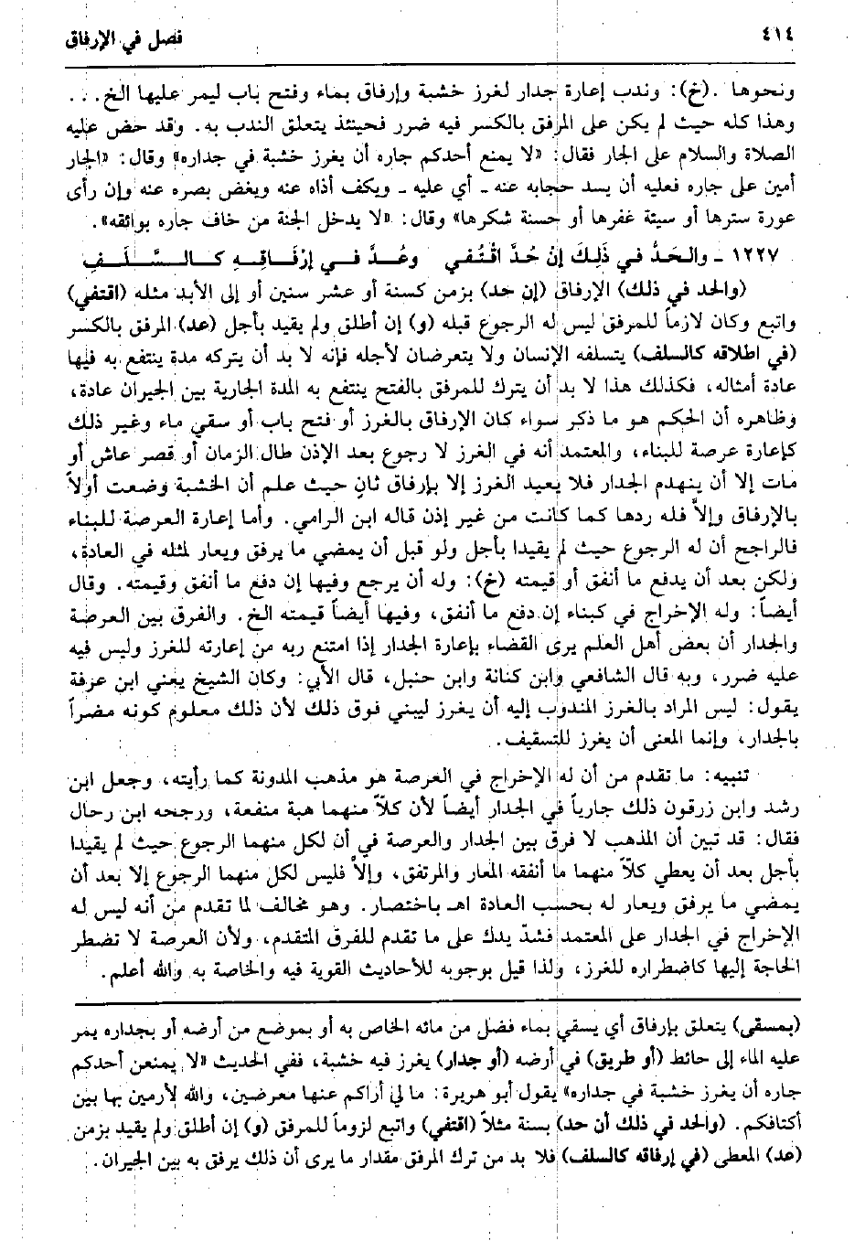 وَنَحْوهَا. (خَ) : وَندب إِعَارَة جِدَار لغرز خَشَبَة وإرفاق بِمَاء وَفتح بَاب ليمر عَلَيْهَا الخ ... وَهَذَا كُله حَيْثُ لم يكن على الْمرْفق بِالْكَسْرِ فِيهِ ضَرَر فَحِينَئِذٍ يتَعَلَّق النّدب بِهِ. وَقد حض عَلَيْهِ الصَّلَاة وَالسَّلَام على الْجَار فَقَالَ: (لَا يمْنَع أحدكُم جَاره أَن يغرز خَشَبَة فِي جِدَاره) وَقَالَ: (الْجَار أَمِين على جَاره فَعَلَيهِ أَن يسد حجابه عَنهُ أَي عَلَيْهِ ويكف أَذَاهُ عَنهُ ويغض بَصَره عَنهُ وَإِن رأى عَورَة سترهَا أَو سَيِّئَة غفرها أَو حَسَنَة شكرها) وَقَالَ: (لَا يدْخل الْجنَّة من خَافَ جَاره بوائقه) . والحَدُّ فِي ذَلِكَ إنْ حُدَّ اقْتُفي وعُدَّ فِي إرْفَاقِهِ كالسَّلَفِ (وَالْحَد فِي ذَلِك) الإرفاق (إِن حد) بِزَمن كَسنة أَو عشر سِنِين أَو إِلَى الْأَبَد مثله (اقتفي) وَاتبع وَكَانَ لَازِما للمرفق لَيْسَ لَهُ الرُّجُوع قبله (و) إِن أطلق وَلم يُقيد بِأَجل (عد) الْمرْفق بِالْكَسْرِ (فِي اطلاقه كالسلف) يتسلفه الْإِنْسَان وَلَا يتعرضان لأَجله فَإِنَّهُ لَا بُد أَن يتْركهُ مُدَّة ينْتَفع بِهِ فِيهَا عَادَة أَمْثَاله، فَكَذَلِك هَذَا لَا بُد أَن يتْرك للمرفق بِالْفَتْح ينْتَفع بِهِ الْمدَّة الْجَارِيَة بَين الْجِيرَان عَادَة، وَظَاهره أَن الحكم هُوَ مَا ذكر سَوَاء كَانَ الإرفاق بالغرز أَو فتح بَاب أَو سقِِي مَاء وَغير ذَلِك كإعارة عَرصَة للْبِنَاء، وَالْمُعْتَمد أَنه فِي الغرز لَا رُجُوع بعد الْإِذْن طَال الزَّمَان أَو قصر عَاشَ أَو مَاتَ إِلَّا أَن ينهدم الْجِدَار فَلَا يُعِيد الغرز إِلَّا بإرفاق ثانٍ حَيْثُ علم أَن الْخَشَبَة وضعت أَولا بالإرفاق وإلاَّ فَلهُ ردهَا كَمَا كَانَت من غير إِذن قَالَه ابْن الرَّامِي. وَأما إِعَارَة الْعَرَصَة للْبِنَاء فالراجح أَن لَهُ الرُّجُوع حَيْثُ لم يقيدا بِأَجل وَلَو قبل أَن يمْضِي مَا يرفق ويعار لمثله فِي الْعَادة، وَلَكِن بعد أَن يدْفع مَا أنْفق أَو قِيمَته (خَ) : وَله أَن يرجع وفيهَا إِن دفع مَا أنْفق وَقِيمَته. وَقَالَ أَيْضا: وَله الْإِخْرَاج فِي كبناء إِن دفع مَا أنْفق، وفيهَا أَيْضا قِيمَته الخ. وَالْفرق بَين الْعَرَصَة والجدار أَن بعض أهل الْعلم يرى الْقَضَاء بإعارة الْجِدَار إِذا امْتنع ربه من إعارته للغرز وَلَيْسَ فِيهِ عَلَيْهِ ضَرَر، وَبِه قَالَ الشَّافِعِي وَابْن كنَانَة وَابْن حَنْبَل، قَالَ الأبي: وَكَانَ الشَّيْخ يَعْنِي ابْن عَرَفَة يَقُول: لَيْسَ المُرَاد بالغرز الْمَنْدُوب إِلَيْهِ أَن يغرز ليبني فَوق ذَلِك لِأَن ذَلِك مَعْلُوم كَونه مضراً بالجدار، وَإِنَّمَا الْمَعْنى أَن يغرز للتسقيف. تَنْبِيه: مَا تقدم من أَن لَهُ الْإِخْرَاج فِي الْعَرَصَة هُوَ مَذْهَب الْمُدَوَّنَة كَمَا رَأَيْته، وَجعل ابْن رشد وَابْن زرقون ذَلِك جَارِيا فِي الْجِدَار أَيْضا لِأَن كلا مِنْهُمَا هبة مَنْفَعَة، وَرجحه ابْن رحال فَقَالَ: قد تبين أَن الْمَذْهَب لَا فرق بَين الْجِدَار والعرصة فِي أَن لكل مِنْهُمَا الرُّجُوع حَيْثُ لم يقيدا بِأَجل بعد أَن يُعْطي كلا مِنْهُمَا مَا أنفقهُ المعار والمرتفق، وإلاَّ فَلَيْسَ لكل مِنْهُمَا الرُّجُوع إِلَّا بعد أَن يمْضِي مَا يرفق ويعار لَهُ بِحَسب الْعَادة اه بِاخْتِصَار. وَهُوَ مُخَالف لما تقدم من أَنه لَيْسَ لَهُ الْإِخْرَاج فِي الْجِدَار على الْمُعْتَمد فشدّ يدك على مَا تقدم للْفرق الْمُتَقَدّم وَلِأَن الْعَرَصَة لَا تضطر الْحَاجة إِلَيْهَا كاضطراره للغرز، وَلذَا قيل بِوُجُوبِهِ للأحاديث القوية فِيهِ والخاصة بِهِ وَالله أعلم.