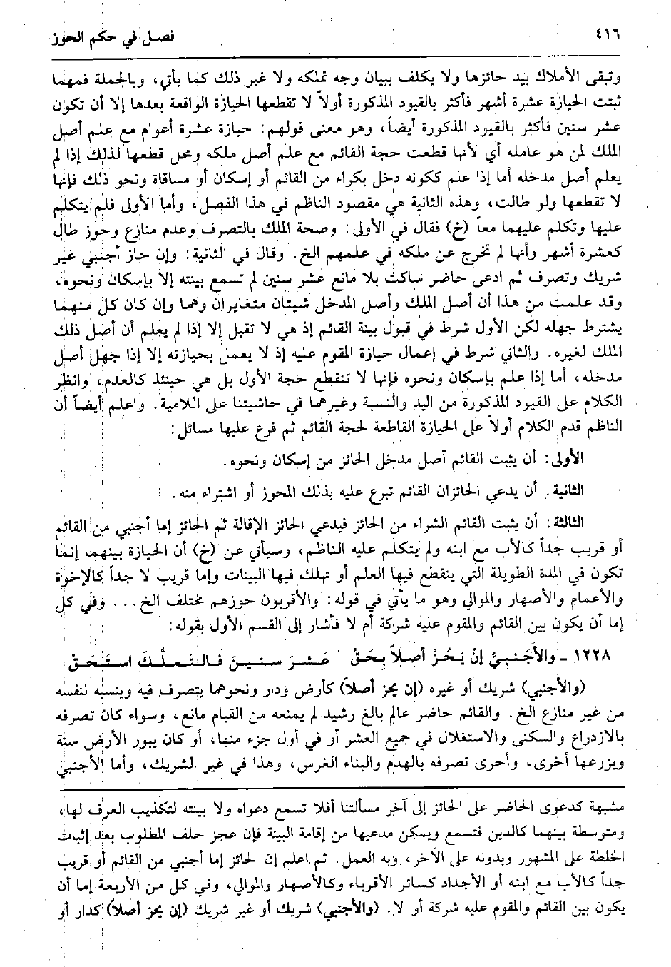 وَتبقى الْأَمْلَاك بيد حائزها وَلَا يُكَلف بِبَيَان وَجه تملكه وَلَا غير ذَلِك كَمَا يَأْتِي، وَبِالْجُمْلَةِ فمهما ثبتَتْ الْحِيَازَة عشرَة أشهر فَأكْثر بالقيود الْمَذْكُورَة أَولا لَا تقطعها الْحِيَازَة الْوَاقِعَة بعْدهَا إِلَّا أَن تكون عشر سِنِين فَأكْثر بالقيود الْمَذْكُورَة أَيْضا، وَهُوَ معنى قَوْلهم: حِيَازَة عشرَة أَعْوَام مَعَ علم أصل الْملك لمن هُوَ عَامله أَي لِأَنَّهَا قطعت حجَّة الْقَائِم مَعَ علم أصل ملكه وَمحل قطعهَا لذَلِك إِذا لم يعلم أصل مدخله أما إِذا علم كَكَوْنِهِ دخل بكرَاء من الْقَائِم أَو إسكان أَو مُسَاقَاة وَنَحْو ذَلِك فَإِنَّهَا لَا تقطعها وَلَو طَالَتْ، وَهَذِه الثَّانِيَة هِيَ مَقْصُود النَّاظِم فِي هَذَا الْفَصْل، وَأما الأولى فَلم يتَكَلَّم عَلَيْهَا وَتكلم عَلَيْهِمَا مَعًا (خَ) فَقَالَ فِي الأولى: وَصِحَّة الْملك بِالتَّصَرُّفِ وَعدم مُنَازع وحوز طَال كعشرة أشهر وَأَنَّهَا لم تخرج عَن ملكه فِي علمهمْ الخ. وَقَالَ فِي الثَّانِيَة: وَإِن حَاز أَجْنَبِي غير شريك وَتصرف ثمَّ ادّعى حَاضر سَاكِت بِلَا مَانع عشر سِنِين لم تسمع بَينته إِلَّا بِإِسْكَان وَنَحْوه، وَقد علمت من هَذَا أَن أصل الْملك وأصل الْمدْخل شَيْئَانِ متغايران وهما وَإِن كَانَ كل مِنْهُمَا يشْتَرط جَهله لَكِن الأول شَرط فِي قبُول بَيِّنَة الْقَائِم إِذْ هِيَ لَا تقبل إِلَّا إِذا لم يعلم أَن أصل ذَلِك الْملك لغيره. وَالثَّانِي شَرط فِي إِعْمَال حِيَازَة الْمُقَوّم عَلَيْهِ إِذْ لَا يعْمل بحيازته إِلَّا إِذا جهل أصل مدخله، أما إِذا علم بِإِسْكَان وَنَحْوه فَإِنَّهَا لَا تَنْقَطِع حجَّة الأول بل هِيَ حِينَئِذٍ كَالْعدمِ، وَانْظُر الْكَلَام على الْقُيُود الْمَذْكُورَة من الْيَد وَالنِّسْبَة وَغَيرهمَا فِي حاشيتنا على اللامية. وَاعْلَم أَيْضا أَن النَّاظِم قدم الْكَلَام أَولا على الْحِيَازَة القاطعة لحجة الْقَائِم ثمَّ فرع عَلَيْهَا مسَائِل: الأولى: أَن يثبت الْقَائِم أصل مدْخل الْحَائِز من إسكان وَنَحْوه. الثَّانِيَة: أَن يَدعِي الحائزان الْقَائِم تبرع عَلَيْهِ بذلك المحوز أَو اشْتِرَاء مِنْهُ. الثَّالِثَة: أَن يثبت الْقَائِم الشِّرَاء من الْحَائِز فيدعي الْحَائِز الْإِقَالَة ثمَّ الْحَائِز إِمَّا أَجْنَبِي من الْقَائِم أَو قريب جدا كَالْأَبِ مَعَ ابْنه وَلم يتَكَلَّم عَلَيْهِ النَّاظِم، وَسَيَأْتِي عَن (خَ) أَن الْحِيَازَة بَينهمَا إِنَّمَا تكون فِي الْمدَّة الطَّوِيلَة الَّتِي يَنْقَطِع فِيهَا الْعلم أَو تهْلك فِيهَا الْبَينَات وَإِمَّا قريب لَا جدا كالإخوة والأعمام والأصهار والموالي وَهُوَ مَا يَأْتِي فِي قَوْله: وَالْأَقْرَبُونَ حوزهم مُخْتَلف الخ ... وَفِي كل إِمَّا أَن يكون بَين الْقَائِم والمقوم عَلَيْهِ شركَة أم لَا فَأَشَارَ إِلَى الْقسم الأول بقوله: والأَجَنبِيُّ إنْ يَحُزْ أصلا بِحَقْ عَشرَ سنينَ فالتَملُّكَ استَحَقْ (وَالْأَجْنَبِيّ) شريك أَو غَيره (إِن يحز أصلا) كأرض وَدَار وَنَحْوهمَا يتَصَرَّف فِيهِ وينسبه لنَفسِهِ من غير مُنَازع الخ. والقائم حَاضر عَالم بَالغ رشيد لم يمنعهُ من الْقيام مَانع، وَسَوَاء كَانَ تصرفه بالازدراع وَالسُّكْنَى والاستغلال فِي جَمِيع الْعشْر أَو فِي أول جُزْء مِنْهَا، أَو كَانَ يبور الأَرْض سنة ويزرعها أُخْرَى، وَأَحْرَى تصرفه بالهدم وَالْبناء الْغَرْس، وَهَذَا فِي غير الشَّرِيك، وَأما الْأَجْنَبِيّ