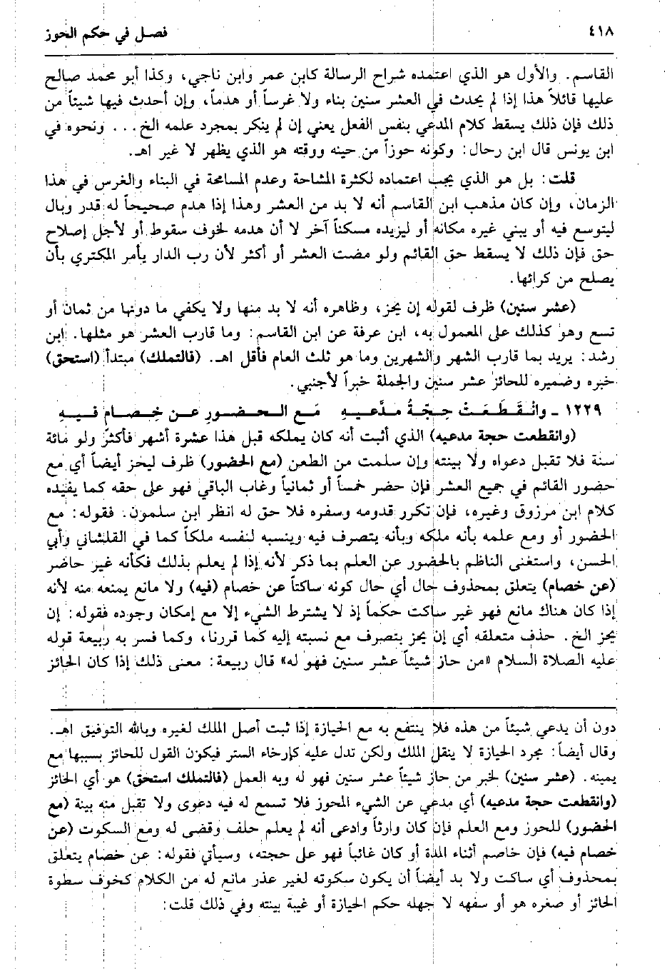 الْقَاسِم. وَالْأول هُوَ الَّذِي اعْتَمدهُ شرَّاح الرسَالَة كَابْن عمر وَابْن نَاجِي، وَكَذَا أَبُو مُحَمَّد صَالح عَلَيْهَا قَائِلا هَذَا إِذا لم يحدث فِي الْعشْر سِنِين بِنَاء وَلَا غرساً أَو هدماً، وَإِن أحدث فِيهَا شَيْئا من ذَلِك فَإِن ذَلِك يسْقط كَلَام الْمُدَّعِي بِنَفس الْفِعْل يَعْنِي إِن لم يُنكر بِمُجَرَّد علمه الخ ... وَنَحْوه فِي ابْن يُونُس قَالَ ابْن رحال: وَكَونه حوزاً من حِينه وَوَقته هُوَ الَّذِي يظْهر لَا غير اه. قلت: بل هُوَ الَّذِي يجب اعْتِمَاده لِكَثْرَة المشاحة وَعدم الْمُسَامحَة فِي الْبناء وَالْغَرْس فِي هَذَا الزَّمَان، وَإِن كَانَ مَذْهَب ابْن الْقَاسِم أَنه لَا بُد من الْعشْر وَهَذَا إِذا هدم صَحِيحا لَهُ قدر وبال ليتوسع فِيهِ أَو يَبْنِي غَيره مَكَانَهُ أَو ليزيده مسكنا آخر لَا أَن هَدمه لخوف سُقُوط أَو لأجل إصْلَاح حق فَإِن ذَلِك لَا يسْقط حق الْقَائِم وَلَو مَضَت الْعشْر أَو أَكثر لِأَن رب الدَّار يَأْمر الْمُكْتَرِي بِأَن يصلح من كرائها. (عشر سِنِين) ظرف لقَوْله إِن يحز، وَظَاهره أَنه لَا بُد مِنْهَا وَلَا يَكْفِي مَا دونهَا من ثَمَان أَو تسع وَهُوَ كَذَلِك على الْمَعْمُول بِهِ، ابْن عَرَفَة عَن ابْن الْقَاسِم: وَمَا قَارب الْعشْر هُوَ مثلهَا. ابْن رشد: يُرِيد بِمَا قَارب الشَّهْر والشهرين وَمَا هُوَ ثلث الْعَام فَأَقل اه. (فالتملك) مُبْتَدأ (اسْتحق) خَبره وضميره للحائز عشر سِنِين وَالْجُمْلَة خَبرا لأَجْنَبِيّ. وانْقَطَعَتْ حِجّةُ مدَّعيهِ مَع الحضورِ عَن خِصامٍ فيهِ (وانقطعت حجَّة مدعيه) الَّذِي أثبت أَنه كَانَ يملكهُ قبل هَذَا عشرَة أشهر فَأكْثر وَلَو مائَة سنة فَلَا تقبل دَعْوَاهُ وَلَا بَينته وَإِن سلمت من الطعْن (مَعَ الْحُضُور) ظرف ليحز أَيْضا أَي مَعَ حُضُور الْقَائِم فِي جَمِيع الْعشْر فَإِن حضر خمْسا أَو ثمانياً وَغَابَ الْبَاقِي فَهُوَ على حَقه كَمَا يفِيدهُ كَلَام ابْن مَرْزُوق وَغَيره، فَإِن تكَرر قدومه وسفره فَلَا حق لَهُ انْظُر ابْن سَلمُون. فَقَوله: مَعَ الْحُضُور أَو وَمَعَ علمه بِأَنَّهُ ملكه وَبِأَنَّهُ يتَصَرَّف فِيهِ وينسبه لنَفسِهِ ملكا كَمَا فِي القلشاني وَأبي الْحسن، وَاسْتغْنى النَّاظِم بالحضور عَن الْعلم بِمَا ذكر لِأَنَّهُ إِذا لم يعلم بذلك فَكَأَنَّهُ غير حَاضر (عَن خصام) يتَعَلَّق بِمَحْذُوف حَال أَي حَال كَونه ساكتاً عَن خصام (فِيهِ) وَلَا مَانع يمنعهُ مِنْهُ لِأَنَّهُ إِذا كَانَ هُنَاكَ مَانع فَهُوَ غير سَاكِت حكما إِذْ لَا يشْتَرط الشَّيْء إِلَّا مَعَ إِمْكَان وجوده فَقَوله: إِن يحز الخ. حذف مُتَعَلّقه أَي إِن يحز بِتَصَرُّف مَعَ نسبته إِلَيْهِ كَمَا قَررنَا، وكما فسر بِهِ ربيعَة قَوْله عَلَيْهِ الصَّلَاة السَّلَام (من حَاز شَيْئا عشر سِنِين فَهُوَ لَهُ) قَالَ ربيعَة: معنى ذَلِك إِذا كَانَ الْحَائِز