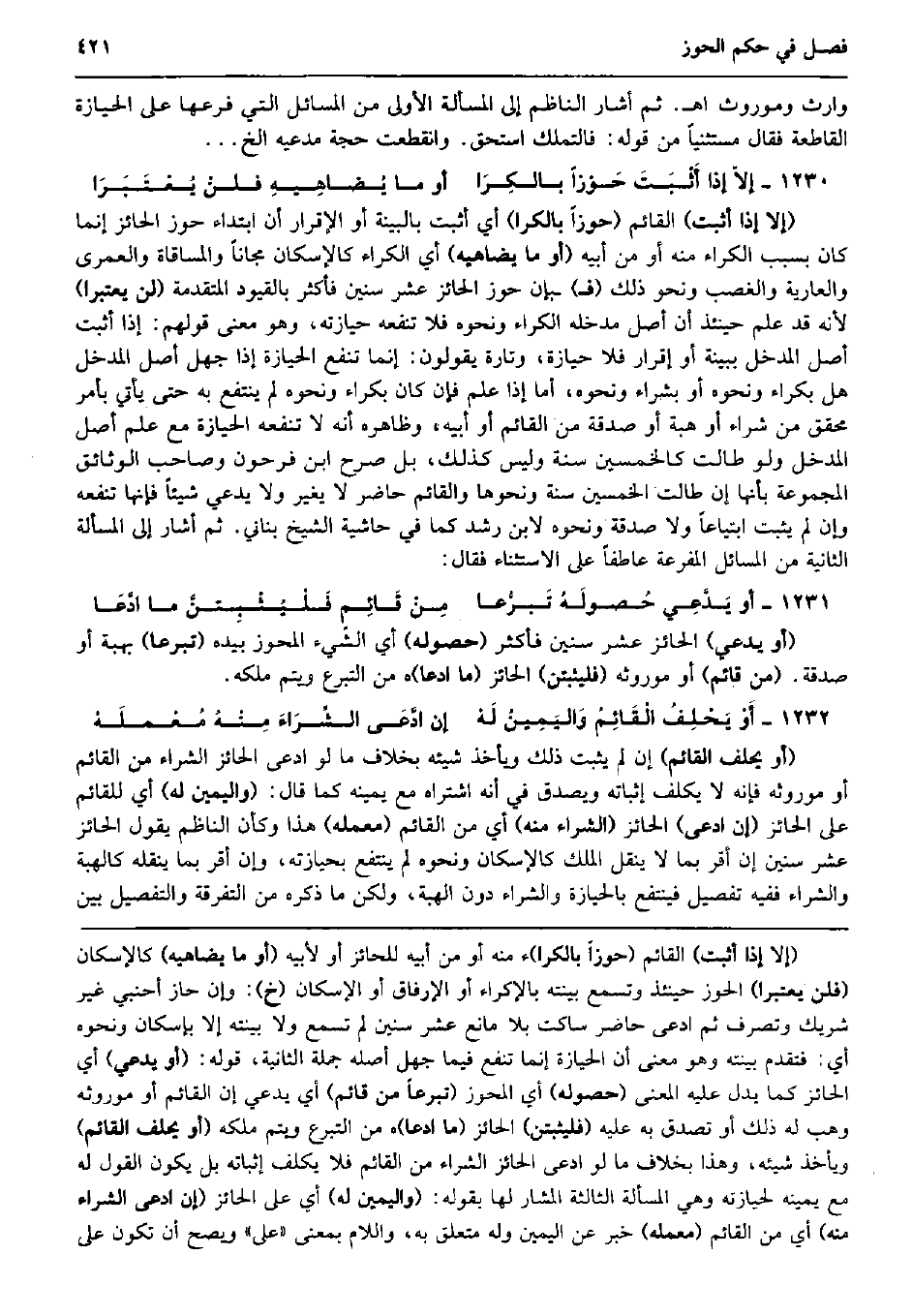 وَارِث وموروث اه. ثمَّ أَشَارَ النَّاظِم إِلَى الْمَسْأَلَة الأولى من الْمسَائِل الَّتِي فرعها على الْحِيَازَة القاطعة فَقَالَ مستثنياً من قَوْله: فالتملك اسْتحق. وانقطعت حجَّة مدعيه الخ ... إلاّ إِذا أَثْبَتَ حَوْزاً بالكِرَا أَو مَا يُضاهِيهِ فلنْ يُعْتَبَرَا (إِلَّا إِذا أثبت) الْقَائِم (حوزاً بالكرا) أَي أثبت بِالْبَيِّنَةِ أَو الْإِقْرَار أَن ابْتِدَاء حوز الْحَائِز إِنَّمَا كَانَ بِسَبَب الْكِرَاء مِنْهُ أَو من أَبِيه (أَو مَا يضاهيه) أَي الْكِرَاء كالإسكان مجَّانا وَالْمُسَاقَاة والعمرى وَالْعَارِية وَالْغَصْب وَنَحْو ذَلِك (ف) بإن حوز الْحَائِز عشر سِنِين فَأكْثر بالقيود الْمُتَقَدّمَة (لن يعتبرا) لِأَنَّهُ قد علم حِينَئِذٍ أَن أصل مدخله الْكِرَاء وَنَحْوه فَلَا تَنْفَعهُ حيازته، وَهُوَ معنى قَوْلهم: إِذا أثبت أصل الْمدْخل بِبَيِّنَة أَو إِقْرَار فَلَا حِيَازَة، وَتارَة يَقُولُونَ: إِنَّمَا تَنْفَع الْحِيَازَة إِذا جهل أصل الْمدْخل هَل بكرَاء وَنَحْوه أَو بشرَاء وَنَحْوه، أما إِذا علم فَإِن كَانَ بكرَاء وَنَحْوه لم ينْتَفع بِهِ حَتَّى يَأْتِي بِأَمْر مُحَقّق من شِرَاء أَو هبة أَو صَدَقَة من الْقَائِم أَو أَبِيه، وَظَاهره أَنه لَا تَنْفَعهُ الْحِيَازَة مَعَ علم أصل الْمدْخل وَلَو طَالَتْ كالخمسين سنة وَلَيْسَ كَذَلِك، بل صرح ابْن فَرِحُونَ وَصَاحب الوثائق الْمَجْمُوعَة بِأَنَّهَا إِن طَالَتْ الْخمسين سنة وَنَحْوهَا والقائم حَاضر لَا يُغير وَلَا يَدعِي شَيْئا فَإِنَّهَا تَنْفَعهُ وَإِن لم يثبت ابتياعاً وَلَا صَدَقَة وَنَحْوه لِابْنِ رشد كَمَا فِي حَاشِيَة الشَّيْخ بناني. ثمَّ أَشَارَ إِلَى الْمَسْأَلَة الثَّانِيَة من الْمسَائِل المفرعة عاطفاً على الِاسْتِثْنَاء فَقَالَ: أَو يَدَّعِي حُصولَهُ تَبرُّعا مِنْ قَائِمٍ فَلْيُثْبِتنَّ مَا ادَّعَا (أَو يَدعِي) الْحَائِز عشر سِنِين فَأكْثر (حُصُوله) أَي الشَّيْء المحوز بِيَدِهِ (تَبَرعا) بِهِبَة أَو صَدَقَة. (من قَائِم) أَو موروثه (فليثبتن) الْحَائِز (مَا ادعا) هـ من التَّبَرُّع وَيتم ملكه. أَوْ يَحْلِفُ الْقَائِمُ وَاليَمِينُ لَهْ إِن ادَّعَى الشِّرَاءَ مِنْهُ مُعْملَهْ (أَو يحلف الْقَائِم) إِن لم يثبت ذَلِك وَيَأْخُذ شَيْئه بِخِلَاف مَا لَو ادّعى الْحَائِز الشِّرَاء من الْقَائِم أَو موروثه فَإِنَّهُ لَا يُكَلف إثْبَاته وَيصدق فِي أَنه اشْتَرَاهُ مَعَ يَمِينه كَمَا قَالَ: (وَالْيَمِين لَهُ) أَي للقائم على الْحَائِز (إِن ادّعى) الْحَائِز (الشِّرَاء مِنْهُ) أَي من الْقَائِم (معمله) هَذَا وَكَأن النَّاظِم يَقُول الْحَائِز عشر سِنِين إِن أقرّ بِمَا لَا ينْقل الْملك كالإسكان وَنَحْوه لم ينْتَفع بحيازته، وَإِن أقرّ بِمَا يَنْقُلهُ كَالْهِبَةِ وَالشِّرَاء فَفِيهِ تَفْصِيل فينتفع بالحيازة وَالشِّرَاء دون الْهِبَة، وَلَكِن مَا ذكره من التَّفْرِقَة وَالتَّفْصِيل