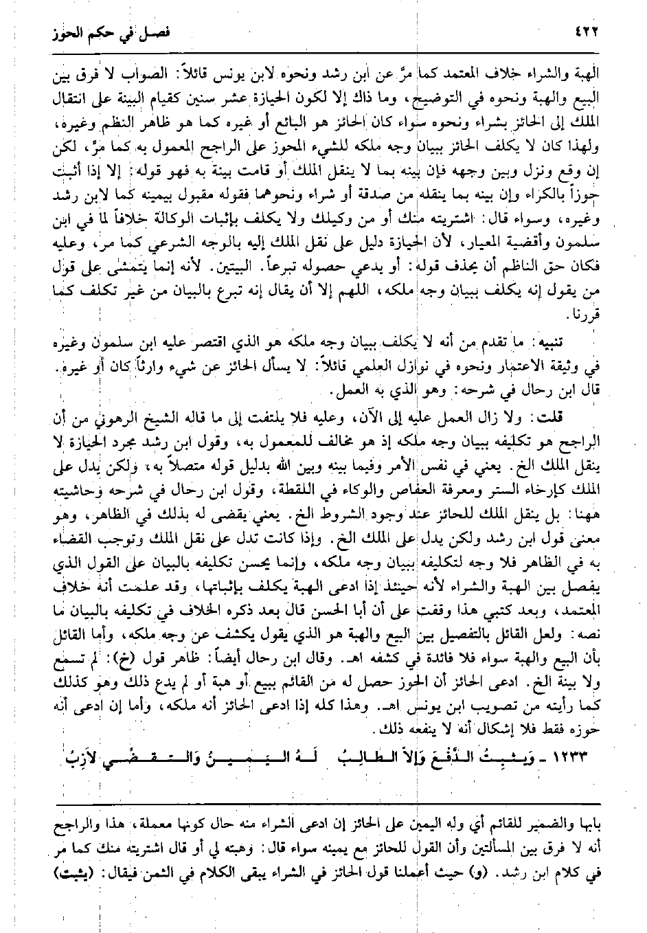 بَين الْهِبَة وَالشِّرَاء خلاف الْمُعْتَمد كَمَا مرَّ عَن ابْن رشد وَنَحْوه لِابْنِ يُونُس قَائِلا: الصَّوَاب لَا فرق بَين البيع وَالْهِبَة وَنَحْوه فِي التَّوْضِيح، وَمَا ذَاك إِلَّا لكَون الْحِيَازَة عشر سِنِين كقيام الْبَيِّنَة على انْتِقَال الْملك إِلَى الْحَائِز بشرَاء وَنَحْوه سَوَاء كَانَ الْحَائِز هُوَ البَائِع أَو غَيره كَمَا هُوَ ظَاهر النّظم وَغَيره، وَلِهَذَا كَانَ لَا يُكَلف الْحَائِز بِبَيَان وَجه ملكه للشَّيْء المحوز على الرَّاجِح الْمَعْمُول بِهِ كَمَا مرَّ، لَكِن إِن وَقع وَنزل وَبَين وَجهه فَإِن بَينه بِمَا لَا ينْقل الْملك أَو قَامَت بَيِّنَة بِهِ فَهُوَ قَوْله: إِلَّا إِذا أثبت حوزاً بالكراء وَإِن بَينه بِمَا يَنْقُلهُ من صَدَقَة أَو شِرَاء وَنَحْوهمَا فَقَوله مَقْبُول بِيَمِينِهِ كَمَا لِابْنِ رشد وَغَيره، وَسَوَاء قَالَ: اشْتَرَيْته مِنْك أَو من وكيلك وَلَا يُكَلف بِإِثْبَات الْوكَالَة خلافًا لما فِي ابْن سَلمُون وأقضية المعيار، لِأَن الْحِيَازَة دَلِيل على نقل الْملك إِلَيْهِ بِالْوَجْهِ الشَّرْعِيّ كَمَا مر، وَعَلِيهِ فَكَانَ حق النَّاظِم أَن يحذف قَوْله: أَو يَدعِي حُصُوله تَبَرعا. الْبَيْتَيْنِ. لِأَنَّهُ إِنَّمَا يتمشى على قَول من يَقُول إِنَّه يُكَلف بِبَيَان وَجه ملكه، اللَّهُمَّ إِلَّا أَن يُقَال إِنَّه تبرع بِالْبَيَانِ من غير تكلّف كَمَا قَررنَا. تَنْبِيه: مَا تقدم من أَنه لَا يُكَلف بِبَيَان وَجه ملكه هُوَ الَّذِي اقْتصر عَلَيْهِ ابْن سَلمُون وَغَيره فِي وَثِيقَة الاعتمار وَنَحْوه فِي نَوَازِل العلمي قَائِلا: لَا يسْأَل الْحَائِز عَن شَيْء وَارِثا كَانَ أَو غَيره. قَالَ ابْن رحال فِي شَرحه: وَهُوَ الَّذِي بِهِ الْعَمَل. قلت: وَلَا زَالَ الْعَمَل عَلَيْهِ إِلَى الْآن، وَعَلِيهِ فَلَا يلْتَفت إِلَى مَا قَالَه الشَّيْخ الرهوني من أَن الرَّاجِح هُوَ تَكْلِيفه بِبَيَان وَجه ملكه إِذْ هُوَ مُخَالف للمعمول بِهِ، وَقَول ابْن رشد مُجَرّد الْحِيَازَة لَا ينْقل الْملك الخ. يَعْنِي فِي نفس الْأَمر وَفِيمَا بَينه وَبَين الله بِدَلِيل قَوْله مُتَّصِلا بِهِ، وَلَكِن يدل على الْملك كإرخاء السّتْر وَمَعْرِفَة العفاص والوكاء فِي اللّقطَة، وَقَول ابْن رحال فِي شَرحه وحاشيته هَهُنَا: بل ينْقل الْملك للحائز عِنْد وجود الشُّرُوط الخ. يَعْنِي يقْضى لَهُ بذلك فِي الظَّاهِر، وَهُوَ معنى قَول ابْن رشد وَلَكِن يدل على الْملك الخ. وَإِذا كَانَت تدل على نقل الْملك وتوجب الْقَضَاء بِهِ فِي الظَّاهِر فَلَا وَجه لتكليفه بِبَيَان وَجه ملكه، وَإِنَّمَا يحسن تَكْلِيفه بِالْبَيَانِ على القَوْل الَّذِي يفصل بَين الْهِبَة وَالشِّرَاء لِأَنَّهُ حِينَئِذٍ إِذا ادّعى الْهِبَة يُكَلف بإثباتها، وَقد علمت أَنه خلاف الْمُعْتَمد، وَبعد كتبي هَذَا وقفت على أَن أَبَا الْحسن قَالَ بعد ذكره الْخلاف فِي تَكْلِيفه بِالْبَيَانِ مَا نَصه: وَلَعَلَّ الْقَائِل بالتفصيل بَين البيع وَالْهِبَة هُوَ الَّذِي يَقُول يكْشف عَن وَجه ملكه، وَأما الْقَائِل بِأَن البيع وَالْهِبَة سَوَاء فَلَا فَائِدَة فِي كشفه اه. وَقَالَ ابْن رحال أَيْضا: ظَاهر قَول (خَ) : لم تسمع وَلَا بَيِّنَة الخ. ادّعى الْحَائِز أَن الْحَوْز حصل لَهُ من الْقَائِم بِبيع أَو هبة أَو لم يدع ذَلِك وَهُوَ كَذَلِك كَمَا رَأَيْته من تصويب ابْن يُونُس اه. وَهَذَا كُله إِذا ادّعى الْحَائِز أَنه ملكه، وَأما إِن ادّعى أَنه حوزه فَقَط فَلَا إِشْكَال أَنه لَا يَنْفَعهُ ذَلِك. وَيثبِتُ الدَّفْعَ وَإلاّ الطالِبُ لَهُ اليَمينُ وَالتقضِّي لاَزِبُ