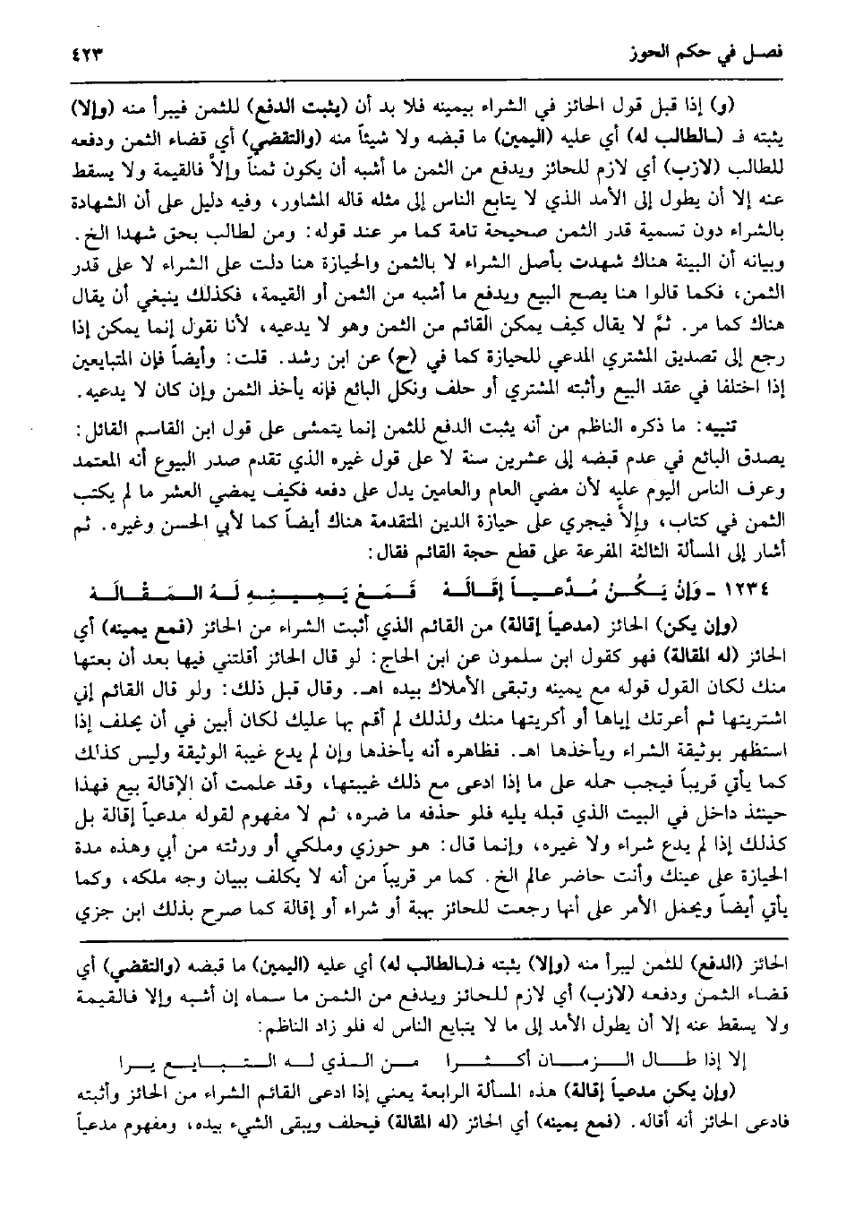 (و) إِذا قبل قَول الْحَائِز فِي الشِّرَاء بِيَمِينِهِ فَلَا بُد أَن (يثبت الدّفع) للثّمن فَيبرأ مِنْهُ (وَإِلَّا) يُثبتهُ ف (الطَّالِب لَهُ) أَي عَلَيْهِ (الْيَمين) مَا قَبضه وَلَا شَيْئا مِنْهُ (والتقضي) أَي قَضَاء الثّمن وَدفعه للطَّالِب (لازب) أَي لَازم للحائز وَيدْفَع من الثّمن مَا أشبه أَن يكون ثمنا وإلاَّ فَالْقيمَة وَلَا يسْقط عَنهُ إِلَّا أَن يطول إِلَى الأمد الَّذِي لَا يُتَابع النَّاس إِلَى مثله قَالَه المشاور، وَفِيه دَلِيل على أَن الشَّهَادَة بِالشِّرَاءِ دون تَسْمِيَة قدر الثّمن صَحِيحَة تَامَّة كَمَا مر عِنْد قَوْله: وَمن لطَالب بِحَق شَهدا الخ. وَبَيَانه أَن الْبَيِّنَة هُنَاكَ شهِدت بِأَصْل الشِّرَاء لَا بِالثّمن والحيازة هُنَا دلّت على الشِّرَاء لَا على قدر الثّمن، فَكَمَا قَالُوا هُنَا يَصح البيع وَيدْفَع مَا أشبه من الثّمن أَو الْقيمَة، فَكَذَلِك يَنْبَغِي أَن يُقَال هُنَاكَ كَمَا مر. ثمَّ لَا يُقَال كَيفَ يُمكن الْقَائِم من الثّمن وَهُوَ لَا يَدعِيهِ، لأَنا نقُول إِنَّمَا يُمكن إِذا رَجَعَ إِلَى تَصْدِيق المُشْتَرِي الْمُدَّعِي للحيازة كَمَا فِي (ح) عَن ابْن رشد. قلت: وَأَيْضًا فَإِن الْمُتَبَايعين إِذا اخْتلفَا فِي عقد البيع وأثبته المُشْتَرِي أَو حلف وَنكل البَائِع فَإِنَّهُ يَأْخُذ الثّمن وَإِن كَانَ لَا يَدعِيهِ. تَنْبِيه: مَا ذكره النَّاظِم من أَنه يثبت الدّفع للثّمن إِنَّمَا يتمشى على قَول ابْن الْقَاسِم الْقَائِل: يصدق البَائِع فِي عدم قَبضه إِلَى عشْرين سنة لَا على قَول غَيره الَّذِي تقدم صدر الْبيُوع أَنه الْمُعْتَمد وَعرف النَّاس الْيَوْم عَلَيْهِ لِأَن مُضِيّ الْعَام والعامين يدل على دَفعه فَكيف يمْضِي الْعشْر مَا لم يكْتب الثّمن فِي كتاب، وإِلاَّ فَيجْرِي على حِيَازَة الدّين الْمُتَقَدّمَة هُنَاكَ أَيْضا كَمَا لأبي الْحسن وَغَيره. ثمَّ أَشَارَ إِلَى الْمَسْأَلَة الثَّالِثَة المفرعة على قطع حجَّة الْقَائِم فَقَالَ: وَإنْ يَكُنْ مُدَّعياً إقَالَهْ فَمَعْ يَمِينِهِ لَهُ المَقْالَهْ (وَإِن يكن) الْحَائِز (مُدعيًا إِقَالَة) من الْقَائِم الَّذِي أثبت الشِّرَاء من الْحَائِز (فَمَعَ يَمِينه) أَي الْحَائِز (لَهُ الْمقَالة) فَهُوَ كَقَوْل ابْن سَلمُون عَن ابْن الْحَاج: لَو قَالَ الْحَائِز أقلتني فِيهَا بعد أَن بعتها مِنْك لَكَانَ القَوْل قَوْله مَعَ يَمِينه وَتبقى الْأَمْلَاك بِيَدِهِ اه. وَقَالَ قبل ذَلِك: وَلَو قَالَ الْقَائِم إِنِّي اشْتَرَيْتهَا ثمَّ أعرتك إِيَّاهَا أَو أكريتها مِنْك وَلذَلِك لم أقِم بهَا عَلَيْك لَكَانَ أبين فِي أَن يحلف إِذا استظهر بوثيقة الشِّرَاء ويأخذها اه. فَظَاهره أَنه يَأْخُذهَا وَإِن لم يدع غيبَة الْوَثِيقَة وَلَيْسَ كَذَلِك كَمَا يَأْتِي قَرِيبا فَيجب حمله على مَا إِذا ادّعى مَعَ ذَلِك غيبتها، وَقد علمت أَن الْإِقَالَة بيع فَهَذَا حِينَئِذٍ دَاخل فِي الْبَيْت الَّذِي قبله يَلِيهِ فَلَو حذفه مَا ضره، ثمَّ لَا مَفْهُوم لقَوْله مُدعيًا إِقَالَة بل كَذَلِك إِذا لم يدع شِرَاء وَلَا غَيره، وَإِنَّمَا قَالَ: هُوَ حوزي وملكي أَو ورثته من أبي وَهَذِه مُدَّة الْحِيَازَة على عَيْنك وَأَنت حَاضر عَالم الخ. كَمَا مر قَرِيبا من أَنه لَا يُكَلف بِبَيَان وَجه ملكه، وكما يَأْتِي أَيْضا وَيحمل الْأَمر على أَنَّهَا رجعت للحائز بِهِبَة أَو شِرَاء أَو إِقَالَة كَمَا صرح بذلك ابْن جزي