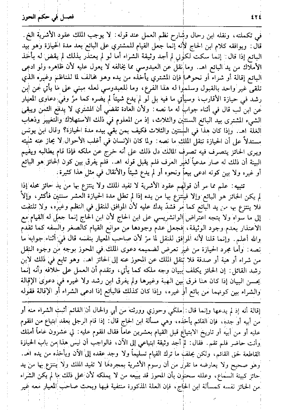 فِي تكملته، وَنَقله ابْن رحال وشارح نظم الْعَمَل عِنْد قَوْله: لَا يُوجب الْملك عُقُود الأشرية الخ. قَالَ: وَيُوَافِقهُ كَلَام ابْن الْحَاج لِأَنَّهُ إِنَّمَا جعل الْقيام للْمُشْتَرِي على البَائِع بعد مُدَّة الْحِيَازَة وَهُوَ بيد البَائِع إِذا قَالَ: إِنَّمَا سكت لكوني لم أجد وَثِيقَة الشِّرَاء أما لَو لم يعْتَذر بذلك لم يقْض لَهُ بِأخذ الْأَمْلَاك من يَد البَائِع اه. وَمَا نقل عَن العبدوسي مِمَّا يُخَالِفهُ لَا يعول عَلَيْهِ لِأَن ظَاهره وَلَو ادّعى البَائِع إِقَالَة أَو شِرَاء أَو نَحْوهمَا فَإِن المُشْتَرِي يَأْخُذهُ من يَده وَهُوَ مُخَالف لما للناظم وَغَيره الَّذِي تلقى غير وَاحِد بِالْقبُولِ وسلموا لَهُ هَذَا الْفَرْع، وَمَا للعبدوسي لَعَلَّه مَبْنِيّ على مَا يَأْتِي عَن ابْن رشد فِي حِيَازَة الْأَقَارِب، وَسَيَأْتِي مَا فِيهِ بل لَو لم يدع شَيْئا لم يضرّهُ كَمَا مرَّ وَفِي دعاوى المعيار عَن ابْن لب قَالَ فِي أثْنَاء جَوَاب لَهُ مَا نَصه: وَلِأَن الْعَادة تقضي أَن المُشْتَرِي لَا يدْفع الثّمن وَيبقى الشَّيْء الْمُشْتَرى بيد البَائِع السنتين وَالثَّلَاث، إِذْ من الْمَعْلُوم فِي ذَلِك الِاسْتِهْلَاك والتغيير وَذَهَاب الْغلَّة اه. وَإِذا كَانَ هَذَا فِي السنتين وَالثَّلَاث فَكيف بِمن بَقِي بِيَدِهِ مُدَّة الْحِيَازَة؟ وَقَالَ ابْن يُونُس مستدلاً على أَن الْحِيَازَة تنقل الْملك مَا نَصه: وَلما كَانَ الْإِنْسَان فِي أغلب الْأَحْوَال لَا يحاز عَنهُ شَيْئه وَيرى الْحَائِز يتَصَرَّف فِيهِ تصرف الْمَالِك دلّ ذَلِك على أَنه خرج عَن ملكه فَإِذا قَامَ يُطَالِبهُ وَيُقِيم الْبَيِّنَة أَن ذَلِك لَهُ صَار مُدعيًا لغير الْعرف فَلم يقبل قَوْله اه. فَلم يفرق بَين كَون الْحَائِز هُوَ البَائِع أَو غَيره وَلَا بَين كَونه ادّعى بيعا وَنَحْوه أَو لم يدع شَيْئا والأنقال فِي مثل هَذَا كَثِيرَة. تَنْبِيه: علم مِمَّا مر أَن قَوْلهم عُقُود الأشرية لَا تفِيد الْملك وَلَا ينتزع بهَا من يَد حائز مَحَله إِذا لم يكن الْحَائِز هُوَ البَائِع وَإِلَّا فينتزع بهَا من يَده إِذا لم تطل مُدَّة الْحِيَازَة الْعشْر سنتَيْن فَأكْثر، وإلاَّ فَلَا ينتزع بهَا من يَد البَائِع كَمَا مر فشدّ يدك عَلَيْهِ لِأَن الْمُوَافق للنَّقْل فِي النّظم وَغَيره، وَلَا تلْتَفت إِلَى مَا سواهُ وَلَا يتَّجه اعْتِرَاض الوانشريسي على ابْن الْحَاج لِأَن ابْن الْحَاج إِنَّمَا جعل لَهُ الْقيام مَعَ الِاعْتِذَار بِعَدَمِ وجود الْوَثِيقَة، فَجعل عدم وجودهَا من مَوَانِع الْقيام كالصغر والسفه كَمَا تقدم وَالله أعلم. وَإِنَّمَا قُلْنَا لِأَنَّهُ الْمُوَافق للنَّقْل لما مرّ لِأَن صَاحب المعيار بِنَفسِهِ قَالَ فِي أثْنَاء جَوَابه مَا نَصه: وَأما مُجَرّد الْحِيَازَة من غير تعرض لضميمه دَعْوَى الْملك فِي المحوز بِوَجْه من وُجُوه النَّقْل من شِرَاء أَو هبة أَو صَدَقَة فَلَا تنقل الْملك عَن المحوز عَنهُ إِلَى الْحَائِز اه. وَهُوَ تَابع فِي ذَلِك لِابْنِ رشد الْقَائِل: إِن الْحَائِز يُكَلف بِبَيَان وَجه ملكه كَمَا يَأْتِي، وَتقدم أَن الْعَمَل على خِلَافه وَأَنه إِنَّمَا يحسن الْبَيَان إِذا كَانَ هُنَا فرق بَين الْهِبَة وَغَيرهَا وَلم يفرق ابْن رشد وَلَا غَيره فِي دَعْوَى الْإِقَالَة وَالشِّرَاء بَين كَونهمَا من بَائِع أَو غَيره، وَإِذا كَانَ كَذَلِك فالبائع إِذا ادّعى الشِّرَاء أَو الْإِقَالَة فَقَوله